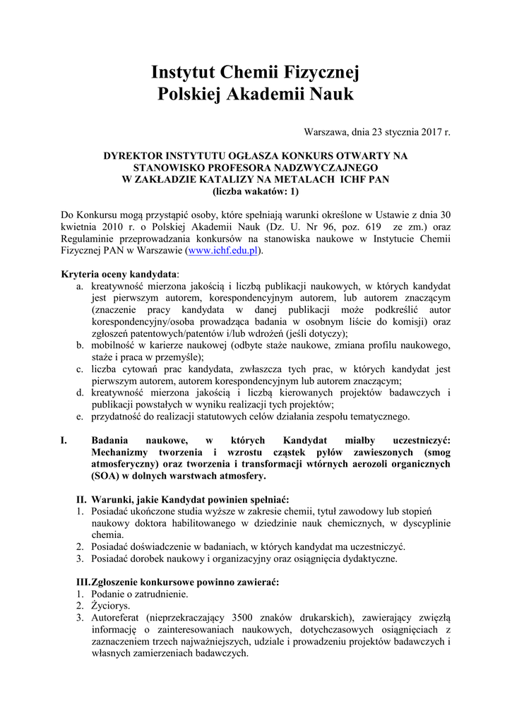 Instytut Chemii Fizycznej Polskiej Akademii Nauk Warszawa, dnia 23 stycznia 2017 r. DYREKTOR INSTYTUTU OGŁASZA KONKURS OTWARTY NA STANOWISKO PROFESORA NADZWYCZAJNEGO W ZAKŁADZIE KATALIZY NA METALACH ICHF PAN (liczba wakatów: 1) Do Konkursu mogą przystąpić osoby, które spełniają warunki określone w Ustawie z dnia 30 kwietnia 2010 r. o Polskiej Akademii Nauk (Dz. U. Nr 96, poz. 619 ze zm.) oraz Regulaminie przeprowadzania konkursów na stanowiska naukowe w Instytucie Chemii Fizycznej PAN w Warszawie (www.ichf.edu.pl). Kryteria oceny kandydata: a. kreatywność mierzona jakością i liczbą publikacji naukowych, w których kandydat jest pierwszym autorem, korespondencyjnym autorem, lub autorem znaczącym (znaczenie pracy kandydata w danej publikacji może podkreślić autor korespondencyjny/osoba prowadząca badania w osobnym liście do komisji) oraz zgłoszeń patentowych/patentów i/lub wdrożeń (jeśli dotyczy); b. mobilność w karierze naukowej (odbyte staże naukowe, zmiana profilu naukowego, staże i praca w przemyśle); c. liczba cytowań prac kandydata, zwłaszcza tych prac, w których kandydat jest pierwszym autorem, autorem korespondencyjnym lub autorem znaczącym; d. kreatywność mierzona jakością i liczbą kierowanych projektów badawczych i publikacji powstałych w wyniku realizacji tych projektów; e. przydatność do realizacji statutowych celów działania zespołu tematycznego. I. Badania naukowe, w których Kandydat miałby uczestniczyć: Mechanizmy tworzenia i wzrostu cząstek pyłów zawieszonych (smog atmosferyczny) oraz tworzenia i transformacji wtórnych aerozoli organicznych (SOA) w dolnych warstwach atmosfery. II. Warunki, jakie Kandydat powinien spełniać: 1. Posiadać ukończone studia wyższe w zakresie chemii, tytuł zawodowy lub stopień naukowy doktora habilitowanego w dziedzinie nauk chemicznych, w dyscyplinie chemia. 2. Posiadać doświadczenie w badaniach, w których kandydat ma uczestniczyć. 3. Posiadać dorobek naukowy i organizacyjny oraz osiągnięcia dydaktyczne. III. Zgłoszenie konkursowe powinno zawierać: 1. Podanie o zatrudnienie. 2. Życiorys. 3. Autoreferat (nieprzekraczający 3500 znaków drukarskich), zawierający zwięzłą informację o zainteresowaniach naukowych, dotychczasowych osiągnięciach z zaznaczeniem trzech najważniejszych, udziale i prowadzeniu projektów badawczych i własnych zamierzeniach badawczych. Skan bądź kserokopię dyplomu ukończenia studiów wyższych. Skan bądź kserokopię dyplomu nadania stopnia naukowego. Skan bądź kserokopię dyplomu uzyskania tytułu naukowego (jeśli dotyczy). Spis publikacji z zaznaczeniem maksymalnie pięciu najważniejszych prac wykonanych w okresie ostatnich 5 lat pracy naukowej kandydata (po odliczeniu przerw w pracy naukowej), zgłoszeń patentowych, patentów, wdrożeń, projektów badawczych. 8. Informację o liczbie cytowań publikacji bez auto-cytowań, wartości indeksu h oraz liczbie lat efektywnie przepracowanych w nauce (po odliczeniu przerw). 9. Informacje o przerwach w wykonywaniu pracy naukowej np. urlop macierzyński, staż w przemyśle itd. Przy ocenie dorobku Kandydata Komisja Konkursowa uwzględni przerwy w pracy naukowej i wskazany dorobek Kandydata przeliczy na efektywne lata pracy naukowej. 10. Listę projektów badawczych (aplikacyjnych, wdrożeniowych), którymi kandydat kierował lub był głównym wykonawcą oraz 1-3 najważniejsze publikacje będące wynikiem realizacji tego projektu, lub inne wymierne rezultaty projektu. 11. Przynajmniej jedną opinię o Kandydacie, wystawioną przez samodzielnego pracownika naukowego, specjalisty w zakresie chemii środowiska. 12. Zgodę na przetwarzanie danych osobowych Kandydata dla potrzeb Konkursu (Załącznik 1). 13. Oświadczenie Kandydata o zapoznaniu się z Regulaminem przeprowadzania konkursów na stanowiska naukowe w Instytucie Chemii Fizycznej PAN w Warszawie. 4. 5. 6. 7. W ramach postępowania konkursowego Kandydaci mogą być proszeni o publiczną prezentację wyników swoich dotychczasowych prac w formie seminarium w IChF PAN i/lub dodatkowe wyjaśnienia. IV. Zgłoszenia na Konkurs należy przesłać na adres e-mail: [email protected] i/lub na adres: Instytut Chemii Fizycznej PAN ul. Kasprzaka 44/52, 01-224 Warszawa z dopiskiem na kopercie: „Konkurs na stanowisko profesora nadzwyczajnego w Zakładzie Katalizy na Metalach”. Termin składania dokumentów upływa w dniu 23 lutego 2017 o godz. 23:59 Konkurs zostanie rozstrzygnięty do dnia dniu 16 marca 2017 V. Zatrudnienie odbędzie się zgodnie z przepisami Kodeksu Pracy na czas nieokreślony. VI. W szczególnych przypadkach istnieje możliwość przyznania miejsca w pokojach gościnnych Instytutu. Dyrektor Instytutu Chemii Fizycznej PAN w Warszawie 2 Załącznik 1 ……………………………………………………………….. imię i nazwisko ………………………………………. miejscowość data ........................................................................ Adres ....................................................................... nr telefonu kontaktowego OŚWIADCZENIE Oświadczam, że wyrażam zgodę na gromadzenie i przetwarzanie moich danych osobowych przez Instytut Chemii Fizycznej PAN, 01-224 Warszawa, Kasprzaka 44/52 organizatora konkursu na stanowisko naukowe i tylko na cele w/w konkursu (zgodnie z ustawa z dnia 29 sierpnia 1997 r. o ochronie danych osobowych, Dz.U. 1997 Nr 133, poz. 883 z późn. zm.). ……………………………………… Czytelny podpis Jednocześnie oświadczam, że zgodnie z art. 24 ustawy o ochronie danych osobowych zostałam/em poinformowana/y, że: administratorem danych będzie Instytut Chemii Fizycznej Polskiej Akademii Nauk z siedziba w Warszawie przy ul. Kasprzaka 44/52 − przekazane dane osobowe wykorzystane będą do realizacji w/w konkursu. − przekazanie wyżej wskazanych danych jest dobrowolne, aczkolwiek niezbędne do załatwienia sprawy; − przysługuj