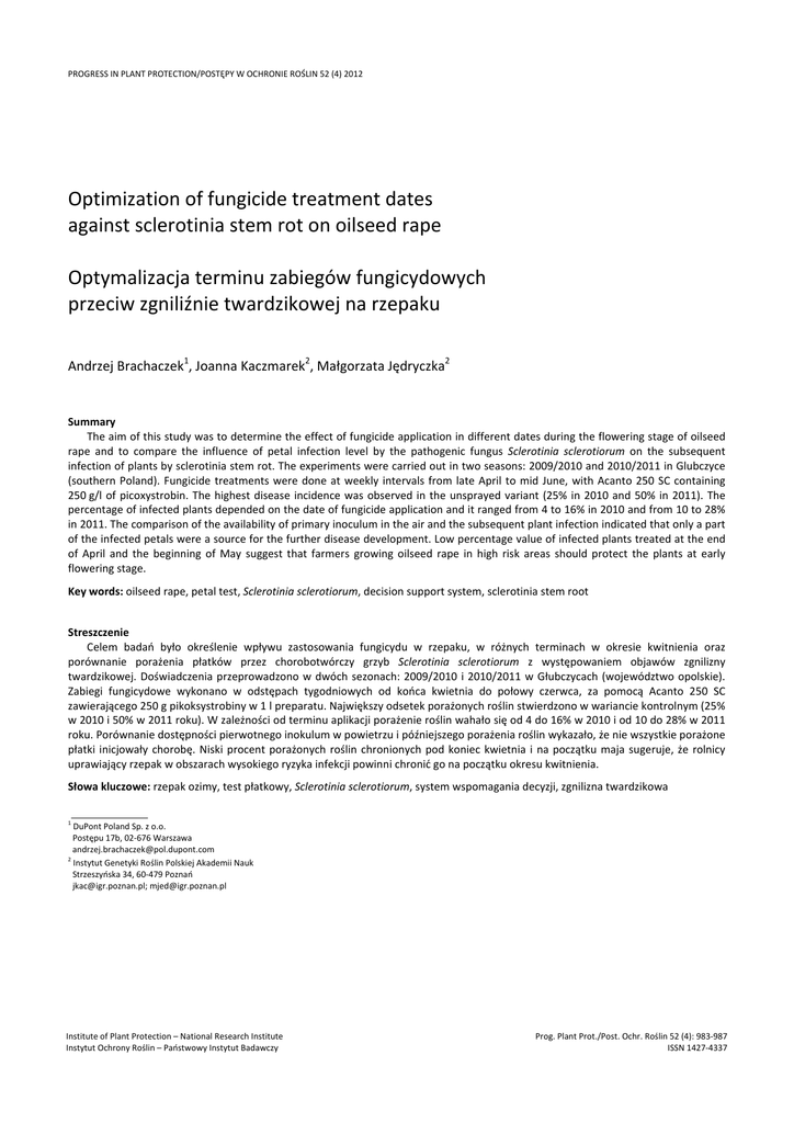 PROGRESS IN PLANT PROTECTION/POSTĘPY W OCHRONIE ROŚLIN 52 (4) 2012 Optimization of fungicide treatment dates against sclerotinia stem rot on oilseed rape Optymalizacja terminu zabiegów fungicydowych przeciw zgniliźnie twardzikowej na rzepaku Andrzej Brachaczek1, Joanna Kaczmarek2, Małgorzata Jędryczka2 Summary The aim of this study was to determine the effect of fungicide application in different dates during the flowering stage of oilseed rape and to compare the influence of petal infection level by the pathogenic fungus Sclerotinia sclerotiorum on the subsequent infection of plants by sclerotinia stem rot. The experiments were carried out in two seasons: 2009/2010 and 2010/2011 in Glubczyce (southern Poland). Fungicide treatments were done at weekly intervals from late April to mid June, with Acanto 250 SC containing 250 g/l of picoxystrobin. The highest disease incidence was observed in the unsprayed variant (25% in 2010 and 50% in 2011). The percentage of infected plants depended on the date of fungicide application and it ranged from 4 to 16% in 2010 and from 10 to 28% in 2011. The comparison of the availability of primary inoculum in the air and the subsequent plant infection indicated that only a part of the infected petals were a source for the further disease development. Low percentage value of infected plants treated at the end of April and the beginning of May suggest that farmers growing oilseed rape in high risk areas should protect the plants at early flowering stage. Key words: oilseed rape, petal test, Sclerotinia sclerotiorum, decision support system, sclerotinia stem root Streszczenie Celem badań było określenie wpływu zastosowania fungicydu w rzepaku, w różnych terminach w okresie kwitnienia oraz porównanie porażenia płatków przez chorobotwórczy grzyb Sclerotinia sclerotiorum z występowaniem objawów zgnilizny twardzikowej. Doświadczenia przeprowadzono w dwóch sezonach: 2009/2010 i 2010/2011 w Głubczycach (województwo opolskie). Zabiegi fungicydowe wykonano w odstępach tygodniowych od końca kwietnia do połowy czerwca, za pomocą Acanto 250 SC zawierającego 250 g pikoksystrobiny w 1 l preparatu. Największy odsetek porażonych roślin stwierdzono w wariancie kontrolnym (25% w 2010 i 50% w 2011 roku). W zależności od terminu aplikacji porażenie roślin wahało się od 4 do 16% w 2010 i od 10 do 28% w 2011 roku. Porównanie dostępności pierwotnego inokulum w powietrzu i późniejszego porażenia roślin wykazało, że nie wszystkie porażone płatki inicjowały chorobę. Niski procent porażonych roślin chronionych pod koniec kwietnia i na początku maja sugeruje, że rolnicy uprawiający rzepak w obszarach wysokiego ryzyka infekcji powinni chronić go na początku okresu kwitnienia. Słowa kluczowe: rzepak ozimy, test płatkowy, Sclerotinia sclerotiorum, system wspomagania decyzji, zgnilizna twardzikowa 1 DuPont Poland Sp. z o.o. Postępu 17b, 02-676 Warszawa [email protected] 2 Instytut Genetyki Roślin Polskiej Akademii Nauk Strzeszyńska 34, 60-479 Poznań [email protected]; [email protected] Institute of Plant Protection – National Research Institute Instytut Ochrony Roślin – Państwowy Instytut Badawczy Prog. Plant Prot./Post. Ochr. Roślin 52 (4): 983-987 ISSN 1427-4337 984 Optimization of fungicide treatments against S. sclerotiorum / Optymalizacja zabiegów przeciwko S. sclerotiorum Wstęp / Introduction Zgnilizna twardzikowa jest jedną z najgroźniejszych chorób rzepaku (Starzycki i Starzycka 1999; Mrówczyński i wsp. 2008). Powodowana jest przez grzyb Sclerotinia sclerotiorum (Lib.) de Bary. Patogen ten występuje powszechnie w Polsce i na świecie, ale szczególnie często jego obecność jest stwierdzana w rejonach o dużym udziale rzepaku w strukturze zasiewów oraz na terenach o zwiększonej wilgotności (Paul 1988). Porażenie roślin następuje w okresie kwitnienia; w tym czasie w owocnikach zwanych apotecjami tworzone są zarodniki grzyba, które przenoszone są z wiatrem, a następnie osiadają na roślinach, w tym głównie na płatkach kwiatowych (Purdy 1979). Główną mikotoksyną S. sclerotiorum jest kwas szczawiowy blokujący prawidłowe przemiany wapnia Ca++ oraz magnezu Mg++ (Noyes i Hancock 1981; Starzycka i wsp. 2002). Ograniczeniu choroby sprzyjają metody agrotechniczne, uprawa odmian o większej odporności (Bardin i Huang 2001; Rimmer i wsp. 2007), a także stosowanie zabiegów fungicydowych (Jajor i wsp. 2008). W Polsce ochrona przed zgnilizną twardzikową opiera się na stosowaniu fungicydów, ale wybór właściwego terminu wykonania zabiegu w zależności od aktualnego poziomu inokulum pierwotnego jest nadal niemożliwy ze względu na brak systemu wspomagania decyzji. Okres kwitnienia rzepaku trwa od 3 do 6 tygodni. Długość działania standardowo stosowanych fungicydów triazolowych jest uzależniona od dawki i wielkości biomasy; zwykle nie przekracza 3 tygodni. Wszystkie fungicydy mają bardzo ograniczone działanie lecznicze, a środki grzybobójcze aplikowane zbyt późno nie spełniają swej roli. Z kolei środki triazolowe stosowane zbyt wcześnie mogą nie objąć swoją osłoną dostatecznie długiego okresu infekcji. Celem badań było określenie optymalnego terminu aplikacji fungicydu z chemicznej grupy strobiluryn, o wydłużonym działaniu profilaktycznym, w relacji do wyników testu płatkowego, wskazującego na procent porażonych płatków rzepaku, a więc natężenie inokulum patogenu w danym punkcie czasowym. Materiały i metody / Materials and methods Badania wykonano w sezonach 2009/2010 oraz 2010/2011 w Stacji Doświadczalnej Oceny Odmian w Głubczycach (województwo opolskie) na poletkach rzepakiem ozimym odmiany mieszańcowej PR46W31 (Pioneer Hi-Bred). Doświadczenie polowe założono w układzie bloków losowanych całkowicie zrandomizowanych, na poletkach o powierzchni 15 m2, w trzech powtórzeniach. Nasiona wysiano 27 sierpnia 2009 oraz 25 sierpnia 2010 roku, stosuj