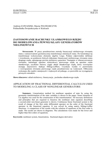 Słowa kluczowe: układ nieliniowy, linearyzacja, pochodna ułamkowego rzędu