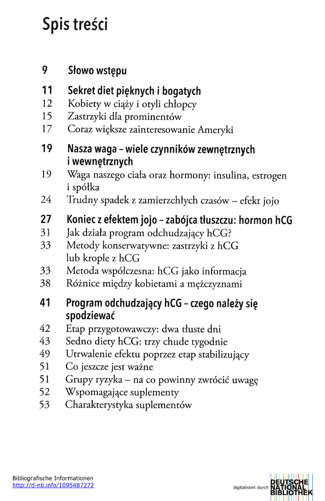 Spis treSci 9 Słowo wstępu 1 1 1 2 1 5 1 7 1 9 1 9 2 4 2 7 3 1 3 3 3 3 3 8 4 1 4 2 4 3 4 9 5 1 5 1 5 2 5 3 Sekret diet pięknych Í bogatych Kobiety w ciąży i Otyli chłopcy Zastrzyki dla prominentów Coraz większe zainteresowanie Ameryki Nasza waga ~ wiele aynoikow zewnętrznych ¡wewnętrznych Waga naszego ciała oraz hormony: insulina,estrogen i spóỉka Trudny spadek z zamierzchłych czasów —efekt jojo Koniec I efektem ل〇 ل〇 ٠٠ zabójca tłuszczu: hormon hCG Jak działa program odchudzający hCG? Metody konserwatywne :zastrzyki z hCG lub krople z hCG Metoda współczesna: h C u jako informacja Różnicę między kobietami a mężczyznami Program odchudzający hCG - czego należy się spodziewać’ Etap przygotowawczy: dwa tłuste dni Sedno diety hCG: trzy chude tygodnie Utrwalenie efektu poprzez etap stabilizujący Co jeszcze jest ważne Grupy ryzyka - na co powinny zwrócić uwag؟ Wspomagające suplementy Charakterystyka suplementów 59 64 66 70 74 Słowo o aminokwasach - substancjach budulcowych życia Zakwaszenie,zdrowie i waga Psychika i motywacja podczas programu odchudzającego hCG Opinie krytyczne o programie odchudzającym hCG Opis doświadczeń osób,które przeszły program odchudzający hCG 85 Najczęściej zadawane pytana ◎kurację hCG 85 88 99 100 Pytania Pytania Pytania Pytania ogólne o kurację hCG odnośnie sedna diety hCG o etap stabilizujący o czas po kuracji 101 13 najczęstszych trudności Praktyka-krok po kroku 107 Planowanie 107 109 Lista: sprawy do zrobienia Co powinieneś mieć w domu - pierwsza LISTA ZAKUPÓW 113 Etap przygotowawczy - dwa dni rozpusty 113 115 117 Jedzenie w czasie etapu przygotowawczego Nazywanie kropli Przykładowy przebieg dnia 119 Etap diety - 21 dni, każdy po 500 kalorii 119 129 139 140 Odpowiednie produkty Pierwsze trzy dni diety - druga LISTA ZAKUPÓW Nieprzewidziane grzeszki oraz głód Ostatnie cztery dni pierwszego tygodnia diety - trzecia 154 LISTA ZAKUPÓW Inne przepisy —drugi i trzeci tydzień etapu diety 185 Etap stabilizujący ٠21 dni € وااzachoinÎa êfektów 187 Koniec diety -o k rzy k hura! zamiast efektu JOJO 191 Załączniki 191 192 193 197 199 Tabela cyników —wymiary ciała Tabela wynikow —waga ciała Tabela kalorii Wazna informacja: globulki o wysokich potencjach Przydatne linki 1 polecana literatura