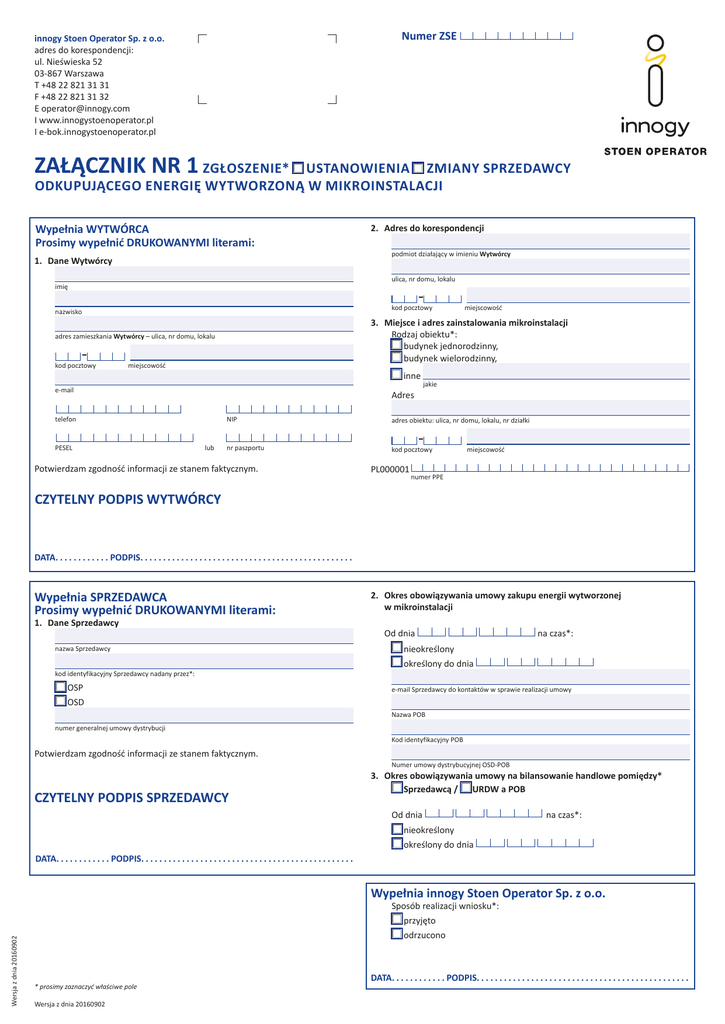 Numer ZSE innogy Stoen Operator Sp. z o.o. adres do korespondencji: ul. Nieświeska 52 03-867 Warszawa T +48 22 821 31 31 F +48 22 821 31 32 E [email protected] I www.innogystoenoperator.pl I e-bok.innogystoenoperator.pl ZAŁĄCZNIK NR 1 ZGŁOSZENIE* USTANOWIENIA ZMIANY SPRZEDAWCY ODKUPUJĄCEGO ENERGIĘ WYTWORZONĄ W MIKROINSTALACJI Wypełnia WYTWÓRCA Prosimy wypełnić DRUKOWANYMI literami: 1. Dane Wytwórcy imię 2. Adres do korespondencji podmiot działający w imieniu Wytwórcy ulica, nr domu, lokalu nazwisko miejscowość inne jakie e-mail telefon miejscowość 3. Miejsce i adres zainstalowania mikroinstalacji Rodzaj obiektu*: budynek jednorodzinny, budynek wielorodzinny, adres zamieszkania Wytwórcy – ulica, nr domu, lokalu kod pocztowy kod pocztowy Adres PESEL NIP lub nr paszportu Potwierdzam zgodność informacji ze stanem faktycznym. adres obiektu: ulica, nr domu, lokalu, nr działki kod pocztowy PL000001 miejscowość numer PPE CZYTELNY PODPIS WYTWÓRCY DATA. . . . . . . . . . . . PODPIS. . . . . . . . . . . . . . . . . . . . . . . . . . . . . . . . . . . . . . . . . . . . . . . Wypełnia SPRZEDAWCA Prosimy wypełnić DRUKOWANYMI literami: 1. Dane Sprzedawcy nazwa Sprzedawcy 2. Okres obowiązywania umowy zakupu energii wytworzonej w mikroinstalacji kod identyfikacyjny Sprzedawcy nadany przez*: OSP OSD Od dnia na czas*: nieokreślony określony do dnia e-mail Sprzedawcy do kontaktów w sprawie realizacji umowy Nazwa POB Kod identyfikacyjny POB Numer umowy dystrybucyjnej OSD-POB Od dnia numer generalnej umowy dystrybucji Potwierdzam zgodność informacji ze stanem faktycznym. CZYTELNY PODPIS SPRZEDAWCY 3. Okres obowiązywania umowy na bilansowanie handlowe pomiędzy* Sprzedawcą / URDW a POB na czas*: nieokreślony określony do dnia DATA. . . . . . . . . . . . PODPIS. . . . . . . . . . . . . . . . . . . . . . . . . . . . . . . . . . . . . . . . . . . . . . . Wersja z dnia 20160902 Wypełnia innogy Stoen Operator Sp. z o.o. Sposób realizacji wniosku*: przyjęto odrzucono * prosimy zaznaczyć właściwe pole Wersja z dnia 20160902 DATA. . . . . . . . . . . . PODPIS. . . . . . . . . . . . . . . . . . . . . . . . . . . . . . . . . . . . . . . . . . . . . . .