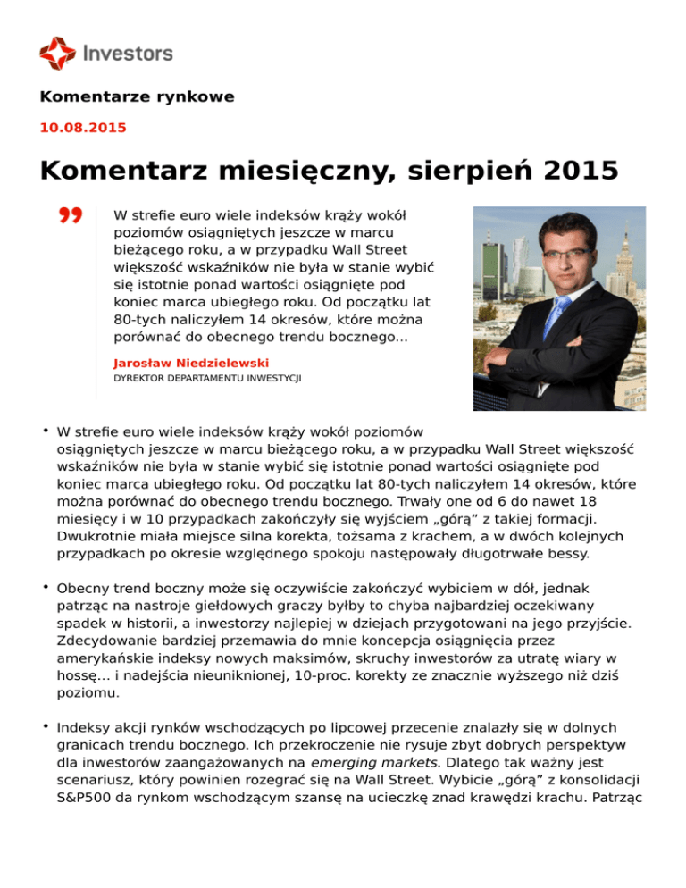 Komentarze rynkowe 10.08.2015 Komentarz miesięczny, sierpień 2015 W strefie euro wiele indeksów krąży wokół poziomów osiągniętych jeszcze w marcu bieżącego roku, a w przypadku Wall Street większość wskaźników nie była w stanie wybić się istotnie ponad wartości osiągnięte pod koniec marca ubiegłego roku. Od początku lat 80-tych naliczyłem 14 okresów, które można porównać do obecnego trendu bocznego... Jarosław Niedzielewski DYREKTOR DEPARTAMENTU INWESTYCJI • W strefie euro wiele indeksów krąży wokół poziomów osiągniętych jeszcze w marcu bieżącego roku, a w przypadku Wall Street większość wskaźników nie była w stanie wybić się istotnie ponad wartości osiągnięte pod koniec marca ubiegłego roku. Od początku lat 80-tych naliczyłem 14 okresów, które można porównać do obecnego trendu bocznego. Trwały one od 6 do nawet 18 miesięcy i w 10 przypadkach zakończyły się wyjściem „górą” z takiej formacji. Dwukrotnie miała miejsce silna korekta, tożsama z krachem, a w dwóch kolejnych przypadkach po okresie względnego spokoju następowały długotrwałe bessy. • Obecny trend boczny może się oczywiście zakończyć wybiciem w dół, jednak patrząc na nastroje giełdowych graczy byłby to chyba najbardziej oczekiwany spadek w historii, a inwestorzy najlepiej w dziejach przygotowani na jego przyjście. Zdecydowanie bardziej przemawia do mnie koncepcja osiągnięcia przez amerykańskie indeksy nowych maksimów, skruchy inwestorów za utratę wiary w hossę… i nadejścia nieuniknionej, 10-proc. korekty ze znacznie wyższego niż dziś poziomu. • Indeksy akcji rynków wschodzących po lipcowej przecenie znalazły się w dolnych granicach trendu bocznego. Ich przekroczenie nie rysuje zbyt dobrych perspektyw dla inwestorów zaangażowanych na emerging markets. Dlatego tak ważny jest scenariusz, który powinien rozegrać się na Wall Street. Wybicie „górą” z konsolidacji S&P500 da rynkom wschodzącym szansę na ucieczkę znad krawędzi krachu. Patrząc po intensywności umorzeń funduszy dedykowanych tym rynkom oraz biorąc pod uwagę nastawienie zarządzających do tej klasy aktywów, można mieć nadzieję na pozytywne niespodzianki. • Największe polskie spółki znalazły się pod silną presją nie tylko w reakcji na pogorszenie nastrojów na rynkach wschodzących, ale również ze względu na wysyp zupełnie nieprzemyślanych działań i wypowiedzi krajowych polityków. Natomiast dane napływające z naszej gospodarki świadczą o utrzymującym się ożywieniu i nic nie wskazuje na to, że trend ten może się zmienić w najbliższych kwartałach. Niestety, roczna dynamika WIG-u oscyluje w okolicach zera. Tymczasem, patrząc na historyczne zależności, przy obecnych wskaźnikach PMI, czy dynamice produkcji przemysłowej, tempo zmian wartości krajowych akcji powinno przekraczać 10%. Na szczęście zachowanie segmentu małych i średnich spółek (szczególnie po wyłączeniu banków) pokazuje, że fundamenty polskiej gospodarki nie zostały całkowicie zapomniane. • Po kontrowersyjnym uciszeniu greckiego kryzysu, akcje firm ze strefy euro odzyskały rezon i wygląda na to, że przygotowują się do pokonania kwietniowych szczytów. Coraz bardziej prawdopodobna wizja podwyżki stóp procentowych przez FED zaczyna ponownie umacniać amerykańską walutę, co pomoże utrwalić ożywienie w Europie. Jednak o tym, czy zszargane w te wakacje nerwy inwestorów zostaną ukojone i tak zdecyduje Wall Street. Interesują Cię analizy i prognozy rynku kapitałowego? Zapraszamy do zapoznania się z opiniami i prognozami rynkowymi Dyrektora Departamentu Inwestycji w Investors TFI w formie comiesięcznych przekrojowych raportów oraz bieżących komentarzy. Publikacje Dyrektora Departamentu Inwestycji ukazują się także regularnie w mediach ekonomicznych, m.in. w Gazecie Giełdy Parkiet. Komentarze Dyrektora Departamentu Inwestycji