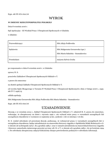 Sygn. akt III AUa 620/16 WYROK W IMIENIU RZECZYPOSPOLITEJ POLSKIEJ Dnia 8 września 2016 r. Sąd Apelacyjny - III Wydział Pracy i Ubezpieczeń Społecznych w Gdańsku w składzie: Przewodniczący: SSA Alicja Podlewska Sędziowie: SSA Małgorzata Gerszewska (spr.) SSA Maria Sałańska - Szumakowicz Protokolant: stażysta Sylwia Gruba po rozpoznaniu w dniu 8 września 2016 r. w Gdańsku sprawy H. S. przeciwko Zakładowi Ubezpieczeń Społecznych Oddział w T. o prawo do emerytury na skutek apelacji Zakładu Ubezpieczeń Społecznych Oddział w T. od wyroku Sądu Okręgowego w Toruniu IV Wydział Pracy i Ubezpieczeń Społecznych z dnia 17 lutego 2016 r., sygn. akt IV U 1956/15 oddala apelację. SSA Małgorzata Gerszewska SSA Alicja Podlewska SSA Maria Sałańska - Szumakowicz Sygn. akt III AUa 620/16 UZASADNIENIE Decyzją z 10 września 2015 r., Zakład Ubezpieczeń Społecznych Oddział w T. odmówił H. S. prawa do emerytury, wskazując, że ubezpieczony na dzień 1 stycznia 1999 r. nie wykazał stażu pracy w warunkach szczególnych lub szczególnym charakterze w wymiarze co najmniej 15 lat, a jedynie 1 rok 10 miesięcy i 16 dni. H. S. wniósł odwołanie od powyższej decyzji, podnosząc, że wykonywał pracę w warunkach szczególnych lub w szczególnym charakterze, będąc zatrudnionym na stanowisku kierowcy ciągnika w Spółdzielni Kółek Rolniczych w G. w okresie od 19 listopada 1979 r. do 4 grudnia 1985 r. oraz w ramach zatrudnienia na stanowiskach kierowcy ciągnika i kierowcy samochodu ciężarowego powyżej 3,5 tony wK. B. w T. w okresie od 9 grudnia 1985 r. do 30 kwietnia 1994 r. Do odwołania ubezpieczony załączył dokumenty służące potwierdzeniu podanych w odwołaniu informacji. W odpowiedzi na odwołanie pozwany wniósł o jego oddalenie. Wyrokiem z dnia 17 lutego 2016 r. Sąd Okręgowy w Toruniu IV Wydział Pracy i Ubezpieczeń Społecznych w punkcie I zmienił zaskarżoną decyzję i przyznał H. S. prawo do emerytury od 1 lipca 2015 r. i w punkcie II nie stwierdził odpowiedzialności organu rentowego za nieustalenie ostatniej okoliczności niezbędnej do wydania decyzji, wskazując następujące motywy rozstrzygnięcia: H. S. w dniu (...) ukończył 60 lat, nie jest członkiem otwartego funduszu emerytalnego, a jego staż ubezpieczeniowy, ustalony na dzień 1 stycznia 1999r., wyniósł łącznie 25 lat (w tym 6 lat, 3 miesiące i 24 dni stanowiły okresy uzupełniające – z tytułu pracy w gospodarstwie rolnym). W latach 1970-1973 ubezpieczony był uczniem zespołu przysposobienia rolniczego w Ł.. Jednocześnie, w okresie od 1 lipca 1971 r. do 27 października 1977 r., wykonywał prace gospodarskie w gospodarstwie rolnym swej matki, Z. S.. W okresie od 25 października 1977 r. do 15 października 1979 r. wnioskodawca odbywał służbę wojskową. W dniu 12 lipca 1977 r. ubezpieczony uzyskał prawo jazdy kategorii T, zaś 31 grudnia 1984 r. – prawo jazdy kategorii C. W okresie od 19 listopada 1979 r. do 4 grudnia 1985 r. H. S. był zatrudniony w Spółdzielni Kółek Rolniczych w G., na podstawie umowy o pracę w pełnym wymiarze czasu pracy, gdzie stale i w pełnym wymiarze czasu, wykonywał pracę w warunkach szczególnych jako kierowca ciągnikowy w Zakładzie Usług (...) w W.. Jak ustalił Sąd w wyniku przeprowadzonego postępowania dowodowego, skarżący korzystał z przydzielonego mu do pracy ciągnika, a gdy ten wymagał napraw, uzyskiwał on pojazd zastępczy, przy czym ubezpieczony nie uczestniczył w pracach naprawczych. Zakład, w którym pracował wnioskodawca, dysponował 10 ciągnikami, zaś traktorzystów było 8 lub 9. H. S. świadczył pracę, przez co najmniej 8 godzin dziennie. Czynności transportowe wykonywane były przez niego w związku z realizacją prac powierzonych pracodawcy ubezpieczonego m.in. przez (...) Przedsiębiorstwo (...), przedsiębiorstwo (...) w T. oraz przedsiębiorstwoZ. w T.. Zimą ubezpieczony dostarczał wapno rolnikom oraz odśnieżał, zaś jesienią przewoził buraki. Usługi transportowe wykonywał przez cały rok przez 8 godzin dziennie. W okresie od wiosny do jesieni, obok całorocznych prac transportowych, świadczył prace polowe na rzecz rolników, w ramach których korzystając z ciągnika - orał, bronował, wykonywał opryski. Dodatkowe prace polowe ubezpieczony wykonywał przez około 12 godzin dziennie. W okresie zatrudnienia w SKR G. wnioskodawca uczestniczył w szkoleniach z zakresu chemizacji rolnictwa dla traktorzystów, nie korzystał z urlopu bezpłatnego. W okresie zatrudnienia u wymienionego pracodawcy skarżący współpracował między innymi z J. H. i A. P.. J. H. był pracownikiem Spółdzielni Kółek Rolniczych w G. w okresie od 1972 r. do 1992 r., początkowo wykonując pracę traktorzysty, później zaś mechanika. A. P. zatrudniony był w (...) w G., w tym samym, co ubezpieczony, zakładzie, w okresie od 27 lutego 1979 r. do końca maja 1990 r., na stanowisku kierowcy ciągnika. Począwszy od 9 grudnia 1985 r. H. S., w związku z porozumieniem zawartym przez Spółdzielnię Kółek Rolniczych w G., zatrudniony został wK. B. w T., gdzie pracował do 30 kwietnia 1994 r. W okresie od podjęcia zatrudnienia do 31 stycznia 1989 r., ubezpieczony, będąc zatrudnionym w pełnym wymiarze czasu pracy, wykonywał pracę kierowcy ciągnika. Począwszy od 1 lutego 1989 r. był kierowcą wywrotki wysokotonażowej marki (...), której całkowita ładowność przekraczała 10 ton, zaś od 1991 r. prowadził samochód ciężarowy o ładowności powyżej 16 ton marki (...). W okresie zatrudnienia w Kombinacie Budowlanym w T. ubezpieczony przez rok wykonywał prace transportowe na potrzeby budownictwa, przewożąc żwir, piasek, wapno i beton. We wskazanym okresie u nie korzystał z urlopu bezpłatnego. W okresie od 1 maja 1994 r. do 31 grudnia 1995 r. H. S. zatrudniony był stale i w pełnym wymiarze czasu pracy w Przedsiębiorstwie (...) w T. na stanowisku kierowcy samochodu ciężarowego o dopusz