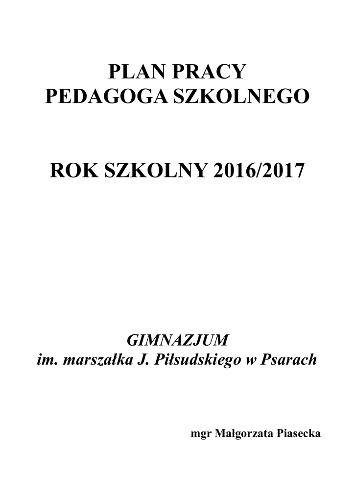 PLAN PRACY PEDAGOGA SZKOLNEGO ROK SZKOLNY 2016/2017