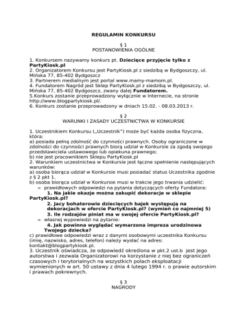 REGULAMIN KONKURSU §1 POSTANOWIENIA OGÓLNE 1. Konkursem nazywamy konkurs pt. Dziecięce przyjęcie tylko z PartyKiosk.pl 2. Organizatorem Konkursu jest PartyKiosk.pl z siedzibą w Bydgoszczy, ul. Mińska 77, 85-402 Bydgoszcz 3. Partnerem medialnym jest portal www.mamy-mamom.pl. 4. Fundatorem Nagród jest Sklep PartyKiosk.pl z siedzibą w Bydgoszczy, ul. Mińska 77, 85-402 Bydgoszcz, zwany dalej Fundatorem. 5.Konkurs zostanie przeprowadzony wyłącznie w Internecie, na stronie http://www.blogpartykiosk.pl/. 6. Konkurs zostanie przeprowadzony w dniach 15.02. - 08.03.2013 r. §2 WARUNKI I ZASADY UCZESTNICTWA W KONKURSIE 1. Uczestnikiem Konkursu („Uczestnik”) może być każda osoba fizyczna, która: a) posiada pełną zdolność do czynności prawnych. Osoby ograniczone w zdolności do czynności prawnych biorą udział w Konkursie za zgodą swojego przedstawiciela ustawowego lub opiekuna prawnego; b) nie jest pracownikiem Sklepu PartyKiosk.pl 2. Warunkiem uczestnictwa w Konkursie jest łączne spełnienie następujących warunków: a) osoba biorąca udział w Konkursie musi posiadać status Uczestnika zgodnie z § 2 pkt 1. b) osoba biorąca udział w Konkursie musi w trakcie jego trwania udzielić: • prawidłowych odpowiedzi na pytania dotyczących oferty Fundatora: 1. Na jakie okazje można zakupić dekoracje w sklepie PartyKiosk.pl? 2. Jacy bohaterowie dziecięcych bajek występują na dekoracjach w ofercie PartyKiosk.pl? (wymień co najmniej 5) 3. Ile rodzajów piniat ma w swojej ofercie PartyKiosk.pl? • własnej wypowiedzi na pytanie: 4. Jak powinna wyglądać wymarzona impreza urodzinowa Twojego dziecka? c) prawidłowe odpowiedzi wraz z danymi osobowymi uczestnika Konkursu (imię, nazwisko, adres, telefon) należy wysłać na adres: [email protected]. 3. Uczestnik oświadcza, że odpowiedź określona w pkt.2 ust.b jest jego autorstwa i zezwala Organizatorowi na korzystanie z niej bez ograniczeń czasowych i terytorialnych na wszystkich polach eksploatacji wymienionych w art. 50 ustawy z dnia 4 lutego 1994 r. o prawie autorskim i prawach pokrewnych. §3 NAGRODY 1. Nagrodami w Konkursie są 4 równorzędne pakiety, którymi są tematyczne zestawy urodzinowe. Laureat może wybrać jeden spośród tych przedstawionych przez Organizatora: A) Zestaw dla najmłodszych: a) Dla dziewczynek • Zestaw nakryć stołu (kubeczki, talerze, serwetki oraz obrus) na roczek dla dziewczynki na 8 osób • Urodzinowa świeczka cyfra 1 • Różowe balony z misiem 6 szt. • Dekoracja świderki z misiem • Różowe lampiony b) Dla chłopców • • • • • • • • Talerzyki papierowe z żółwikiem 8 szt. Kubki z żółwikiem 8 szt. Obrus foliowy z żółwikiem Świeczka z Kubusiem Puchatkiem Lampiony papierowe Dekoracja urodzinowa świderki z misiem Balony dla chłopczyka 6 szt. Serwetki z żółwikiem 16 szt. B) Zestaw dla starszych dzieci: a) Dla dziewczynek • Zestaw party w stylu księżniczek na 8 osób (kubeczki, talerze, serwetki oraz obrus) • Balony z księżniczkami Disney'a 6 szt. • Różowa korona • Królewna Śnieżka – postać do dekoracji ściennej 2 szt. • Konfetti urodzinowe dla nastolatek • Fontanny tortowe 2 szt. • Zabawa urodzinowa z jednorożcem b) Dla chłopców • • • • • • • • • • Talerzyki ze Spider-manem 10 szt. Serwetki ze Spider-manem 20 szt. Obrus ze Spider-manem Kubki ze Spider-manem 10 szt. Zaproszenia ze Spider-manem 6 szt. Piszczałki ze Spider-manem 6 szt. Czapeczki urodzinowe ze Spider-manem 6 szt. Słomki do napojów ze Spider-manem 8 szt. Balony Spiderman 6 szt. Kolorowe konfetti Happy Birthday 2. Zdobywcami nagrody w Konkursie będzie 3 uczestników, którzy do dnia 8 marca 2013 r. udzielą prawidłowych odpowiedzi na pierwsze 3 pytania konkursowe, a ich odpowiedzi na pytanie nr 4 zostaną uznane przez Organizatora za najciekawsze. 3. Laureaci zostaną wybrani dnia 12 marca 2013 r. 4. Jedna osoba może zdobyć nagrodę tylko raz w ramach całego Konkursu. 5. Nie ma możliwości wymiany Nagrody rzeczowej na równowartość pieniężną. 6. Wszelkie wątpliwości dotyczące zasad Konkursu, postanowień jego Regulaminu i interpretacji rozstrzyga Organizator. 7. Zdobywca nagrody zostanie powiadomiony o wygranej pocztą elektroniczną w przeciągu 7 (siedmiu) dni roboczych od zakończenia Konkursu, na wskazany przez niego w trakcie Konkursu adres e-mail. 8. Dodatkowo – informacja o zwycięzcach zostanie przedstawiona na stronie www.blogpartykiosk.pl 8. Za przekazanie nagród zwycięzców odpowiedzialny będzie Organizator Konkursu. Nagrody zostaną wysłane pocztą. §4 DANE OSOBOWE UCZESTNIKÓW KONKURSU 1. Warunkiem udziału w Konkursie jest podanie przez Uczestnika Konkursu prawdziwych danych osobowych, tj.: imienia, nazwiska, adresu konta poczty elektronicznej, numeru telefonu kontaktowego oraz danych teleadresowych niezbędnych do przekazania nagród. 2. Przystępując do Konkursu i akceptując niniejszy regulamin Uczestnik wyraża także zgodę na przetwarzanie podanych przez niego danych osobowych przez Organizatora. Dane będą przetwarzane w celu przeprowadzenia niniejszego Konkursu oraz w związku z wydaniem nagród. §5 POSTANOWIENIA KOŃCOWE Organizator jest uprawniony do zmiany postanowień niniejszego Regulaminu, o ile nie wpłynie to na pogorszenie warunków uczestnictwa w Konkursie.
