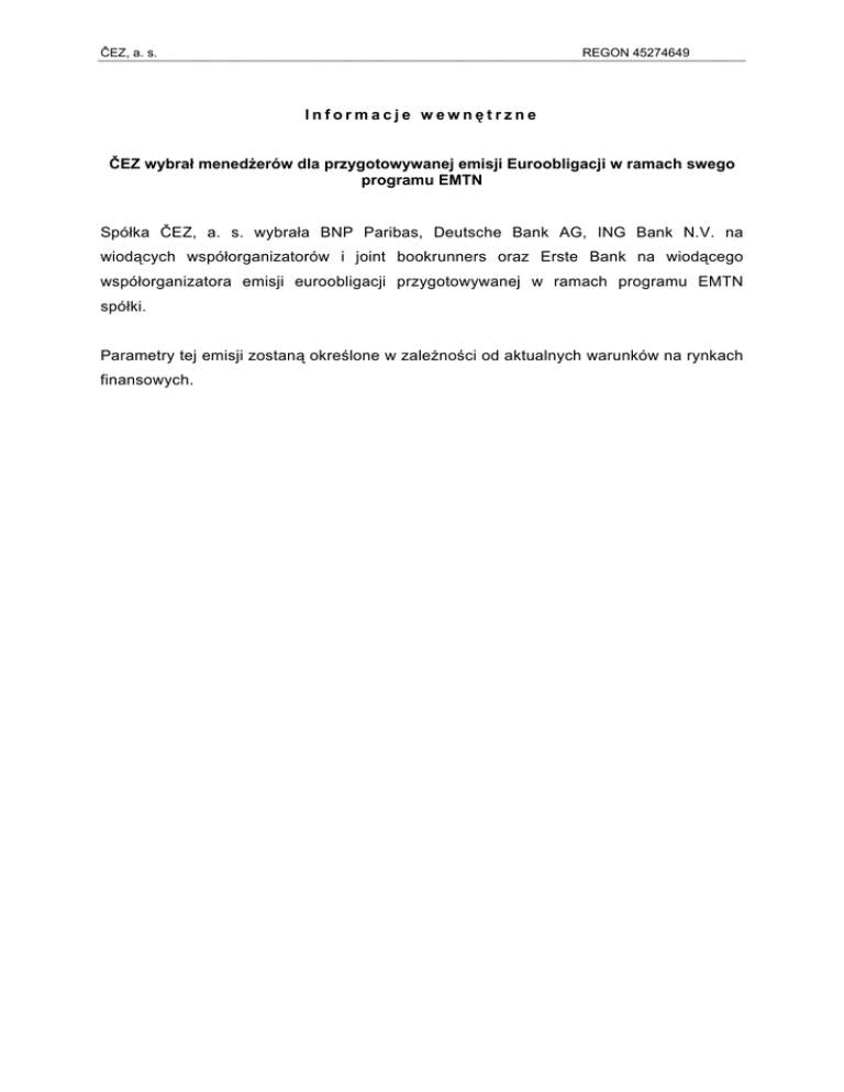 ČEZ, a. s. REGON 45274649 Informacje wewnętrzne ČEZ wybrał menedżerów dla przygotowywanej emisji Euroobligacji w ramach swego programu EMTN Spółka ČEZ, a. s. wybrała BNP Paribas, Deutsche Bank AG, ING Bank N.V. na wiodących współorganizatorów i joint bookrunners oraz Erste Bank na wiodącego współorganizatora emisji euroobligacji przygotowywanej w ramach programu EMTN spółki. Parametry tej emisji zostaną określone w zależności od aktualnych warunków na rynkach finansowych.
