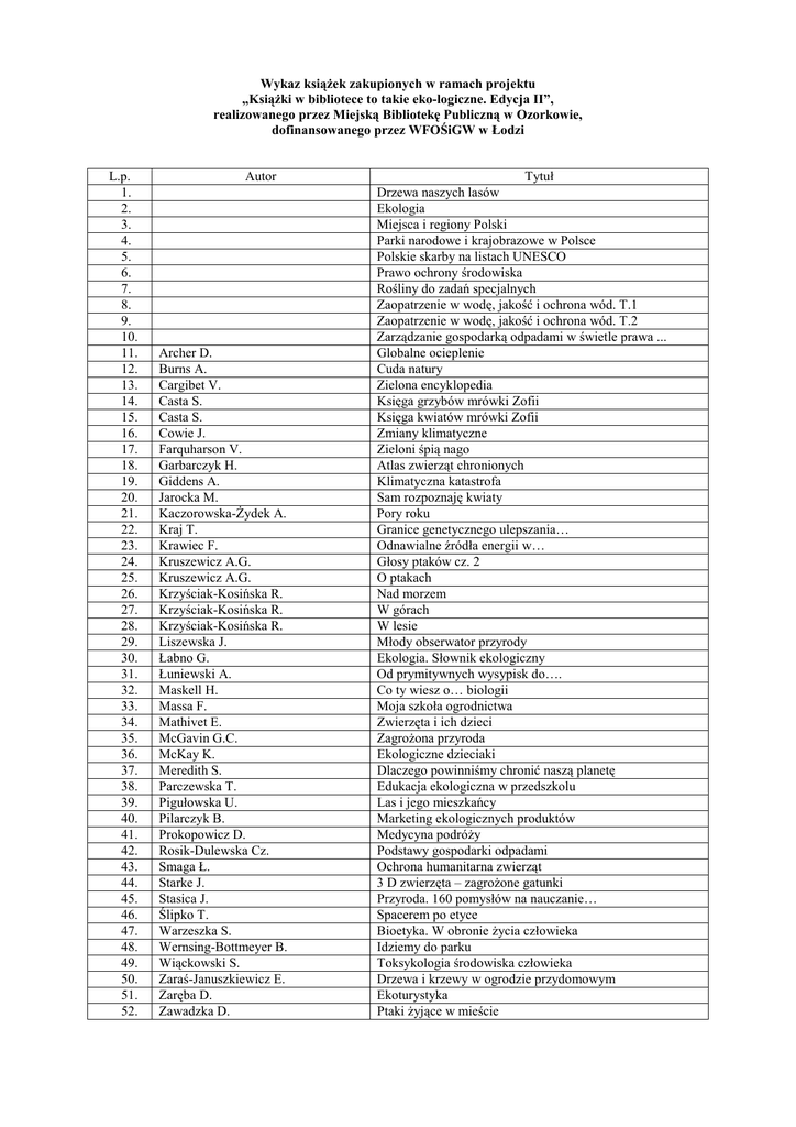 Wykaz książek zakupionych w ramach projektu „Książki w bibliotece to takie eko-logiczne. Edycja II”, realizowanego przez Miejską Bibliotekę Publiczną w Ozorkowie, dofinansowanego przez WFOŚiGW w Łodzi L.p. 1. 2. 3. 4. 5. 6. 7. 8. 9. 10. 11. 12. 13. 14. 15. 16. 17. 18. 19. 20. 21. 22. 23. 24. 25. 26. 27. 28. 29. 30. 31. 32. 33. 34. 35. 36. 37. 38. 39. 40. 41. 42. 43. 44. 45. 46. 47. 48. 49. 50. 51. 52. Autor Archer D. Burns A. Cargibet V. Casta S. Casta S. Cowie J. Farquharson V. Garbarczyk H. Giddens A. Jarocka M. Kaczorowska-Żydek A. Kraj T. Krawiec F. Kruszewicz A.G. Kruszewicz A.G. Krzyściak-Kosińska R. Krzyściak-Kosińska R. Krzyściak-Kosińska R. Liszewska J. Łabno G. Łuniewski A. Maskell H. Massa F. Mathivet E. McGavin G.C. McKay K. Meredith S. Parczewska T. Pigułowska U. Pilarczyk B. Prokopowicz D. Rosik-Dulewska Cz. Smaga Ł. Starke J. Stasica J. Ślipko T. Warzeszka S. Wernsing-Bottmeyer B. Wiąckowski S. Zaraś-Januszkiewicz E. Zaręba D. Zawadzka D. Tytuł Drzewa naszych lasów Ekologia Miejsca i regiony Polski Parki narodowe i krajobrazowe w Polsce Polskie skarby na listach UNESCO Prawo ochrony środowiska Rośliny do zadań specjalnych Zaopatrzenie w wodę, jakość i ochrona wód. T.1 Zaopatrzenie w wodę, jakość i ochrona wód. T.2 Zarządzanie gospodarką odpadami w świetle prawa ... Globalne ocieplenie Cuda natury Zielona encyklopedia Księga grzybów mrówki Zofii Księga kwiatów mrówki Zofii Zmiany klimatyczne Zieloni śpią nago Atlas zwierząt chronionych Klimatyczna katastrofa Sam rozpoznaję kwiaty Pory roku Granice genetycznego ulepszania… Odnawialne źródła energii w… Głosy ptaków cz. 2 O ptakach Nad morzem W górach W lesie Młody obserwator przyrody Ekologia. Słownik ekologiczny Od prymitywnych wysypisk do…. Co ty wiesz o… biologii Moja szkoła ogrodnictwa Zwierzęta i ich dzieci Zagrożona przyroda Ekologiczne dzieciaki Dlaczego powinniśmy chronić naszą planetę Edukacja ekologiczna w przedszkolu Las i jego mieszkańcy Marketing ekologicznych produktów Medycyna podróży Podstawy gospodarki odpadami Ochrona humanitarna zwierząt 3 D zwierzęta – zagrożone gatunki Przyroda. 160 pomysłów na nauczanie… Spacerem po etyce Bioetyka. W obronie życia człowieka Idziemy do parku Toksykologia środowiska człowieka Drzewa i krzewy w ogrodzie przydomowym Ekoturystyka Ptaki żyjące w mieście