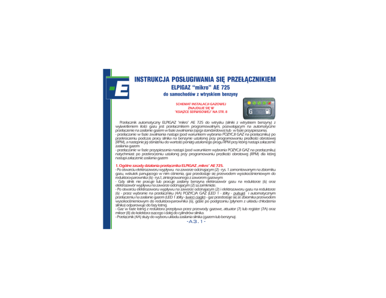 INSTRUKCJA POS£UGIWANIA SIÊ PRZE£¥CZNIKIEM ELPIGAZ “mikro” AE 725 do samochodów z wtryskiem benzyny SCHEMAT INSTALACJI GAZOWEJ ZNAJDUJE SIÊ W “KSI¥¯CE SERWISOWEJ” NA STR. 8 Prze³¹cznik automatyczny ELPIGAZ "mikro" AE 725 do wtrysku (silniki z wtryskiem benzyny) z wyœwietleniem iloœci gazu jest prze³¹cznikiem programowalnym, pozwalaj¹cym na automatyczne prze³¹czenie na zasilanie gazem w fazie zwalniania (opcja standardowa) lub w fazie przyspieszania, - prze³¹czanie w fazie zwalniania nast¹pi (pod warunkiem wybrania POZYCJI GAZ na prze³¹czniku) po przekroczeniu podczas pracy silnika na benzynie ustalonej przy programowaniu prêdkoœci obrotowej (RPM), a nastêpnie jej obni¿eniu do wartoœci poni¿ej ustalonego progu RPM przy której nast¹pi za³¹czenie zasilania gazem - prze³¹czanie w fazie przyspieszania nast¹pi (pod warunkiem wybrania POZYCJI GAZ na prze³¹czniku) natychmiast po przekroczeniu ustalonej przy programowaniu prêdkoœci obrotowej (RPM) dla której nast¹pi za³¹czenie zasilania gazem 1. Ogólne zasady dzia³ania prze³¹cznika ELPIGAZ „mikro” AE 725. - Po otwarciu elektrozaworu wyp³ywu na zaworze odcinaj¹cym (2) - rys. 1 zamontowanym na zbiorniku gazu, wskutek panuj¹cego w nim ciœnienia, gaz przedostaje siê przewodem wysokociœnieniowym do reduktora-parownika (6) - rys.1, zintegrowanego z zaworem gazowym - Gdy silnik nie pracuje lub pracuje zasilany benzyn¹ elektrozawór gazu na reduktorze (6) oraz elektrozawór wyp³ywu na zaworze odcinaj¹cym (2) s¹ zamkniête. - Po otwarciu elektrozaworu wyp³ywu na zaworze odcinaj¹cym (2) i elektrozaworu gazu na reduktorze (6) - przez wybranie na prze³¹czniku (4A) POZYCJA GAZ (LED 1 - ¿ó³ty - pulsuje) i automatycznym prze³¹czeniu na zasilanie gazem (LED 1 ¿ó³ty - œwieci ci¹gle) - gaz przedostaje siê ze zbiornika przewodem wysokociœnieniowym do reduktora-parownika (6), gdzie po podgrzaniu (p³ynem z uk³adu ch³odzenia silnika) odparowuje do fazy lotnej. - Gaz w fazie lotnej z reduktora przep³ywa przez przewody gazowe, attuator (7) lub register (7A) oraz mikser (8) do kolektora ss¹cego i dalej do cylindrów silnika. - Prze³¹cznik (4A) s³u¿y do wyboru uk³adu zasilania silnika (gazem lub benzyn¹). -A3.1- 2. Zasada dzia³ania prze³¹cznika ELPIGAZ "mikro" AE 725 (z uruchamianiem na benzynie i automatycznym prze³¹czeniem na gaz) Prze³¹cznik ELPIGAZ “mikro” AE725 jest zielony - LEDy prze³¹cznikiem pulsowym. Ka¿dorazowe iloœci gazu naciœniêcie prze³¹cznika pozwala na dokonanie ¿ó³ty (œwieci ci¹gle) nie œwiec¹, a LED 1 œwieci nastêpuj¹cych kolejno wyborów: - praca na gazie ci¹gle - rezerwa gazu ,,R” - ZASILANIE BENZYN¥ ( ) - zasilanie silnika benzyn¹ - LED 5 œwieci ci¹gle na czerwono czerwony - zasilanie ¿ó³ty (pulsuje) (pozosta³e nie) benzyn¹ ( ) - wybrano GAZ (pozosta³e nie œwiec¹) - POZYCJA GAZ (G) - wybrano zasilanie gazem (LED 1 - ¿ó³ty - pulsuje). Uruchomienie silnika zielony - PE£NO - max. odbywa siê na benzynie, a nastêpnie po iloœæ gazu w zbiorniku* automatycznym prze³¹czeniu na zasilanie gazem (w fazie zwalniania lub przyspieszania czerwono-zielony po przekroczeniu progu prze³¹czenia RPM) (przemiennie) LED 1 ¿ó³ty - œwieci ci¹gle informuj¹c o pracy aktywacja programowania silnika na gazie. - URUCHOMIENIE AWARYJNE W³¹czyæ zap³on - LED 1 (¿ó³ty) pulsuje , przytrzymaæ prze³¹cznik, a¿ LED 1 (¿ó³ty) zacznie œwieciæ ci¹gle po czym zwolniæ (puœciæ) prze³¹cznik i nastêpnie uruchomiæ silnik. Silnik uruchamia siê bezpoœrednio na gazie. Po URUCHOMIENIU AWARYJNYM przed rozpoczêciem jazdy nale¿y poczekaæ na osi¹gniêcie przez silnik temp miñ. 40°C dla zapewnienia odpowiedniego odparowania gazu. UWAGA!!! CZÊSTE URUCHAMIANIE SILNIKA BEZPOŒREDNIO NA GAZIE (POZYCJA AWARYJNA) PROWADZI DO PRZYSPIESZONEGO ZU¯YCIA ELEMENTÓW INSTALACJI GAZOWEJ ORAZ ELEMENTÓW SYSTEMU WTRYSKU BENZYNY. 3. Sygnalizacja na prze³¹czniku: Na prze³¹czniku znajduje siê 5 LEDów (diód œwietlnych), które wskazuj¹: a) LED 1 (¿ó³ty) : - pulsuje - POZYCJA GAZ, - wybrano zasilanie gazem, oczekiwanie na spe³nienie warunków niezbêdnych do automatycznego prze³¹czenia na zasilanie gazem (do czasu automatycznego prze³¹czenia na gaz silnik pracuje na benzynie) -A3.2- - œwieci ci¹gle - praca silnika na gazie; silnik jest zasilany gazem, elektrozawór wyp³ywu na zaworze odcinaj¹cym (2) rys 1 i elektrozawór gazu na reduktorze (6) znajduj¹ siê w pozycji otwartej b) LED 2, 3, 4, 5 (zielone LEDy iloœci gazu) -œwiec¹ ci¹gle* podczas pracy silnika na gazie (LED 1 - ¿ó³ty -œwieci ci¹gle) wskazuj¹ iloœæ gazu w zbiorniku. Iloœæ œwiec¹cych LEDów zale¿y od iloœci gazu w zbiorniku oraz od rodzaju wybranego wskazania iloœci gazu podczas programowania (pe³ne wskazanie / tylko rezerwa). W zale¿noœci od iloœci œwiec¹cych ledów zielonych okreœla siê iloœæ gazu w zbiorniku odnosz¹c siê do max. iloœci któr¹ mo¿na nape³niæ zbiornik - odpowiednio: LED 2 - oko³o 1/4 iloœæ max.*, lub iloœæ gazu powy¿ej poziomu ustalonego dla rezerwy (je¿eli zaprogramowano wspó³pracê z sensorem rezerwy) LED 2,3 - oko³o 2/4 (1/2) iloœci max.*; LED 2,3,4 oko³o 3/4 iloœci max.*; LED 2,3,4,5 PE£NO - max. iloœæ* c) LED 5 - czerwony - œwieci ci¹gle na czerwono - ,,ZASILANIE BENZYN¥” - praca silnika na benzynie - zielony - œwieci ci¹gle na zielono - maksymalna iloœæ gazu w zbiorniku - czerwono-zielony - œwieci zmieniaj¹c przemiennie kolory czerwony-zielony - aktywacja procesu programowania prze³¹cznika (funkcja przewidziana tylko dla Zak³adów Monta¿u) d) REZERWA GAZU - ,,R” - LED 2, 3, 4, 5 nie œwieci (dla wybranej POZYCJA GAZ tzn. je¿eli - LED 1- ¿ó³ty œwieci ci¹gle) - oznacza to, ¿e osi¹gniêta zosta³a iloœæ gazu w zbiorniku odpowiadaj¹ca iloœci dla rezerwy *UWAGA !!! A. Wskazanie iloœci gazu na prze³¹czniku (za pomoc¹ zielonych LEDów 2,3,4,5) wymaga: - zast