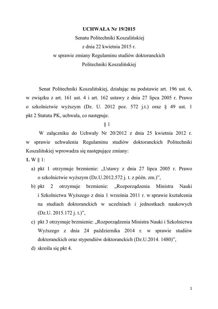 Uchwały Senatu Politechniki Koszalińskiej Nr 19/2015
