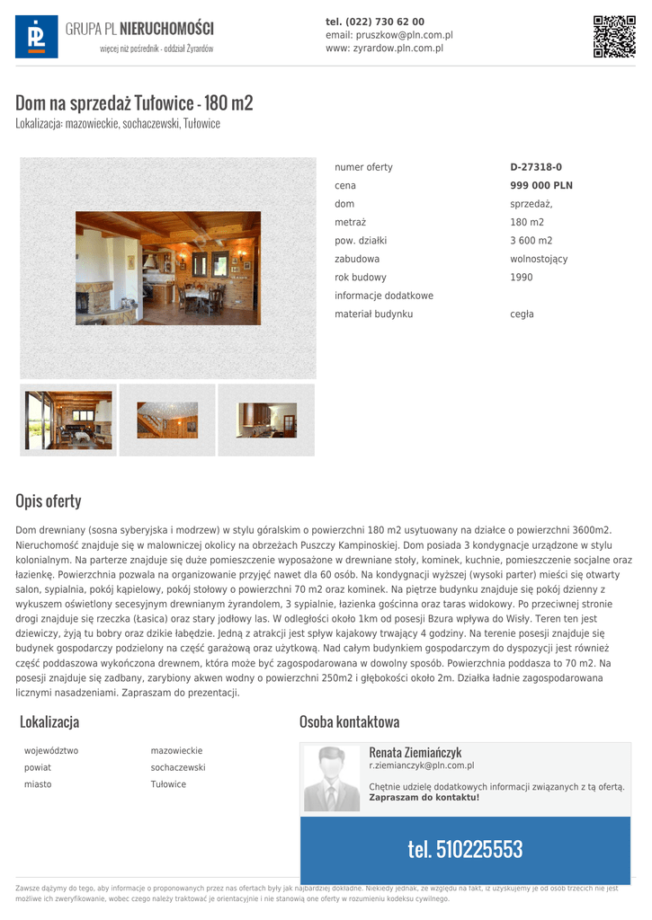tel. (022) 730 62 00 email: [email protected] www: zyrardow.pln.com.pl Dom na sprzedaż Tułowice - 180 m2 Lokalizacja: mazowieckie, sochaczewski, Tułowice numer oferty D-27318-0 cena 999 000 PLN dom sprzedaż, metraż 180 m2 pow. działki 3 600 m2 zabudowa wolnostojący rok budowy 1990 informacje dodatkowe materiał budynku cegła Opis oferty Dom drewniany (sosna syberyjska i modrzew) w stylu góralskim o powierzchni 180 m2 usytuowany na działce o powierzchni 3600m2. Nieruchomość znajduje się w malowniczej okolicy na obrzeżach Puszczy Kampinoskiej. Dom posiada 3 kondygnacje urządzone w stylu kolonialnym. Na parterze znajduje się duże pomieszczenie wyposażone w drewniane stoły, kominek, kuchnie, pomieszczenie socjalne oraz łazienkę. Powierzchnia pozwala na organizowanie przyjęć nawet dla 60 osób. Na kondygnacji wyższej (wysoki parter) mieści się otwarty salon, sypialnia, pokój kąpielowy, pokój stołowy o powierzchni 70 m2 oraz kominek. Na piętrze budynku znajduje się pokój dzienny z wykuszem oświetlony secesyjnym drewnianym żyrandolem, 3 sypialnie, łazienka gościnna oraz taras widokowy. Po przeciwnej stronie drogi znajduje się rzeczka (Łasica) oraz stary jodłowy las. W odległości około 1km od posesji Bzura wpływa do Wisły. Teren ten jest dziewiczy, żyją tu bobry oraz dzikie łabędzie. Jedną z atrakcji jest spływ kajakowy trwający 4 godziny. Na terenie posesji znajduje się budynek gospodarczy podzielony na część garażową oraz użytkową. Nad całym budynkiem gospodarczym do dyspozycji jest również część poddaszowa wykończona drewnem, która może być zagospodarowana w dowolny sposób. Powierzchnia poddasza to 70 m2. Na posesji znajduje się zadbany, zarybiony akwen wodny o powierzchni 250m2 i głębokości około 2m. Działka ładnie zagospodarowana licznymi nasadzeniami. Zapraszam do prezentacji. Lokalizacja Osoba kontaktowa Renata Ziemiańczyk województwo mazowieckie powiat sochaczewski [email protected] miasto Tułowice Chętnie udzielę dodatkowych informacji związanych z tą ofertą. Zapraszam do kontaktu! tel. 510225553 Zawsze dążymy do tego, aby informacje o proponowanych przez nas ofertach były jak najbardziej dokładne. Niekiedy jednak, ze względu na fakt, iż uzyskujemy je od osób trzecich nie jest możliwe ich zweryfikowanie, wobec czego należy traktować je orientacyjnie i nie stanowią one oferty w rozumieniu kodeksu cywilnego.