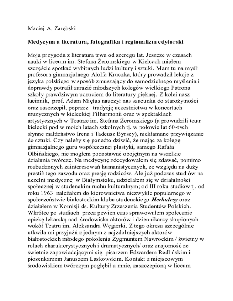 Maciej A. Zarębski Medycyna a literatura, fotografika i regionalizm edytorski Moja przygoda z literaturą trwa od szeregu lat. Jeszcze w czasach nauki w liceum im. Stefana Żeromskiego w Kielcach miałem szczęście spotkać wybitnych ludzi kultury i sztuki. Mam tu na myśli profesora gimnazjalnego Alolfa Kruczka, który prowadził lekcje z języka polskiego w sposób zmuszający do samodzielnego myślenia i doprawdy potrafił zarazić młodszych kolegów wielkiego Patrona szkoły prawdziwym uczuciem do literatury pięknej. Z kolei nasz łacinnik, prof. Adam Miętus nauczył nas szacunku do starożytności oraz zaszczepił, poprzez tradycję uczestnictwa w koncertach muzycznych w kieleckiej Filharmonii oraz w spektaklach artystycznych w Teatrze im. Stefana Żeromskiego (a prowadzili teatr kielecki pod w moich latach szkolnych tj. w połowie lat 60-tych słynne małżeństwo Irena i Tadeusz Byrscy), niekłamane przywiązanie do sztuki. Czy należy się ponadto dziwić, że mając za kolegę gimnazjalnego guru współczesnej plastyki, samego Rafała Olbińskiego, nie mogłem pozostawać obojętnym na wszelkie działania twórcze. Na medycynę zdecydowałem się zdawać, pomimo rozbudzonych zainteresowań humanistycznych, ze względu na duży prestiż tego zawodu oraz presję rodziców. Ale już podczas studiów na uczelni medycznej w Białymstoku, udzielałem się w działalności społecznej w studenckim ruchu kulturalnym; od III roku studiów tj. od roku 1963 należałem do kierownictwa niezwykle popularnego w społeczeństwie białostockim klubu studenckiego Herkulesy oraz działałem w Komisji ds. Kultury Zrzeszenia Studentów Polskich. Wkrótce po studiach przez pewien czas sprawowałem społecznie opiekę lekarską nad środowiska aktorów i dziennikarzy skupionych wokół Teatru im. Aleksandra Węgierki. Z tego okresu szczególnie utkwiła mi przyjaźń z jednym z najzdolniejszych aktorów białostockich młodego pokolenia Zygmuntem Nawrockim / świetny w rolach charakterystycznych i dramatycznych/ oraz znajomość ze świetnie zapowiadającymi się: pisarzem Edwardem Redlińskim i piosenkarzem Januszem Laskowskim. Kontakt z miejscowym środowiskiem twórczym pogłębił u mnie, zaszczepioną w liceum wrażliwość twórczą, oraz spowodował wyraźny wzrost zainteresowania literaturą i sztuką. Działając bardzo aktywnie zawodowo i naukowo ( prowadzenie dydaktyki ze studentami z zakresu farmakologii, praca naukowa zwieńczona w roku 1971 doktoratem, praca zawodowa specjalizacją z diagnostyki laboratoryjnej w roku 1975; nie miałem czasu na realizację swych twórczych marzeń: zajęcia się reportażem literackim, fotografiką oraz regionalizmem, głównie wydawniczym. Dopiero podczas pracy w Staszowie, dokąd przeniosłem się w roku 1975 znalazłem czas na realizację swoich pasji twórczych: w roku 1977 organizując Teatr Małych Form przy szpitalu w Staszowie oraz zakładając, wspólnie z Adamem Bieniem w roku 1981 Staszowskie Towarzystwo Kulturalne, organizację działającą na rzecz lokalnej społeczności i wpływającej na wzrost jej aktywności. Ale dopiero podróże i praca na kontrakcie Polservice w Libii w latach 1983-86 wyzwoliła u mnie skłonności pisarskie. W jej wyniku powstała wydana w roku 1994 książka pt. Od dżumy do dżumy, będąca reporterskim zapisem z ponad trzyletniego pobytu w Afryce. Obok zwykłej codziennej rzeczywistości libijskiej, w książce pokazałem liczne wędrówki po tym egzotycznym dla nas kraju a także zawarłem relacje z licznych, organizowanych w miejscowym szpitalu i na polskim kampie imprez literackich, które sam reżyserowałem. W jednej z nich - 24 lipca 1984 roku wzięła udział Jadwiga Teresa Stępień, przyszła solistka Teatru Wielkiego w Warszawie, przebywająca na urlopie u swojej matki. Wcześniej, bo jeszcze w roku 1993 opublikowałem zbiór reportaży z podróży do Egiptu, Ziemi Świętej, Wilna i Katynia zatytułowany Podróże, Ludzie, Spotkania. W roku 1996 ukazała się kolejna moja książka reportażowa, przedstawiająca wspólny pobyt z małżonką u Manfreda Zankera, niemieckiego antyfaszysty, polskiego partyzanta w Berlinie i Bawarii Z wizytą u Manfreda. W roku 1998 wydałem książkę Staszów naszych pradziadków a w roku 1999 Staszów wczoraj i dziś – obie pozycje niezwykle ważne dla społeczeństwa grodu nad Czarną. Do chwili obecnej (lata 1999-2011) wydałem kilka książek reportażowych, w tym Ostatni z szesnastu - o Adamie Bieniu (1999), Jeszcze jedno życie - o Ojcu Janie, Ak-owcu ( 2001), W cztery świata strony - o Stanisławie Szwarcu – Bronikowskim (2002), Zygmunt Wójcik in memoriam, Ludzie, pasje, ślady – książka wydana z okazji 60 lecia urodzin (2003). W roku 2005 ukazała się ważna regionalistyczna Z dziejów regionalizmu świętokrzyskiego. Wiosną 2006 roku wydałem książkę reportażową, będącą relacją z kilkutygodniowego pobytu w Chicago latem 2004 roku zatytułowaną Dotkniecie Ameryki – pięćdziesiąt dni w Stanach, zaś w 2010 roku album reportażowy Kierunek Alaska W tym samym roku wydałem obszerny tom moich tekstów poświęcony regionalizmowi zatytułowany W służbie regionu świętokrzyskiego. Rok wcześniej ukazało się wydawnictwo albumowe z obszernym komentarzem faktograficznym (mojego autorstwa tekstowego i fotograficznego) Dwory i pałace w widłach Wisły i Pilicy. Wiosną 2011 roku wydana została moja kolejna książka reportażowa Erudyta niepowszedni, jej bohaterem jest zmarły w lipcu 2010 roku Leon Janowicz. Jestem redaktorem ponad 250 pozycji książkowych Biblioteki Staszowskiej i Świętokrzyskiej. Oto najważniejsze tytuły: Cztery tomy Almanachu Staszowskiego (1982,1987,1994,2002), Tropem zbrodni stalinowskich (1992), Nad Czarną (1997), Regionalizm a historia (1998), Opowieść Firmantego (2002), W rodzinie kultur europejskich (2004), Almanach świętokrzyskich eskulapów,, Regionalizm, patriotyzm, europejskość (2007), Powroty 