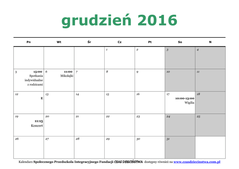 grudzień 2016 Pn 3 Wt 15:00 6 Spotkania indywidualne z rodzicami 12 13 Śr 11:00 7 Mikołajki 14 Cz Pt So 1 2 3 4 8 9 10 11 15 16 17 18 E 19 N 10:00-13:00 Wigilia 20 21 22 23 24 27 28 29 30 31 25 11:15 Koncert 26 Kalendarz Społecznego Przedszkola Integracyjnego Fundacji CZAS DZIECIŃSTWA dostępny również na www.czasdziecinstwa.com.pl