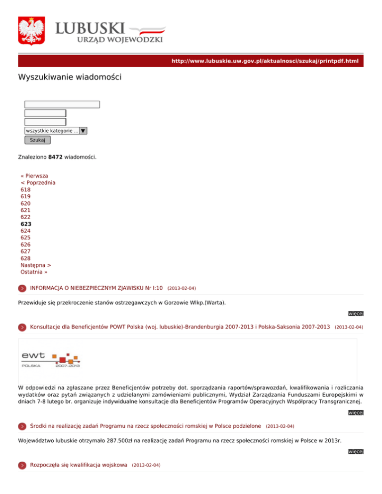 http://www.lubuskie.uw.gov.pl/aktualnosci/szukaj/printpdf.html Wyszukiwanie wiadomości wszystkie kategorie ... ▼ Szukaj Znaleziono 8472 wiadomości. « Pierwsza < Poprzednia 618 619 620 621 622 623 624 625 626 627 628 Następna > Ostatnia » INFORMACJA O NIEBEZPIECZNYM ZJAWISKU Nr I:10 (2013-02-04) Przewiduje się przekroczenie stanów ostrzegawczych w Gorzowie Wlkp.(Warta). więcej Konsultacje dla Beneficjentów POWT Polska (woj. lubuskie)-Brandenburgia 2007-2013 i Polska-Saksonia 2007-2013 (2013-02-04) W odpowiedzi na zgłaszane przez Beneficjentów potrzeby dot. sporządzania raportów/sprawozdań, kwalifikowania i rozliczania wydatków oraz pytań związanych z udzielanymi zamówieniami publicznymi, Wydział Zarządzania Funduszami Europejskimi w dniach 7-8 lutego br. organizuje indywidualne konsultacje dla Beneficjentów Programów Operacyjnych Współpracy Transgranicznej. więcej Środki na realizację zadań Programu na rzecz społeczności romskiej w Polsce podzielone (2013-02-04) Województwo lubuskie otrzymało 287.500zł na realizację zadań Programu na rzecz społeczności romskiej w Polsce w 2013r. więcej Rozpoczęła się kwalifikacja wojskowa (2013-02-04) W dniach od 4 lutego do 30 kwietnia 2013r. na terenie całego kraju trwa kwalifikacja wojskowa więcej Rakowi powiedz STOP! Światowy Dzień Walki z Rakiem (2013-02-04) 4 lutego to Światowy Dzień Walki z Rakiem. Prognozy Światowej Organizacji Zdrowia wskazują na podwojenie liczby nowych zachorowań na nowotwory w ciągu najbliższych 15-20 lat. Dlatego tak ważną rolę odgrywa prewencja i profilaktyka nowotworowa. O regularne badania apeluje wojewoda lubuski Marcin Jabłoński. więcej OSTRZEŻENIE HYDROLOGICZNE Nr I:8 (2013-02-03) W związku z rozwojem sytuacji hydrologicznej w ciągu najbliższej doby przewiduje się dalsze wzrosty stanów wody w strefie stanów ostrzegawczych - Nowe Drezdenko i Gościmiec (Noteć), Drawiny (Drawa). więcej Ostrzeżenie meteorologiczne Nr 8 (2013-02-02) Nastąpi spadek temperatury powietrza poniżej 0°C, powodując zamarzanie mokrych nawierzchni dróg i chodników. Temperatura minimalna wyniesie od -4°C do -2°C. Prognozowany spadek temperatury przy gruncie od -5°C do -3°C więcej OSTRZEŻENIE HYDROLOGICZNE Nr I:6 (2013-02-02) W związku ze spływem wód opadowo-roztopowych, prognozowane są wzrosty stanów wody do strefy stanów ostrzegawczych Nowe Drezdenko (Noteć), Drawiny (Drawa). więcej Lista "schetynówek" zatwierdzona (2013-02-01) Minister Administracji i Cyfryzacji zatwierdził listę wniosków przygotowaną przez Wojewodę Lubuskiego. Złożone przez samorządy dokumenty oceniała komisja powołana przez Marcina Jabłońskiego. więcej Wojewoda w Radio Gorzów (2013-02-01) Między innymi o restrukturyzacji gorzowskiego szpitala i ostatnim zamieszaniu wokół tomografu w gorzowskiej placówce mówił wojewoda Marcin Jabłoński podczas porannej rozmowy na antenie Radia Gorzów. więcej « Pierwsza < Poprzednia 618 619 620 621 622 623 624 625 626 627 628 Następna > Ostatnia »