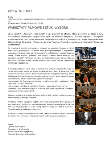 KPP W TUCHOLI Źródło: http://www.tuchola.kujawsko-pomorska.policja.gov.pl/k43/informacje/wiadomosci/65556,Warsztaty-filmowe-Sztuki-Wyboru.ht ml Wygenerowano: Wtorek, 7 marca 2017, 22:56 WARSZTATY FILMOWE SZTUKI WYBORU „Bez opieki”, „Reaguj”, „Headshot” i „Dogrywka” to etiudy, które powstały podczas I tury warsztatów filmowych zorganizowanych, w ramach projektu „Sztuka Wyboru”. Program współtworzony jest przez Komendę Wojewódzką Policji w Bydgoszczy, Urząd Marszałkowski Województwa Kujawsko - Pomorskiego oraz Fundację Tumult, organizatora Festiwalu Filmowego CAMERIMAGE. Od czwartku do niedzieli w Bydgoszczy odbywały się warsztaty filmowe, w których wzięli udział gimnazjaliści i uczniowie szkół ponadgimnazjalnych z województwa kujawsko-pomorskiego. Piąta już edycja programu profilaktyczno - edukacyjnego pod nazwą „Sztuka Wyboru” przebiega pod hasłem „Kamera! Akcja! Reakcja! czyli bezpieczne wakacje”. Partnerami programu są: Kujawsko-Pomorskie Centrum Edukacji Nauczycieli, bydgoskie Studio Filmowe BlackFish oraz Zespół Szkół nr 5 Mistrzostwa Sportowego w Bydgoszczy. W czwartek uczestnicy wzięli udział w projekcji filmu „Intruz” w reżyserii Magnusa von Horna, a następnie odbyła się debata prowadzona przez kom. w stanie spoczynku Marka Kolińskiego i podkom. Adama Kumkowskiego z Wydziału Prewencji KWP w Bydgoszczy. Kolejny dzień wypełniły warsztaty teoretyczne, które prowadzili uznani polscy filmowcy. Zajęcia obejmowały zagadnienia takie jak: -gramatyka języka filmowego oraz podstawy sztuki operatorskiej – wykładowcy Paweł Dyllus (PSC) i Bartosz Piotrowski, -rola scenopisu (storyboard) w produkcji filmowej – wykładowca Janusz Martyn, -podstawy sztuki montażu w oparciu o analizę wybranych fragmentów filmowych – wykładowca Tomasz Mączka (PSM). Gościem spotkania z aktorem był Alan Andersz, który mówił o sztuce wyboru w aktorstwie i życiu młodego człowieka. Warsztaty filmowe uzupełniła część edukacyjna, prowadzona przez policyjnych specjalistów ds. nieletnich i patologii podkom. Adama Kumkowskiego i asp. szt. Tomasza Trybuszewskiego oraz Iwonę Rostankowską eksperta z Kujawsko – Pomorskiego Centrum Edukacji Nauczycieli. W sobotę przyszedł czas samodzielną pracę z kamerą. Uczestnicy mieli za zadanie stworzenie etiud filmowych, w których poruszali problemy swojego pokolenia. Reaguj Opiekun: Paweł Dyllus Gimnazjum nr 1 w Pruszczu Zespół Szkół nr 28 w Bydgoszczy Publiczne Gimnazjum w Ciechocinku Bez opieki Opiekun: Bartosz Piotrowski Gimnazjum nr 23 w Bydgoszczy Zespół Szkół Mechanicznych w Bydgoszczy Młodzieżowy Ośrodek Adaptacji Społecznej w Szubinie Dogrywka Opiekun: Lude Reno Zespół Szkół Ponadpodstawowych w Samostrzelu Gimnazjum nr 1 w Lubiczu Headshot Opiekuni: Michał Zieliński i Feliks Novikov Zespół Szkól Ogólnokształcących w Tucholi III Liceum Ogólnokształcące we Włocławku Zespół Szkół Elektronicznych w Bydgoszczy Projekt ma formę konkursu. Autorzy najlepszych filmów, stworzonych samodzielnie już po warsztatach, nagradzani są na uroczystej gali, odbywającej się rokrocznie w trakcie festiwalu CAMERIMAGE. Kolejna tura warsztatów odbędzie się w dniach 16 – 19.06.2016 r. Autorzy zdjęć: Marta Pawłowska - studio Blackfish Michał Prewysz-Kwinto - zdjęcia w plenerze Autor: Publikacja: sierż. sztab. Justyna Janiak Ocena: 0/5 (0) Tweetnij