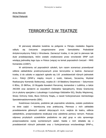 Terroryści w teatrze Anna Niwczyk Michał Piekarski TERRORYŚCI W TEATRZE W pierwszej dekadzie kwietnia na poligonie w Pstrążu niedaleko Żagania odbyły się ćwiczenia zorganizowane przez Samodzielny Pododdział Antyterrorystyczny Policji z Wrocławia. Zaznaczyć trzeba, iż nie jest to pierwsze tak duże przedsięwzięcie, które zostało zrealizowane przez wrocławski SPAP czyli wiodącą jednostkę tego typu w Polsce (więcej na temat poprzednich ćwiczeń - MMS Komandos 2/2007). W odróżnieniu od poprzednich szkoleń, tym razem scenariusz przewidywał odbicie zakładników przetrzymywanych przez terrorystów w teatrze. Zaznaczyć trzeba, iż do udziału w zajęciach zgłosiło się 110 przedstawicieli różnych jednostek m.in.: Policji (SPAP-y między innymi z Łodzi, Katowic, Szczecina, Wydział Realizacyjny Komendy Stołecznej), wojska (6 i 18 Bataliony Desantowo – Szturmowe 6 BDsz, 25 BKPow, 10 Brygada Kawalerii Pancernej, komandosi z Lublińca, a także JW2305 oraz żandarmi ze wszystkich Oddziałów Specjalnych), Straży Granicznej (m.in plutony specjalne z Lubuskiego i Łużyckiego Oddziałów SG), Służby Więziennej, Straży Ochrony Kolei, Biura Ochrony Rządu, a nawet funkcjonariusze niemieckiego Spezialeinsatzkommando (SEK). Kwietniowe ćwiczenie, podobnie jak poprzednie szkolenia, zostało podzielone na dwie części – teoretyczną oraz praktyczną. Pierwsza z nich zakładała przedstawienie głównych założeń dotyczących m.in. wejścia do teatru, odbicia zakładników, przeprowadzenia ewakuacji oraz udzielenia pomocy rannym. Podczas odprawy przybyłych uczestników podzielono na pięć grup w celu sprawnego przeprowadzenia wyżej wymienionych zadań. Każda z nich składała się z przedstawicieli różnych jednostek oraz z funkcjonariusza wrocławskiego SPAP-u, © A.Niwczyk, M.Piekarski. All rights reserved Terroryści w teatrze który pełnił funkcję „team leadera”. Po zasadniczej odprawie, w poszczególnych grupach rozpoczęło się omawianie szczegółów dotyczących realizacji szturmu, procedur oraz ewakuacji, a także warunków bezpieczeństwa. Na zakończenie odbył się pokaz sprzętu taktycznego oraz medycznego używanego m.in. w czerwonej taktyce. Ponadto spotkanie w jednym miejscu funkcjonariuszy reprezentujących różne resorty oraz siły i służby odpowiedzialne za bezpieczeństwo było świetną okazją do zapoznania się z różnego rodzaju uzbrojeniem. Szczególną uwagę autorów niniejszego artykułu zwrócił kbk AKMS z szynami MIL-STD 1913 z dwójnogiem, oświetleniem taktycznym, chwytem przednim, kompensatorem od SWD, używany jako broń wsparcia, strzelba Mossberg M500 ATP6C z oświetleniem taktycznym i przednim chwytem pistoletowym do szybkiego przeładowania, a także PM-98 z szyną Weavera (tzw. Nosorożec) wraz z kolbą zmodyfikowaną do długości pośredniej (zablokowaną za pomocą śruby). Natomiast druga część zakładała przeprowadzenie ćwiczenia. Miało ono miejsce dzień później na poradzieckim poligonie. Obiekt ten jest idealny do prowadzenia ćwiczeń czy szkoleń, gdyż w jego skład wchodzą bloki mieszkalne, szkoła, teatr, a także sieć dróg i linia kolejowa. W budynku – którego skomplikowany układ pomieszczeń stanowił dodatkowe utrudnienie – znaleźli się funkcjonariusze służby kandydackiej Oddziału Prewencji Policji Dolnośląskiej KWP, w liczbie 80, odgrywający rolę zakładników. Wyposażono ich w niezbędne środki ochrony osobistej (hełmy oraz kamizelki). Zaś rolę „terrorystów” odgrywały zarówno tarcze zamocowane do kulochwytów, jak i żywi pozoranci. W pobliżu miejsca szturmu ulokowano również punkt medyczny, rozmieszczono strażaków oraz ratowników. Podstawowym założeniem ćwiczeń było zastosowanie w praktyce procedur, które umożliwiły by prowadzenie działań podczas incydentu o charakterze zakładniczym. Warto podkreślić, iż wcześniej nie było możliwości przeszkolenia poszczególnych elementów „na sucho” - jedynie odprawa, podział na zespoły i realizacja wyznaczonych zadań. Jedyną różnicą w stosunku do prawdopodobnej realnej operacji było to, że z kilkunastu różnych jednostek przybyły małe grupy, w prawdziwej sytuacji ciężar zadania spocząłby na kilku jednostkach w pełnym składzie. © A.Niwczyk, M.Piekarski. All rights reserved Terroryści w teatrze Stoimy daleko od teatru, poza granicą strefy zero. Wieje lekki wiatr, świeci słońce, atmosfera jest idealna na piknik. O tym że nie jest to rozrywka, przypominają nam stojące w pobliżu samochody jednej z grup szturmowych. Czekamy. Wydaje się że strasznie długo. Ile? Pół godziny, trzy kwadranse...jeśli tak odczuwa się tak krótki okres, to jak się odczuwa czas przy prawdziwym ataku? Na Dubrowce nie minęły 72 godziny od początku do szturmu. W Waco kilka tygodni. W Limie kilka miesięcy. Z daleka słychać śmigłowiec. Po chwili naszym oczom ukazuje się policyjny PZL Mi-2. Krąży nad teatrem. Następnie w oddali dobiega odgłos silnika wozu bojowego piechoty BWP-1 z 10. Brygady Kawalerii Pancernej ze Świętoszowa. To grupa pozoracyjna, której zadaniem było odwrócenie uwagi terrorystów. Słychać strzały. Tam używa się tylko ślepej amunicji i FX-ów. Szkoda, że z miejsca dla obserwatorów tego nie widać. Z „naszej” strony pojawia się policyjny BTR-60. Pod jego osłoną idzie grupa szturmowa. Podchodzą, zakładają ładunki wybuchowe. Chwila oczekiwania. Słychać potężny wybuch. Grupa wchodzi do środka przez wybite przejście. Rozlegają się kolejne strzały. Widać jak do innego miejsca podchodzi następna grupa. Znów ładunki wybuchowe. Strzały. Kolejny wybuch. Grupy weszły do środka, już tylko po częstotliwości strzałów można ocenić co się tam dzieje. Następuje przeczesanie obiektu. Przez wybite przejście, które umożliwiło wejście do środka pierwszej grupie, wychodzi rząd zakładników. Komandosi odprowadzają ich do a