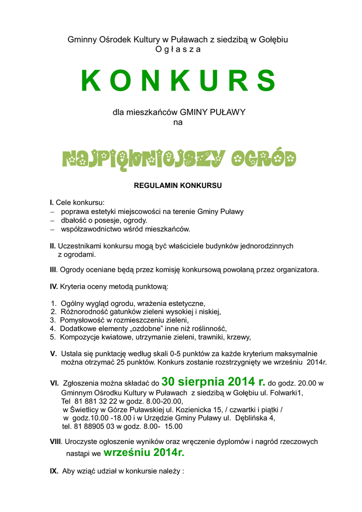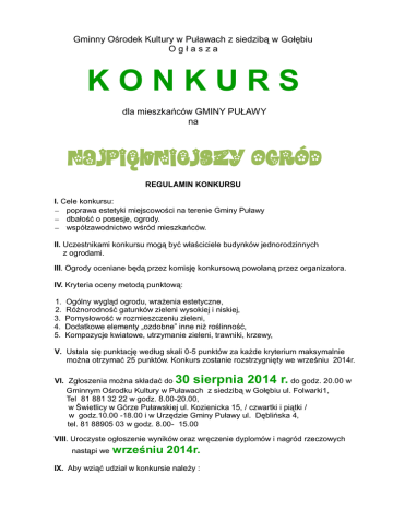 Gminny Ośrodek Kultury w Puławach z siedzibą w Gołębiu Ogłasza KONKURS dla mieszkańców GMINY PUŁAWY na NAJPIĘKNIEJSZY OGRÓD REGULAMIN KONKURSU I. Cele konkursu: poprawa estetyki miejscowości na terenie Gminy Puławy dbałość o posesje, ogrody. współzawodnictwo wśród mieszkańców. II. Uczestnikami konkursu mogą być właściciele budynków jednorodzinnych z ogrodami. III. Ogrody oceniane będą przez komisję konkursową powołaną przez organizatora. IV. Kryteria oceny metodą punktową: 1. 2. 3. 4. 5. Ogólny wygląd ogrodu, wrażenia estetyczne, Różnorodność gatunków zieleni wysokiej i niskiej, Pomysłowość w rozmieszczeniu zieleni, Dodatkowe elementy „ozdobne” inne niż roślinność, Kompozycje kwiatowe, utrzymanie zieleni, trawniki, krzewy, V. Ustala się punktację według skali 0-5 punktów za każde kryterium maksymalnie można otrzymać 25 punktów. Konkurs zostanie rozstrzygnięty we wrześniu 2014r. 30 sierpnia 2014 r. VI. Zgłoszenia można składać do do godz. 20.00 w Gminnym Ośrodku Kultury w Puławach z siedzibą w Gołębiu ul. Folwarki1, Tel 81 881 32 22 w godz. 8.00-20.00, w Świetlicy w Górze Puławskiej ul. Kozienicka 15, / czwartki i piątki / w godz.10.00 -18.00 i w Urzędzie Gminy Puławy ul. Dęblińska 4, tel. 81 88905 03 w godz. 8.00- 15.00 VIII. Uroczyste ogłoszenie wyników oraz wręczenie dyplomów i nagród rzeczowych nastąpi we wrześniu 2014r. IX. Aby wziąć udział w konkursie należy : dostarczyć do GOK w Gołębiu, kartę zgłoszenia w nieprzekraczalnym terminie do 30. 08. 2014 r. wg załączonego wzoru. IMIĘ I NAZWISKO WŁAŚCICIELA POSESJI ADRES PODPIS WŁAŚCICIELA Oświadczenie : oświadczam, że znam postanowienia regulaminu dotyczące praw autorskich oraz wyrażam zgodę na przetwarzanie moich danych osobowych przez organizatora konkursu do celów promocyjnych TEL. KONTAKTOWY karta do pobrania w GOK w Gołębiu i w Świetlicy GOK w Górze Puławskiej oraz na naszej stronie internetowej www.gokgolab.pl X. Postanowienia końcowe 1. Wszelkie pytania w sprawach konkursu prosimy kierować do GOK w Gołębiu tel. 81 881 32 22, wtorek-sobota w godz. 8.00-20.00 lub na stronę internetową www.gokgolab.pl , 2. Udział w konkursie jest równoznaczny z przyjęciem warunków regulaminu. 3. Wszelkie wątpliwości i spory rozstrzyga komisja konkursowa. Życzymy wszystkim uczestnikom konkursu wielu wrażeń i satysfakcji z podjętych działań na rzecz upiększenia własnego ogrodu.