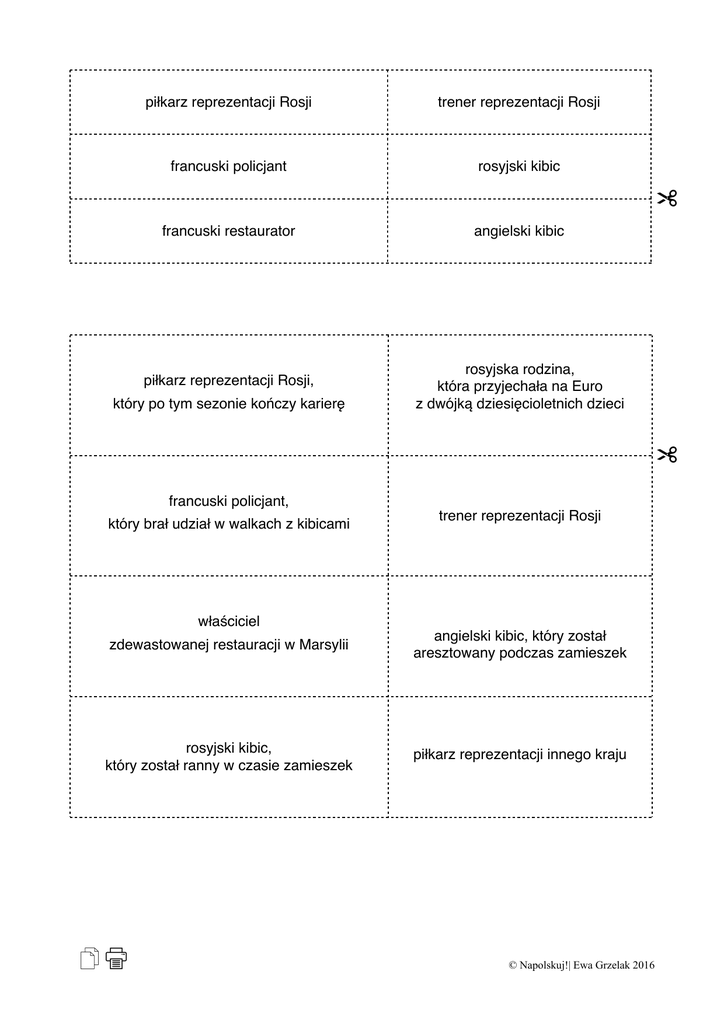 piłkarz reprezentacji Rosji trener reprezentacji Rosji francuski policjant rosyjski kibic francuski restaurator angielski kibic piłkarz reprezentacji Rosji, rosyjska rodzina, która przyjechała na Euro z dwójką dziesięcioletnich dzieci który po tym sezonie kończy karierę francuski policjant, który brał udział w walkach z kibicami właściciel trener reprezentacji Rosji zdewastowanej restauracji w Marsylii angielski kibic, który został aresztowany podczas zamieszek rosyjski kibic, który został ranny w czasie zamieszek piłkarz reprezentacji innego kraju © Napolskuj!| Ewa Grzelak 2016