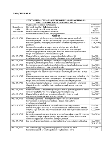 ZAŁĄCZNIK NR III Kierunkowy efekt kształcenia 02L-2A_W01 02L-2A_W02 02L-2A_W03 02L-2A_W04 02L-2A_W05 02L-2A_W06 02L-2A_W07 02L-2A_W08 02L-2A_W09 02L-2A_W10 02L-2A_W11 02L-2A_W12 02L-2A_W13 02L-2A_W14 02L-2A_W15 EFEKTY KSZTAŁCENIA DLA KIERUNKU RELIGIOZNAWSTWO IIº, WYDZIAŁ FILOZOFICZNO-HISTORYCZNY UŁ Wydział: Filozoficzno-Historyczny Kierunek studiów: Religioznawstwo Obszar kształcenia: Humanistyczny Profil kształcenia: Ogólnoakademicki Poziom kształcenia: Studia drugiego stopnia WIEDZA Ma poszerzoną wiedzę o znaczeniu religioznawstwa w naukach humanistycznych i społecznych oraz jego specyfice przedmiotowej i metodologicznej. Wiedzę tę jest w stanie twórczo wykorzystywać w praktyce. Opanował na poziomie poszerzonym wiedzę o terminologii religioznawczej oraz nauk humanistycznych z nią powiązanych, umożliwiającą bardziej precyzyjne opisanie historii i współczesności religii oraz procesów w nich zachodzących. Ma pogłębioną świadomość znaczenia religii, w historii i współczesności, różnych regionów historyczno-geograficznych Posiada pogłębioną wiedzę na temat poszczególnych systemów religijnych, ich funkcjonowania w przeszłości i teraźniejszości Dostrzega w sposób pogłębiony złożoność powiązań religioznawstwa i innych dziedzin nauki i sfer życia człowieka Rozumie interdyscyplinarność badań religioznawczych i nauk pokrewnych oraz potrzebę stosowania adekwatnych narzędzi i metod pracy Ma zaawansowaną wiedzę na temat złożoności procesów zachodzących we współczesnym świecie a związanych z historią i współczesnością religii oraz uwarunkowań społeczno-politycznych tych zjawisk Rozumie potrzebę kulturalnej wymiany myśli, otwartości i tolerancji dla odmienności poglądów, jako niezbędnego elementu postępu naukowego Ma świadomość, iż badania i dyskusja naukowa powodują rozwój nauki i zmiany poglądów na różne pojęcia, zjawiska i procesy Ma pogłębioną wiedzę na temat metod analizy, interpretacji i argumentacji oraz syntezy w pracy badawczej Posiada pogłębioną i uporządkowaną wiedzę o najnowszych kierunkach i dokonaniach w zakresie badań nad historią i współczesnością religii Ma pogłębioną świadomość kompleksowej natury języka oraz zmienności jego znaczenia w różnych okresach historycznych, a także wpływu tego zjawiska na prowadzenie badań nad wytworami kultury religijnej Rozumie znaczenie uczestniczenia w różnych aspektach współczesnego życiu kulturalnego, zapoznaje się z jego aktualną ofertę, bierze w nim udział starając się o refleksyjną ocenę wydarzeń Zna zasady prawa autorskiego i zarządzania własnością intelektualną Zna terminologię religioznawczą i powiązanych z nią nauk humanistycznych w języku polskim i wybranym obcym Odniesienie do obszarowych efektów kształcenia H2A_W01 H2A_W03 [S2A_W01] H2A_W02 H2A_W04 H2A_W05 H2A_W04 H2A_W05 H2A_W10 H2A_W03 H2A_W05 H2A_W04 H2A_W05 H2A_W04 H2A_W05 H2A_W04 H2A_W05 H2A_W07 H2A_W06 H2A_W01 H2A_W07 H2A_W09 H2A_W10 H2A_W08 [S2A_W10] H2A_W02 02L-2A_U1 02L-2A_U2 02L-2A_U3 02L-2A_U4 02L-2A_U5 02L-2A_U6 02L-2A_U7 02L-2A_U8 02L-2A_U9 02L-2A_U10 02L-2A_U11 02L-2A_U12 02L-2A_K01 02L-2A_K02 02L-2A_K03 02L-2A_K04 02L-2A_K05 02L-2A_K06 02L-2A_K07 02L-2A_K08 UMIEJĘTNOŚCI Potrafi znaleźć i wyselekcjonować, a także przeanalizować, ocenić i dokonać syntezy informacji ze źródeł tradycyjnych i elektronicznych Umie formułować krytyczne sądy na podstawie źródeł i literatury oraz wysłuchanych wypowiedzi i własnych przemyśleń Posiada pogłębione umiejętności badawcze, dzięki którym potrafi wykorzystać zdobytą wiedzę w sposób właściwy dla przedstawienia opracowywanego problemu, w formie pisemnej oraz w wypowiedziach i dyskusjach Doskonali precyzyjne wyrażanie myśli w mowie i piśmie oraz zdaje sobie sprawę ze znaczenia tej umiejętności Poszerza znajomość terminologii z zakresu religioznawstwa i nauk humanistycznych oraz wyrazów obcych, które na trwałe weszły do języka polskiego; poprawnie stosuje je w pracach pisemnych i wypowiedziach ustnych Pogłębia umiejętność pisania i redagowania różnych rodzajów tekstów w języku polskim Doskonali umiejętność merytorycznej i kulturalnej dyskusji z zastosowaniem odpowiedniej argumentacji, wykorzystaniem poglądów innych autorów i własnych przemyśleń, a także tworzenia podsumowań Umie samodzielnie zdobywać wiedzę i rozwijać umiejętności, myśleć o swoim rozwoju i przyszłej pracy zawodowej Potrafi dostrzec interdyscyplinarność zagadnień, odpowiednio łączyć wiedzę i umiejętności z zakresu różnych nauk humanistycznych i wykorzystywać je do twórczego rozwiązywania i prezentowania problemów Posiada pogłębioną umiejętność interpretacji wytworów kultury religijnej i elementów z nią powiązanych, a także umiejscowienia ich w przeszłości i teraźniejszości oraz określenia ich znaczenia dla procesów społeczno-kulturowych Potrafi komunikować się z wykorzystaniem różnych kanałów i technik informacyjnych oraz popularyzować wiedzę z zakresu religioznawstwa i nauk pokrewnych Ma umiejętności językowe i potrafi porozumieć się oraz przedstawić wyniki swoich badań w języku obcym na poziomie B2+ KOMPETENCJE PERSONALNE I SPOŁECZNE Rozumie potrzebę ciągłego zdobywania wiedzy i doskonalenia swoich umiejętności Potrafi zaplanować i zorganizować proces uczenia się i proces uczenia innych Ma świadomość znaczenia relacji interpersonalnych, tolerancji i otwartości wobec innych kultur i poglądów Prezentuje postawę otwartości i gotowości do dyskusji Umie pracować w grupie, również jako lider, i odnajdować najlepsze środki i metody prowadzące do realizacji konkretnych zadań Zdaje sobie sprawę z dylematów, które przynosi praca zawodowa Uczestniczy w promowaniu idei i działaniach dotyczących ochrony dziedzictwa kulturowego Uczestniczy w życiu kulturalnym, śledzi aktualne wyda
