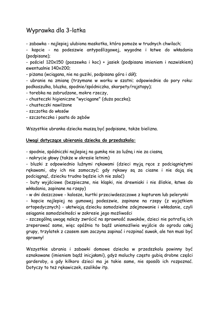 Wyprawka dla 3-latka - zabawka - najlepiej ulubiona maskotka, która pomoże w trudnych chwilach; - kapcie - na podeszwie antypoślizgowej, wygodne i łatwe do wkładania (podpisane); - pościel 120x150 (poszewka i koc) + jasiek (podpisana imieniem i nazwiskiem) ewentualnie 140x200; - piżama (wciągana, nie na guziki, podpisana góra i dół); - ubranie na zmianę (trzymane w worku w szatni; odpowiednie do pory roku: podkoszulka, bluzka, spodnie/spódniczka, skarpety/rajstopy); - torebka na zabrudzone, mokre rzeczy, - chusteczki higieniczne "wyciągane" (duża paczka); - chusteczki nawilżone - szczotka do włosów - szczoteczka i pasta do zębów Wszystkie ubranka dziecka muszą być podpisane, także bielizna. Uwagi dotyczące ubierania dziecka do przedszkola: - spodnie, spódniczki najlepiej na gumkę nie za luźną i nie za ciasną - nakrycie głowy (także w okresie letnim) - bluzki z odpowiednio luźnymi rękawami (dzieci myją ręce z podciągniętymi rękawami, aby ich nie zamoczyć; gdy rękawy są za ciasne i nie dają się podciągnąć, dziecku trudno będzie ich nie zalać) - buty wyjściowe (bezpieczne, nie klapki, nie drewniaki i nie śliskie, łatwe do wkładania, zapinane na rzepy) - w dni deszczowe - kalosze, kurtki przeciwdeszczowe z kapturem lub pelerynki - kapcie najlepiej na gumowej podeszwie, zapinane na rzepy (z wyjątkiem ortopedycznych) - ułatwiają dziecku samodzielne zdejmowanie i wkładanie, czyli osiąganie samodzielności w zakresie jego możliwości - szczególną uwagę należy zwrócić na sprawność suwaków, dzieci nie potrafią ich zreperować same, więc opóźnia to bądź uniemożliwia wyjście do ogrodu całej grupy, trzylatek z czasem sam zaczyna zapinać i rozpinać suwak, ale ten musi być sprawny! Wszystkie ubrania i zabawki domowe dziecka w przedszkolu powinny być oznakowane (imieniem bądź inicjałami), gdyż maluchy często gubią drobne części garderoby, a gdy kilkoro dzieci ma je takie same, nie sposób ich rozpoznać. Dotyczy to też rękawiczek, szalików itp.