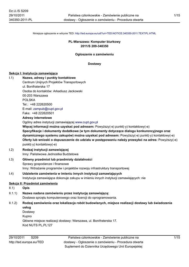 Dz.U./S S209 29/10/2011 340350-2011-PL Państwa członkowskie - Zamówienie publiczne na dostawy - Ogłoszenie o zamówieniu - Procedura otwarta 1/15 Niniejsze ogłoszenie w witrynie TED: http://ted.europa.eu/udl?uri=TED:NOTICE:340350-2011:TEXT:PL:HTML PL-Warszawa: Komputer biurkowy 2011/S 209-340350 Ogłoszenie o zamówieniu Dostawy Sekcja I: Instytucja zamawiająca I.1) Nazwa, adresy i punkty kontaktowe Centrum Unijnych Projektów Transportowych ul. Bonifraterska 17 Osoba do kontaktów: Arkadiusz Jackowski 00-203 Warszawa POLSKA Tel.: +48 222620500 E-mail: [email protected] Faks: +48 222620501 Adresy internetowe Ogólny adres instytucji zamawiającej www.cupt.gov.pl Więcej informacji można uzyskać pod adresem: Powyższy(-e) punkt(-y) kontaktowy(-e) Specyfikacje i dokumenty dodatkowe (w tym dokumenty dotyczące dialogu konkurencyjnego oraz dynamicznego systemu zakupów) można uzyskać pod adresem: Powyższy(-e) punkt(-y) kontaktowy(-e) Oferty lub wnioski o dopuszczenie do udziału w postępowaniu należy przesyłać na adres: Powyższy(-e) punkt(-y) kontaktowy(-e) I.2) Rodzaj instytucji zamawiającej Inny: Państwowa Jednostka Budżetowa I.3) Główny przedmiot lub przedmioty działalności Sprawy gospodarcze i finansowe Inny: Wdrażanie programów i projektów rozwoju infrastruktury transportowej I.4) Udzielenie zamówienia w imieniu innych instytucji zamawiających Instytucja zamawiająca dokonuje zakupu w imieniu innych instytucji zamawiających: nie Sekcja II: Przedmiot zamówienia II.1) Opis II.1.1) Nazwa nadana zamówieniu przez instytucję zamawiającą: Dostawa sprzętu komputerowego oraz licencji do oprogramowania. II.1.2) Rodzaj zamówienia oraz lokalizacja robót budowlanych, miejsce realizacji dostawy lub świadczenia usług Dostawy Kupno Główne miejsce realizacji dostawy: Warszawa, ul. Bonifraterska 17. Kod NUTS PL,PL127 29/10/2011 S209 http://ted.europa.eu/TED Państwa członkowskie - Zamówienie publiczne na dostawy - Ogłoszenie o zamówieniu - Procedura otwarta Suplement do Dziennika Urzędowego Unii Europejskiej 1/15 Dz.U./S S209 29/10/2011 340350-2011-PL Państwa członkowskie - Zamówienie publiczne na dostawy - Ogłoszenie o zamówieniu - Procedura otwarta 2/15 II.1.3) Informacje na temat zamówienia publicznego, umowy ramowej lub dynamicznego systemu zakupów (DSZ) Ogłoszenie dotyczy zamówienia publicznego II.1.4) Informacje na temat umowy ramowej II.1.5) Krótki opis zamówienia lub zakupu 1. Przedmiotem zamówienia jest dostawa sprzętu i oprogramowania komputerowego. Przedmiot zamówienia podzielony został na V następujących części: a) Część I – Dostawa sprzętu komputerowego i podzespołów komputerowych. b) Część II – Dostawa serwerów, infrastruktury serwerowej i sieciowej. c) Część III – Dostawa niszczarek oraz drukarek A3 wraz z 3 dodatkowymi kompletami tonerów. d) Część IV – Dostawa licencji do oprogramowania Microsoft lub licencji do oprogramowania równoważnego. e) Cześć V – Dostawa licencji do oprogramowania F-Secure, VisualSVN Server Enterprise lub licencji do oprogramowania równoważnego. 2. Zaoferowany przez Wykonawcę przedmiot zamówienia musi być fabrycznie nowy, kompletny, gotowy do stosowania zgodnie z przeznaczeniem, musi spełniać parametry techniczne i jakościowe nie gorsze niż wskazane w Szczegółowym opisie przedmiotu zamówienia stanowiącym Załącznik nr 5 do SIWZ – odpowiednio do części zamówienia, na którą składana jest oferta. 3. Zaoferowany przedmiot zamówienia powinien być objęty, gwarancją jakości: a) Dla części I – Dostawa sprzętu komputerowego i podzespołów komputerowych: — minimum 36 miesięcy (okres liczony od daty dostawy sprzętu do Zamawiającego). b) Dla części II – Dostawa serwerów, infrastruktury serwerowej i sieciowej: — minimum 36 miesięcy (okres liczony od daty dostawy sprzętu do Zamawiającego). c) Dla części III – Dostawa niszczarek i drukarek A3: — minimum 24 miesiące dla niszczarek, — minimum 5 letnia gwarancja na noże. (okres liczony od daty dostawy sprzętu do Zamawiającego); — minimum 36 miesięcy dla drukarek oraz, — minimum 12 miesięczny okres przydatności do użycia dla tonerów. (okres liczony od daty dostawy sprzętu do Zamawiającego); d) Dla części IV – Dostawa licencji do oprogramowania Microsoft lub licencji do oprogramowania równoważnego: — minimum 90 dniowej gwarancji jakości na dostarczone oprogramowanie i nośniki. (Okresy gwarancyjne liczone będą od dnia, w którym po raz pierwszy zostanie uruchomiona odpowiednia wersja produktu u Zamawiającego lub w przypadku nośników od dnia ich dostarczenia). e) Dla części V – Dostawa licencji do oprogramowania F-Secure, VisualSVN Server Enterprise lub licencji do oprogramowania równoważnego: — minimum 90 dniowej gwarancji jakości na dostarczone oprogramowanie i nośniki. (Okresy gwarancyjne liczone będą od dnia, w którym po raz pierwszy zostanie uruchomiona odpowiednia wersja produktu u Zamawiającego lub w przypadku nośników od dnia ich dostarczenia). 4. Numer referencyjny nadany zamówieniu: Nr 14/ZAM/2011. 5. Zamawiający w przypadku wskazania nazwy sprzętu, oprogramowania lub powołania się na normy dopuszcza zaoferowanie rozwiązań równoważnych opisywanym. W przypadku zaoferowania sprzętu równoważnego i/lub/oraz oprogramowania równoważnego, Wykonawca będzie zobowiązany udowodnić, że oferowane dostawy spełniają wymagania określone przez Zamawiającego. II.1.6) Wspólny Słownik Zamówień (CPV) 29/10/2011 S209 http://ted.europa.eu/TED Państwa członkowskie - Zamówienie publiczne na dostawy - Ogłoszenie o zamówieniu - Procedura otwarta Suplement do Dziennika Urzędowego Unii Europejskiej 2/15 Dz.U./S S209 29/10/2011 340350-2011-PL Państwa członkowskie - Zamówienie publiczne na dostawy - Ogłoszenie o zamówieniu - Procedura otwarta 3/15 30213300, 30232110, 32422000, 32424000, 32427000, 30237280, 48820000, 48821000, 