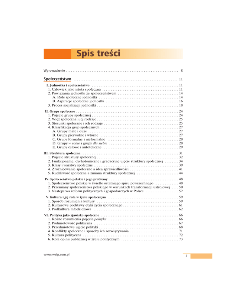 Spis treÊci Wprowadzenie . . . . . . . . . . . . . . . . . . . . . . . . . . . . . . . . . . . . . . . . . . . . . . . . . . . . . . . . . . . . . . . . . 8 Spo∏eczeƒstwo . . . . . . . . . . . . . . . . . . . . . . . . . . . . . . . . . . . . . . . . . . . . . . . . . . . . . . . . . . . . 11 I. Jednostka i spo∏eczeƒstwo . . . . . . . . . . . . . . . . . . . . . . . . . . . . . . . . . . . . . . . . . . . . . . . . . . 11 1. Cz∏owiek jako istota spo∏eczna . . . . . . . . . . . . . . . . . . . . . . . . . . . . . . . . . . . . . . . . . . . . 11 2. Powiàzania jednostki ze spo∏eczeƒstwem . . . . . . . . . . . . . . . . . . . . . . . . . . . . . . . . . . . 14 A. Role spo∏eczne jednostki . . . . . . . . . . . . . . . . . . . . . . . . . . . . . . . . . . . . . . . . . . . . . . 14 B. Aspiracje spo∏eczne jednostki . . . . . . . . . . . . . . . . . . . . . . . . . . . . . . . . . . . . . . . . . . 16 3. Proces socjalizacji jednostki . . . . . . . . . . . . . . . . . . . . . . . . . . . . . . . . . . . . . . . . . . . . . . . 18 II. Grupy spo∏eczne . . . . . . . . . . . . . . . . . . . . . . . . . . . . . . . . . . . . . . . . . . . . . . . . . . . . . . . . . . . 24 1. Poj´cie grupy spo∏ecznej . . . . . . . . . . . . . . . . . . . . . . . . . . . . . . . . . . . . . . . . . . . . . . . . . . 24 2. Wi´ê spo∏eczna i jej rodzaje . . . . . . . . . . . . . . . . . . . . . . . . . . . . . . . . . . . . . . . . . . . . . . . 25 3. Stosunki spo∏eczne i ich rodzaje . . . . . . . . . . . . . . . . . . . . . . . . . . . . . . . . . . . . . . . . . . . 25 4. Klasyfikacja grup spo∏ecznych . . . . . . . . . . . . . . . . . . . . . . . . . . . . . . . . . . . . . . . . . . . . . 27 A. Grupy ma∏e i du˝e . . . . . . . . . . . . . . . . . . . . . . . . . . . . . . . . . . . . . . . . . . . . . . . . . . . . 27 B. Grupy pierwotne i wtórne . . . . . . . . . . . . . . . . . . . . . . . . . . . . . . . . . . . . . . . . . . . . . 27 C. Grupy formalne i nieformalne . . . . . . . . . . . . . . . . . . . . . . . . . . . . . . . . . . . . . . . . . 28 D. Grupy w sobie i grupy dla siebie . . . . . . . . . . . . . . . . . . . . . . . . . . . . . . . . . . . . . . . . 28 E. Grupy celowe i autoteliczne . . . . . . . . . . . . . . . . . . . . . . . . . . . . . . . . . . . . . . . . . . . . 29 III. Struktura spo∏eczna . . . . . . . . . . . . . . . . . . . . . . . . . . . . . . . . . . . . . . . . . . . . . . . . . . . . . . . . 31 1. Poj´cie struktury spo∏ecznej . . . . . . . . . . . . . . . . . . . . . . . . . . . . . . . . . . . . . . . . . . . . . . . 32 2. Funkcjonalne, dychotomiczne i gradacyjne uj´cie struktury spo∏ecznej . . . . . . . . 34 3. Klasy i warstwy spo∏eczne . . . . . . . . . . . . . . . . . . . . . . . . . . . . . . . . . . . . . . . . . . . . . . . . . 39 4. Zró˝nicowanie spo∏eczne a idea sprawiedliwoÊci . . . . . . . . . . . . . . . . . . . . . . . . . . . . 41 5. RuchliwoÊç spo∏eczna a zmiana struktury spo∏ecznej . . . . . . . . . . . . . . . . . . . . . . . . 44 IV. Spo∏eczeƒstwo polskie i jego problemy . . . . . . . . . . . . . . . . . . . . . . . . . . . . . . . . . . . . . . . . 48 1. Spo∏eczeƒstwo polskie w Êwietle ostatniego spisu powszechnego . . . . . . . . . . . . . . 48 2. Przemiany spo∏eczeƒstwa polskiego w warunkach transformacji ustrojowej . . . . 50 3. Nast´pstwa reform politycznych i gospodarczych w Polsce . . . . . . . . . . . . . . . . . . . 52 V. Kultura i jej rola w ˝yciu spo∏ecznym . . . . . . . . . . . . . . . . . . . . . . . . . . . . . . . . . . . . . . . . . 59 1. Sposób rozumienia kultury . . . . . . . . . . . . . . . . . . . . . . . . . . . . . . . . . . . . . . . . . . . . . . . 59 2. Kulturowe podstawy etyki ˝ycia spo∏ecznego . . . . . . . . . . . . . . . . . . . . . . . . . . . . . . . . 61 3. Podkultura m∏odzie˝owa . . . . . . . . . . . . . . . . . . . . . . . . . . . . . . . . . . . . . . . . . . . . . . . . . 62 VI. Polityka jako zjawisko spo∏eczne . . . . . . . . . . . . . . . . . . . . . . . . . . . . . . . . . . . . . . . . . . . . . 66 1. Ró˝ne rozumienia poj´cia polityka . . . . . . . . . . . . . . . . . . . . . . . . . . . . . . . . . . . . . . . . . 66 2. PodmiotowoÊç polityczna . . . . . . . . . . . . . . . . . . . . . . . . . . . . . . . . . . . . . . . . . . . . . . . . . 67 3. Przedmiotowe uj´cie polityki . . . . . . . . . . . . . . . . . . . . . . . . . . . . . . . . . . . . . . . . . . . . . . 68 4. Konflikty spo∏eczne i sposoby ich rozwiàzywania . . . . . . . . . . . . . . . . . . . . . . . . . . . . 71 5. Kultura polityczna . . . . . . . . . . . . . . . . . . . . . . . . . . . . . . . . . . . . . . . . . . . . . . . . . . . . . . . 72 6. Rola opinii publicznej w ˝yciu politycznym . . . . . . . . . . . . . . . . . . . . . . . . . . . . . . . . . 73 www.wsip.com.pl 3 Spis treÊci Polityka . . . . . . . . . . . . . . . . . . . . . . . . . . . . . . . . . . . . . . . . . . . . . . . . . . . . . . . . . . . . . . . . . . . . 78 I. Czym jest demokracja . . . . . . . . . . . . . . . . . . . . . . . . . . . . . . . . . . . . . . . . . . . . . . . . . . . . . . 78 1. Istota demokracji . . . . . . . . . . . . . . . . . . . . . . . . . . . . . . . . . . . . . . . . . . . . . . . . . . . . . . . . 78 2. Fundamentalne zasady demokracji . . . . . . . . . . . . . . . . . . . . . . . . . . . . . . . . . . . . . . . . 80 A. Antyczne i chrzeÊcijaƒskie korzenie demokracji . . . . . . . . . . . . . . . . . . . . . . . . 80 B. Kszta∏towanie si´ wspó∏czesnych zasad demokracji . . . . . . . . . . . . . . . . . . . . . 83 II. Demokracja w naszych czasach . . . . . . . . . . . . . . . . . . . . . . . . . . . . . . . . . . . . . . . . . . . . 86 1. Rozwój wspó∏czesnej demokracji . . . . . . . . . . . . . . . . . . . . . . . . . . . . . . . . . . . . . . . 86 2. Zasady wspó∏czesnych demokracji . . . . . . . . . . . . . . . . . . . . . . . . . . . . . . . . . . . . . . 88 3. Rodzaj