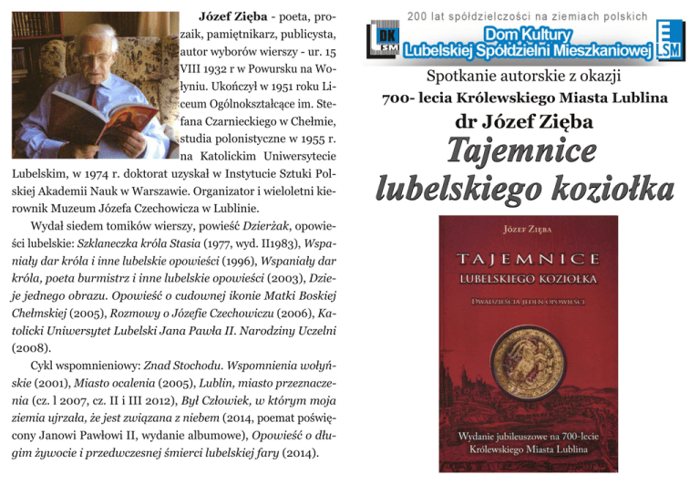 Józef Zięba poeta, pro zaik, pamiętnikarz, publicysta, autor wyborów wierszy ur. 15 VIII 1932 r w Powursku na Wo łyniu. Ukończył w 1951 roku Li ceum Ogólnokształcące im. Ste fana Czarnieckiego w Chełmie, studia polonistyczne w 1955 r. na Katolickim Uniwersytecie Lubelskim, w 1974 r. doktorat uzyskał w Instytucie Sztuki Pol skiej Akademii Nauk w Warszawie. Organizator i wieloletni kie rownik Muzeum Józefa Czechowicza w Lublinie. Wydał siedem tomików wierszy, powieść Dzierżak, opowie ści lubelskie: Szklaneczka króla Stasia (1977, wyd. II1983), Wspa niały dar króla i inne lubelskie opowieści (1996), Wspaniały dar króla, poeta burmistrz i inne lubelskie opowieści (2003), Dzie je jednego obrazu. Opowieść o cudownej ikonie Matki Boskiej Chełmskiej (2005), Rozmowy o Józefie Czechowiczu (2006), Ka tolicki Uniwersytet Lubelski Jana Pawła II. Narodziny Uczelni (2008). Cykl wspomnieniowy: Znad Stochodu. Wspomnienia wołyń skie (2001), Miasto ocalenia (2005), Lublin, miasto przeznacze nia (cz. l 2007, cz. II i III 2012), Był Człowiek, w którym moja ziemia ujrzała, że jest związana z niebem (2014, poemat poświę cony Janowi Pawłowi II, wydanie albumowe), Opowieść o dłu gim żywocie i przedwczesnej śmierci lubelskiej fary (2014). Spotkanie autorskie z okazji 700 lecia Królewskiego Miasta Lublina dr Józef Zięba Tajemnice lubelskiego koziołka Piąte już, wzbogacone ilustracjami, jubileuszowe wydanie lubelskich opowieści, kształtowało się niemal przez czterdzieści lat. Pierwsze bowiem zatytułowane Szklaneczka króla Stasia ukazało się w nieistniejącym już Wy dawnictwie Lubelskim w 1977 roku. Zawierało dziewięć opowieści. Kolejne wydania były wzbogacane nowymi, by jubileuszowe osiągnęło liczbę dwa dzieścia jeden. Książka rozrastała się niemal jak Lublin przez stulecia, któ ry z niewielkich osiedli i grodów przezwyciężając pożogi, najazdy, morowe powietrze i dziejowe klęski, stał się metropolią. Niezwykłe piękno miasta podziwiają dziś krajowi i zagraniczni turyści, a rodowici i zasiedziali mieszkańcy obdarzają je przywiązaniem i miłością, dumni z bogatej, historycznej przeszłości. Na Czwartku, na wzgórzu zamkowym, Grodzisku, nad brzegami By strzycy, Czechówki i Czerniejówki i na obecnym Starym Mieście powstawa ły bowiem od szóstego wieku kolejne osiedla i grody, ale nie było nigdy dłuż szego okresu, by zanikło tu ludzkie osadnictwo. Ślady bytowania dawnych lublinian przechowała ziemia. Wydobywają je archeolodzy. Udostępnia zwiedzającym w Muzeum na Zamku stała ar cheologiczna wystawa. Plastyczne makiety rozwoju miasta można oglądać w lubelskich podziemiach. Archeolodzy nie są jednak w stanie stwierdzić, kiedy powstała nazwa miasta. Językoznawcy wywodzą ją od imienia „Lu bią" Gród Lubli Lublin, jak od Zosi Zosin, od Maryni Marynin. Brak jed nak na to udokumentowanego potwierdzenia. Z dziejowych mroków przy wołuje tu „Lubię" owiana pierwotną miłością legenda. Pozostałe opowieści z jubileuszowego tomu zostały oparte na faktach potwierdzonych w dokumentach i naukowych opracowaniach. (Niektóre z nich wymieniono po każdej opowieści.) Epokowym i przełomowym wydarzeniem w dziejach Lublina była roz poczęta na początku XI wieku chrystianizacja. Można więc obchodzić w 2017 roku nawet trzy jubileusze: piętnastu wieków stałego osadnictwa, tysiącle cie chrystianizacji i siedemsetlecie uzyskania prawa miejskiego. Przedstawione obrazki obyczajowe ułatwiają zrozumieć czasy, których już nie ma. Opowieści skupiają się głównie na wydarzeniach i ludziach sze roko rozumianej kultury, gdyż to oni kształtowali przez wieki i kształtują obecnie prawdziwy wizerunek miasta. Marginalnie zostali przywołani bu downiczowie domów, kościołów i urbaniści wytyczający ciągi ulic, tworzą cy dzisiejszy obraz Lublina. Czekają na należne im miejsce w naszej pamięci. Ciąg lubelskich opowieści rozpoczynają dzieje pierwotnej miłości i wiel kiego przywiązania, do miejsca, które się lubi. Kończy też opowieść o wiel kiej miłości do Lublina poety, Józefa Łobodowskiego, który jako polityczny emigrant marzył w Madrycie, by chociaż jego prochy spoczęły w grobie mat ki, na lubelskim cmentarzu przy ulicy Lipowej, żeby mu śpiewały wiosną lu belskie cmentarne słowiki. Lublin od piętnastu wieków był życzliwym miejscem przyciągającym ludzi. Dla wielu jego mieszkańców stał się jedynym miejscem na ziemi. Ta kim miejscem zapewne zostanie przez następne pokolenia i wieki. Józef Zięba ,Tajemnice lubelskiego koziołka, Wprowadzenie, Lublin 201 6, s. 7-8 Spotkanie autorskie z okazji 700 lecia Królewskiego Miasta Lublina dr Józef Zięba Tajemnice lubelskiego koziołka Fragmenty tekstu czytają Katarzyna Michalczak i Anna WójcikMiroń Spotkanie odbędzie się w poniedziałek 16 maja 2016 r. o godz. 18.00 w sali widowiskowej Domu Kultury LSM w Lublinie, ul. K. Wallenroda 4a, tel. 81 743 48 29 www.domkulturylsm.pl W s t ę p w ol n y W czasie spotkania będzie można nabyć książkę pt. Tajemnice lubelskiego koziołka Wydawnictwo POLIHYMNIA, Lublin 201 6