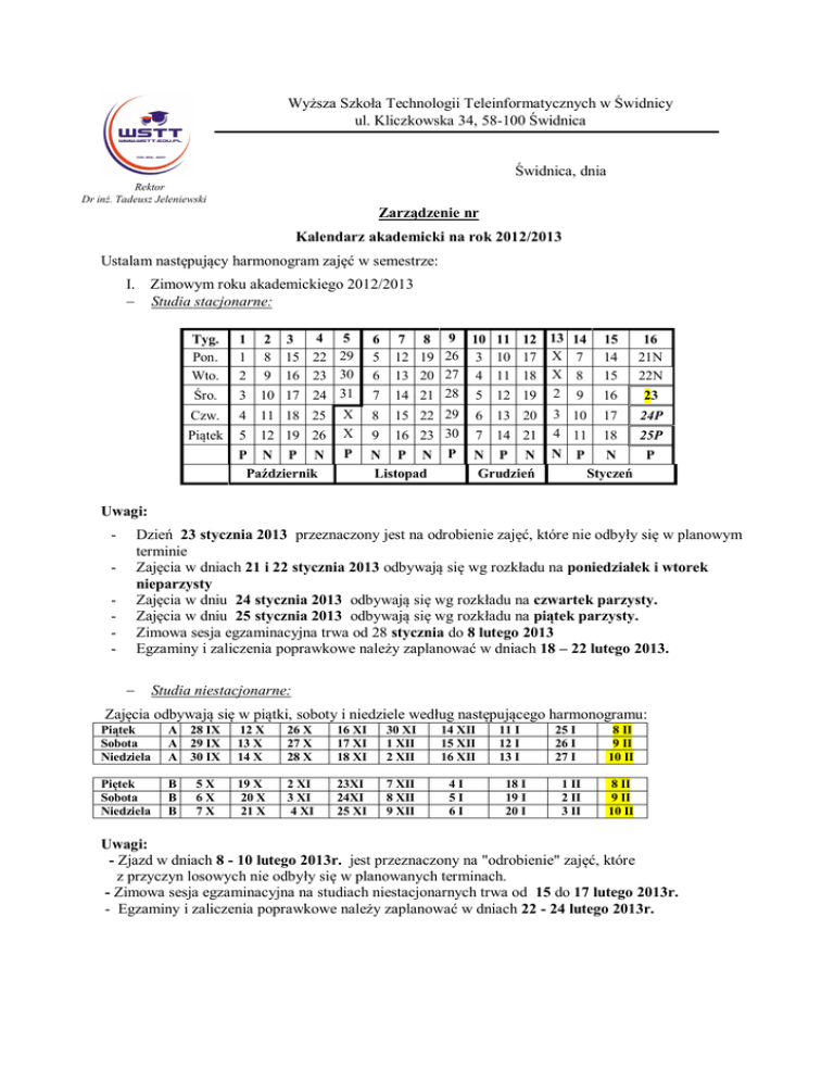 Wyższa Szkoła Technologii Teleinformatycznych w Świdnicy ul. Kliczkowska 34, 58-100 Świdnica Świdnica, dnia Rektor Dr inż. Tadeusz Jeleniewski Zarządzenie nr Kalendarz akademicki na rok 2012/2013 Ustalam następujący harmonogram zajęć w semestrze: I. Zimowym roku akademickiego 2012/2013 Studia stacjonarne: Tyg. Pon. Wto. 1 1 2 Śro. 3 Czw. 4 Piątek 5 4 5 3 15 22 29 16 23 30 10 17 24 31 11 18 25 X 12 19 26 X 2 8 9 P N P N Październik P 7 8 9 10 11 12 13 14 15 12 19 26 3 10 17 X 7 14 13 20 27 4 11 18 X 8 15 7 14 21 28 5 12 19 2 9 16 8 15 22 29 6 13 20 3 10 17 9 16 23 30 7 14 21 4 11 18 N P N P N P N N P N Listopad Grudzień Styczeń 6 5 6 16 21N 22N 23 24P 25P P Uwagi: - Dzień 23 stycznia 2013 przeznaczony jest na odrobienie zajęć, które nie odbyły się w planowym terminie Zajęcia w dniach 21 i 22 stycznia 2013 odbywają się wg rozkładu na poniedziałek i wtorek nieparzysty Zajęcia w dniu 24 stycznia 2013 odbywają się wg rozkładu na czwartek parzysty. Zajęcia w dniu 25 stycznia 2013 odbywają się wg rozkładu na piątek parzysty. Zimowa sesja egzaminacyjna trwa od 28 stycznia do 8 lutego 2013 Egzaminy i zaliczenia poprawkowe należy zaplanować w dniach 18 – 22 lutego 2013. Studia niestacjonarne: Zajęcia odbywają się w piątki, soboty i niedziele według następującego harmonogramu: Piątek Sobota Niedziela A A A 28 IX 29 IX 30 IX 12 X 13 X 14 X 26 X 27 X 28 X 16 XI 17 XI 18 XI 30 XI 1 XII 2 XII 14 XII 15 XII 16 XII Piętek Sobota Niedziela B B B 5X 6X 7X 19 X 20 X 21 X 2 XI 3 XI 4 XI 23XI 24XI 25 XI 7 XII 8 XII 9 XII 4I 5I 6I 11 I 12 I 13 I 18 I 19 I 20 I 25 I 26 I 27 I 1 II 2 II 3 II 8 II 9 II 10 II 8 II 9 II 10 II Uwagi: - Zjazd w dniach 8 - 10 lutego 2013r. jest przeznaczony na "odrobienie" zajęć, które z przyczyn losowych nie odbyły się w planowanych terminach. - Zimowa sesja egzaminacyjna na studiach niestacjonarnych trwa od 15 do 17 lutego 2013r. - Egzaminy i zaliczenia poprawkowe należy zaplanować w dniach 22 - 24 lutego 2013r. II. Letnim roku akademickiego 2012/2013 Studia stacjonarne: Tyg. 1 2 5 6 7 8 Pon. Wto. 25 26 4 11 18 25 5 12 19 26 X X 8 9 15 22 29 16 23 30 Śro. 27 6 13 20 27 3 10 17 24 Czw. 28 7 14 21 28 4 1 8 15 22 5 Piątek N P Luty 3 4 N P Marzec X N P 9 10 11 12 13 14 15 16 6 7 13 20 27 14 21 28 3 X 8 15 22 29 5 11 18 25 X 9 16 23 X 6 10PnP 17 CP 11WP 18 PtP 12 12ŚP X 13CP 12 19 26 X 10 17 24 X 7 14PtP P N N P N Kwiecień P N P N Maj 4 X P N Czerwiec Uwagi: - Zajęcia w dniach 10 – 14 czerwca 2013r. odbywają się wg rozkładu tygodnia parzystego. Zajęcia w dniach 17 - 18 czerwca 2013r. odbywają się wg rozkładu na czwartek i piątek parzysty Dzień 19 czerwca 2013r. jest przeznaczony na "odrobienie" zajęć, które z przyczyn losowych nie odbyły się w zaplanowanych terminach Letnia sesja egzaminacyjna trwa od 24 czerwca do5 lipca 2013r. Egzaminy i zaliczenia poprawkowe należy zaplanować w dniach 16 – 20 września 2013r. Studia niestacjonarne: Zajęcia odbywają się w piątki, soboty i niedziele według następującego harmonogramu: Piątek Sobota Niedziela A A A 1 III 2 III 3 III 15 III 16 III 17 III 5 IV 6 IV 7 IV 19 IV 20 IV 21 IV 10 V 11 V 12 V 24 V 25 V 26 V 7 VI 8 VI 9 VI 21 VI 22 VI 23 VI 5 VII 6 VII 7 VII Piątek Sobota Niedziela B B B 8 III 9 III 10 III 22 III 23 III 24 III 12 IV 13 IV 14 IV 26 IV 27 IV 28 IV 17 V 18 V 19 V 31 V 1 VI 2 VI 14 VI 15 VI 16 VI 28 VI 29 VI 30 VI 5 VII 6 VII 7 VII Uwagi: - Zjazd w dniach 5 - 7 lipca 2013 jest przeznaczony na "odrobienie" zajęć, które z przyczyn losowych nie odbyły się w planowanych terminach. - Letnia sesja egzaminacyjna na studiach niestacjonarnych trwa od 12 do 14 lipca 2013r. - Egzaminy i zaliczenia poprawkowe należy zaplanować w dniach od 20 do 22 września 2013r. Rektor Wyższej Szkoły Technologii Teleinformatycznych Dr inż. Tadeusz Jeleniewski