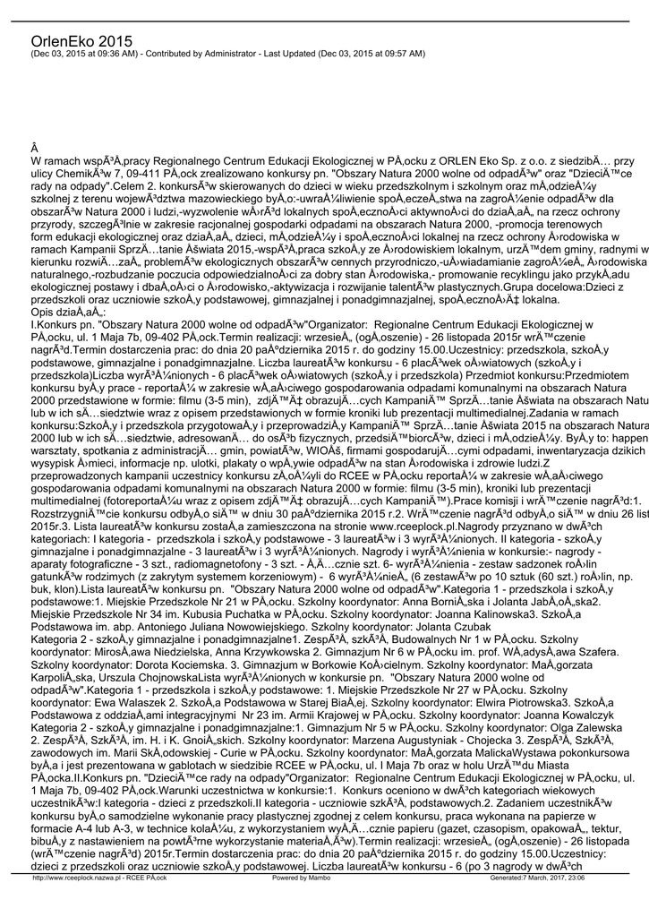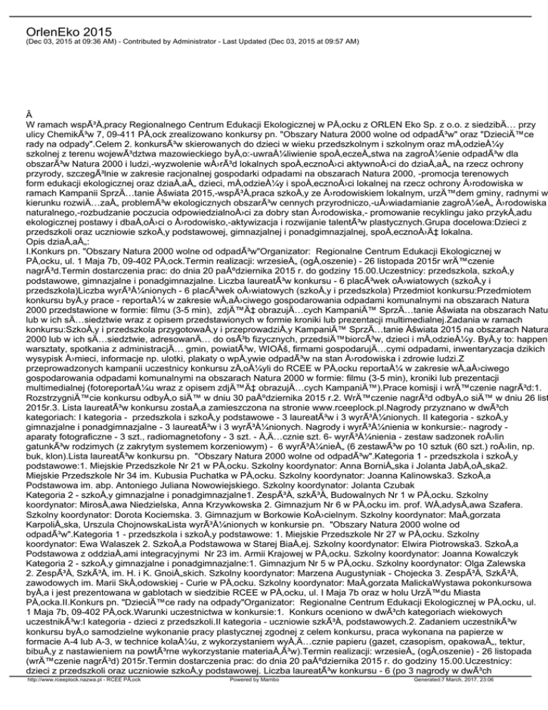 OrlenEko 2015 (Dec 03, 2015 at 09:36 AM) - Contributed by Administrator - Last Updated (Dec 03, 2015 at 09:57 AM)  W ramach współpracy Regionalnego Centrum Edukacji Ekologicznej w Płocku z ORLEN Eko Sp. z o.o. z siedzibą przy ulicy Chemików 7, 09-411 Płock zrealizowano konkursy pn. "Obszary Natura 2000 wolne od odpadów" oraz "Dziecięce rady na odpady".Celem 2. konkursów skierowanych do dzieci w wieku przedszkolnym i szkolnym oraz młodzieży szkolnej z terenu województwa mazowieckiego było:-uwrażliwienie społeczeństwa na zagrożenie odpadów dla obszarów Natura 2000 i ludzi,-wyzwolenie wśród lokalnych społeczności aktywności do działań na rzecz ochrony przyrody, szczególnie w zakresie racjonalnej gospodarki odpadami na obszarach Natura 2000, -promocja terenowych form edukacji ekologicznej oraz działań dzieci, młodzieży i społeczności lokalnej na rzecz ochrony środowiska w ramach Kampanii Sprzątanie Świata 2015,-współpraca szkoły ze środowiskiem lokalnym, urzędem gminy, radnymi w kierunku rozwiązań problemów ekologicznych obszarów cennych przyrodniczo,-uświadamianie zagrożeń środowiska naturalnego,-rozbudzanie poczucia odpowiedzialności za dobry stan środowiska,- promowanie recyklingu jako przykładu ekologicznej postawy i dbałości o środowisko,-aktywizacja i rozwijanie talentów plastycznych.Grupa docelowa:Dzieci z przedszkoli oraz uczniowie szkoły podstawowej, gimnazjalnej i ponadgimnazjalnej, społeczność lokalna. Opis działań: I.Konkurs pn. "Obszary Natura 2000 wolne od odpadów"Organizator: Regionalne Centrum Edukacji Ekologicznej w Płocku, ul. 1 Maja 7b, 09-402 Płock.Termin realizacji: wrzesień (ogłoszenie) - 26 listopada 2015r wręczenie nagród.Termin dostarczenia prac: do dnia 20 października 2015 r. do godziny 15.00.Uczestnicy: przedszkola, szkoły podstawowe, gimnazjalne i ponadgimnazjalne. Liczba laureatów konkursu - 6 placówek oświatowych (szkoły i przedszkola)Liczba wyróżnionych - 6 placówek oświatowych (szkoły i przedszkola) Przedmiot konkursu:Przedmiotem konkursu były prace - reportaż w zakresie właściwego gospodarowania odpadami komunalnymi na obszarach Natura 2000 przedstawione w formie: filmu (3-5 min), zdjęć obrazujących Kampanię Sprzątanie Świata na obszarach Natu lub w ich sąsiedztwie wraz z opisem przedstawionych w formie kroniki lub prezentacji multimedialnej.Zadania w ramach konkursu:Szkoły i przedszkola przygotowały i przeprowadziły Kampanię Sprzątanie Świata 2015 na obszarach Natura 2000 lub w ich sąsiedztwie, adresowaną do osób fizycznych, przedsiębiorców, dzieci i młodzieży. Były to: happeni warsztaty, spotkania z administracją gmin, powiatów, WIOŚ, firmami gospodarującymi odpadami, inwentaryzacja dzikich wysypisk śmieci, informacje np. ulotki, plakaty o wpływie odpadów na stan środowiska i zdrowie ludzi.Z przeprowadzonych kampanii uczestnicy konkursu złożyli do RCEE w Płocku reportaż w zakresie właściwego gospodarowania odpadami komunalnymi na obszarach Natura 2000 w formie: filmu (3-5 min), kroniki lub prezentacji multimedialnej (fotoreportażu wraz z opisem zdjęć obrazujących Kampanię).Prace komisji i wręczenie nagród:1. Rozstrzygnięcie konkursu odbyło się w dniu 30 października 2015 r.2. Wręczenie nagród odbyło się w dniu 26 list 2015r.3. Lista laureatów konkursu została zamieszczona na stronie www.rceeplock.pl.Nagrody przyznano w dwóch kategoriach: I kategoria - przedszkola i szkoły podstawowe - 3 laureatów i 3 wyróżnionych. II kategoria - szkoły gimnazjalne i ponadgimnazjalne - 3 laureatów i 3 wyróżnionych. Nagrody i wyróżnienia w konkursie:- nagrody aparaty fotograficzne - 3 szt., radiomagnetofony - 3 szt. - łącznie szt. 6- wyróżnienia - zestaw sadzonek roślin gatunków rodzimych (z zakrytym systemem korzeniowym) - 6 wyróżnień (6 zestawów po 10 sztuk (60 szt.) roślin, np. buk, klon).Lista laureatów konkursu pn. "Obszary Natura 2000 wolne od odpadów".Kategoria 1 - przedszkola i szkoły podstawowe:1. Miejskie Przedszkole Nr 21 w Płocku. Szkolny koordynator: Anna Bornińska i Jolanta Jabłońska2. Miejskie Przedszkole Nr 34 im. Kubusia Puchatka w Płocku. Szkolny koordynator: Joanna Kalinowska3. Szkoła Podstawowa im. abp. Antoniego Juliana Nowowiejskiego. Szkolny koordynator: Jolanta Czubak Kategoria 2 - szkoły gimnazjalne i ponadgimnazjalne1. Zespół szkół Budowalnych Nr 1 w Płocku. Szkolny koordynator: Mirosława Niedzielska, Anna Krzywkowska 2. Gimnazjum Nr 6 w Płocku im. prof. Władysława Szafera. Szkolny koordynator: Dorota Kociemska. 3. Gimnazjum w Borkowie Kościelnym. Szkolny koordynator: Małgorzata Karpolińska, Urszula ChojnowskaLista wyróżnionych w konkursie pn. "Obszary Natura 2000 wolne od odpadów".Kategoria 1 - przedszkola i szkoły podstawowe: 1. Miejskie Przedszkole Nr 27 w Płocku. Szkolny koordynator: Ewa Walaszek 2. Szkoła Podstawowa w Starej Białej. Szkolny koordynator: Elwira Piotrowska3. Szkoła Podstawowa z oddziałami integracyjnymi Nr 23 im. Armii Krajowej w Płocku. Szkolny koordynator: Joanna Kowalczyk Kategoria 2 - szkoły gimnazjalne i ponadgimnazjalne:1. Gimnazjum Nr 5 w Płocku. Szkolny koordynator: Olga Zalewska 2. Zespół Szkół im. H. i K. Gnoińskich. Szkolny koordynator: Marzena Augustyniak - Chojecka 3. Zespół Szkół zawodowych im. Marii Skłodowskiej - Curie w Płocku. Szkolny koordynator: Małgorzata MalickaWystawa pokonkursowa była i jest prezentowana w gablotach w siedzibie RCEE w Płocku, ul. I Maja 7b oraz w holu Urzędu Miasta Płocka.II.Konkurs pn. "Dziecięce rady na odpady"Organizator: Regionalne Centrum Edukacji Ekologicznej w Płocku, ul. 1 Maja 7b, 09-402 Płock.Warunki uczestnictwa w konkursie:1. Konkurs oceniono w dwóch kategoriach wiekowych uczestników:I kategoria - dzieci z przedszkoli.II kategoria - uczniowie szkół podstawowych.2. Zadaniem uczestników konkursu było samodzielne wykonanie pracy plastycznej zgodnej z celem konkursu, 
