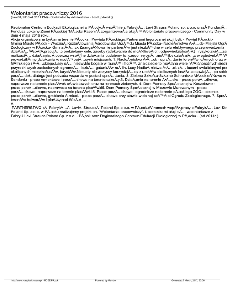 Wolontariat pracowniczy 2016 (Jun 08, 2016 at 02:11 PM) - Contributed by Administrator - Last Updated () Regionalne Centrum Edukacji Ekologicznej w Płocku wspólnie z Fabryką Levi Strauss Poland sp. z o.o. oraz Fundacją Fundusz Lokalny Ziemi Płockiej "Młodzi Razem" zorganizowała akcję Wolontariatu pracowniczego - Community Day w dniu 4 maja 2016 roku. Akcja organizowana była na terenie Płocka i Powiatu Płockiego.Partnerami tegorocznej akcji byli: - Powiat Płocki,Gmina Miasto Płock - Wydział Kształtowania Środowiska Urzędu Miasta Płocka- Nadleśnictwo ŕąck- Miejski Ogrà Zoologiczny w Płocku- Gmina ŕąck Zaangażowanie partnerów jest niezbędne w celu efektywnego przeprowadzenia działań. Współpracując podzielamy cele, zasoby (adekwatnie do możliwości), odpowiedzialność i ryzyko związan realizacją działania. A poprzez wspólne działania budujemy to, czego nie osiągnęliby działając w pojedynkę.W prowadziliśmy działania w następujących miejscach: 1. Nadleśnictwo ŕąck - sprzątanie terenów leśnych oraz wo Górskiego i ŕąckiego.Lasy są niezwykle bogate w faunę i florę. Znajdziecie to można wiele różnorodnych siedli przyrodniczych zasiedlonych ogromną liczbą gatunków roślin. Lasy Nadleśnictwa ŕąck są lasami uwielbianymi prz okolicznych mieszkańców, turystów.Niestety nie wszyscy korzystający z uroków okolicznych lasów zostawiają po sobie porządek, dlatego jest potrzeba wsparcia w postaci sprzątania. 2. Zielona Szkoła-Szkolne Schronisko Młodzieżowe w Sendeniu - prace remontowe i porządkowe na terenie szkoły.3. Działania na terenie ŕącka - prace porządkowe, naprawcze na terenie placówek oświatowych oraz na terenach zielonych. 4. Dom Pomocy Społecznej w Koszelewie prace porządkowe, naprawcze na terenie placówki5. Dom Pomocy Społecznej w Miszewie Murowanym - prace porządkowe, naprawcze na terenie placówki.6. Prace porządkowe i ogrodnicze na terenie płockiego ZOO.- pielenie, prace porządkowe, grabienie śmieci, - prace porządkowe przy stawie w dolnej części Ogrodu Zoologicznego. 7. Sprzą terenów bulwarów i plaży nad Wisłą.  PARTNERSTWO z Fabryką Levi Strauss Poland Sp. z o.o. w PłockuW ramach współpracy z Fabryką Levi Stra Poland Sp. z o.o. w Płocku realizujemy projekt pn. "Wolontariat pracowniczy". Uczestnikami akcji są wolontariusze z Fabryki Levi Strauss Poland Sp. z o.o. - Płock oraz Regionalnego Centrum Edukacji Ekologicznej w Płocku - (od 2014r.). http://www.rceeplock.nazwa.pl - RCEE Płock Powered by Mambo Generated:7 March, 2017, 23:06