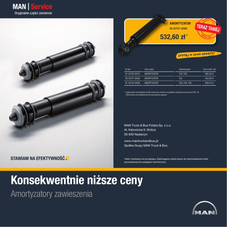 AMORTYZATOR 85.43701-6006 532,60 zł * Cena netto* [zł] Nr kat. Opis części Zastosowanie 81.43702-6075 AMORTYZATOR TGX, TGS 890,30 zł 85.43701-6006 AMORTYZATOR TGL 532,60 zł 81.43702-6058 AMORTYZATOR TGA, TGX, TGS 649,10 zł * Sugerowana cena detaliczna netto może ulec zmianie w przypadku znaczącej zmiany kursu EUR / ZŁ. Oferta ważna do odwołania lub do wyczerpania zapasów. MAN Truck & Bus Polska Sp. z o.o. Al. Katowicka 9, Wolica 05-830 Nadarzyn www.mantruckandbus.pl Spółka Grupy MAN Truck & Bus Tekst i ilustracje nie są wiążące. Zastrzegamy sobie prawo do wprowadzania zmian spowodowanych postępem technicznym. Konsekwentnie niższe ceny Amortyzatory zawieszenia