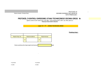 PROTOKÓŁ Nr ODCINEK EWIDENCYJNY DROGI Nr DATA PRZEGLĄDU : Nazwa zarządcy / Zarządu Drogi PROTOKÓŁ Z KONTROLI OKRESOWEJ STANU TECHNICZNEGO ODCINKA DROGI Nr zgodnie z art.62 ust.1 pkt.1 ustawy z dnia 7 lipca 1994 r. - Prawo budowlane (Dz.U. z 2013 r. poz. 1409, z późń. zm.) PRZEGLĄD PODSTAWOWY (ROCZNYI) części "A" - "F" - OCENA TECHNICZNA DROGI Przebieg drogi : Długość drogi [m] Węzeł początkowy Węzeł końcowy od do Ocena wynikowa dla drogi (część techniczna) : pkt ` nr upr.bud. nr upr.bud. nr ewid. nr ewid. - Nazwa zarządcy / Zarządu Drogi PROTOKÓŁ Z KONTROLI OKRESOWEJ STANU TECHNICZNEGO ODCINKA DROGI Nr zgodnie z art.62 ust.1 pkt.1 ustawy z dnia 7 lipca 1994 r. - Prawo budowlane (Dz.U. z 2003 r. Nr 207, poz.2016 z późn. zm.) PRZEGLĄD PODSTAWOWY (ROCZNYI) części "A" - "F" - OCENA TECHNICZNA DROGI - podsumowanie OCENA WYNIKOWA - część "A" - część "F" : WYNIK dla części "A" : WYNIK dla części "A" - "F" : pkt pkt pkt PROTOKÓŁ Z KONTROLI OKRESOWEJ STANU TECHNICZNEGO ODCINKA DROGI Nr Data kontroli A Sporządził Numer uprawnień Numer ewidencyjny Uwagi lokalizacja kilometraż odcinków drogi objętych przeglądem JEZDNIE system referencyjny / kilometraż lokalny typy nawierzchni, jezdnie, zatoki, pasy awaryjne, place, parkingi w poziomie terenu, pasy postojowe, krawężniki ocena średnia uwagi i spostrzeżenia węzeł począt. 1/ A B C długość całkowita drogi węzeł końcowy km pocz.1/ km końc.1/ km pocz. km końc. H I Dla odcinków NIE objętych oceną - oprócz niewypełnionego pola oceny, w polach "km pocz. " oraz "km końc. " dla lokalizacji na podstawie systemu referencyjnego / kilometraża lokalnego należy wpisać wartość = 0 (zero) D E F G część "A" - strona 1 PROTOKÓŁ Z KONTROLI OKRESOWEJ STANU TECHNICZNEGO ODCINKA DROGI Nr Data kontroli B Sporządził Numer uprawnień Numer ewidencyjny Uwagi lokalizacja kilometraż odcinków drogi objętych przeglądem CHODNIKI, ŚCIEŻKI ROWEROWE system referencyjny / kilometraż lokalny długość całkowita drogi chodniki, ciągi pieszo-jezdne, strefy ruchu pieszych, bezpieczniki, ścieżki rowerowe, wydzielone pasy dla rowerów ocena średnia uwagi i spostrzeżenia węzeł począt. 1/ A B C węzeł końcowy km pocz.1/ km końc.1/ km pocz. km końc. H I Dla odcinków NIE objętych oceną - oprócz niewypełnionego pola oceny, w polach "km pocz. " oraz "km końc. " dla lokalizacji na podstawie systemu referencyjnego / kilometraża lokalnego należy wpisać wartość = 0 (zero) D E F G część "B" - strona 1 PROTOKÓŁ Z KONTROLI OKRESOWEJ STANU TECHNICZNEGO ODCINKA DROGI Nr Data kontroli C Sporządził Numer uprawnień Numer ewidencyjny Uwagi lokalizacja kilometraż odcinków drogi objętych przeglądem POBOCZA, SKARPY, NASYPY system referencyjny / kilometraż lokalny długość całkowita drogi pobocza drogi, skarpy, nasypy ocena średnia uwagi i spostrzeżenia węzeł począt. 1/ A B C węzeł końcowy km pocz.1/ km końc.1/ km pocz. km końc. H I Dla odcinków NIE objętych oceną - oprócz niewypełnionego pola oceny, w polach "km pocz. " oraz "km końc. " dla lokalizacji na podstawie systemu referencyjnego / kilometraża lokalnego należy wpisać wartość = 0 (zero) D E F G część "C" - strona 1 PROTOKÓŁ Z KONTROLI OKRESOWEJ STANU TECHNICZNEGO ODCINKA DROGI Nr Data kontroli D Sporządził Numer uprawnień Numer ewidencyjny Uwagi lokalizacja kilometraż odcinków drogi objętych przeglądem ODWODNIENIE DROGI system referencyjny / kilometraż lokalny długość całkowita drogi ścieki przykrawężnikowe, wpusty (kratki) i włazy sieci odwodnienia , rowy, przepusty, inne elementy odwodnienia powierzchniowego ocena średnia uwagi i spostrzeżenia węzeł począt. 1/ A B C węzeł końcowy km pocz.1/ km końc.1/ km pocz. km końc. H I Dla odcinków NIE objętych oceną - oprócz niewypełnionego pola oceny, w polach "km pocz. " oraz "km końc. " dla lokalizacji na podstawie systemu referencyjnego / kilometraża lokalnego należy wpisać wartość = 0 (zero) D E F G część "D" - strona 1 PROTOKÓŁ Z KONTROLI OKRESOWEJ STANU TECHNICZNEGO ODCINKA DROGI Nr Data kontroli E Sporządził Numer uprawnień Numer ewidencyjny Uwagi lokalizacja kilometraż odcinków drogi objętych przeglądem ORGANIZACJA RUCHU system referencyjny / kilometraż lokalny elementy oznakowania pionowego i poziomego jezdni (stała organizacja ruchu), informacja drogowskazowa, urządzenia bezpieczeństwa ruchu, sygnalizacja świetlna, lokalizacja i mocowanie sygnalizatorów, urządzenia sterujące ocena średnia uwagi i spostrzeżenia węzeł począt. 1/ A B C węzeł końcowy długość całkowita drogi km pocz.1/ km końc.1/ km pocz. km końc. H I Dla odcinków NIE objętych oceną - oprócz niewypełnionego pola oceny, w polach "km pocz. " oraz "km końc. " dla lokalizacji na podstawie systemu referencyjnego / kilometraża lokalnego należy wpisać wartość = 0 (zero) D E F G część "E" - strona 1 PROTOKÓŁ Z KONTROLI OKRESOWEJ STANU TECHNICZNEGO ODCINKA DROGI Nr Data kontroli F Sporządził Numer uprawnień Numer ewidencyjny Uwagi lokalizacja kilometraż odcinków drogi objętych przeglądem OŚWIETLENIE DROGI system referencyjny / kilometraż lokalny długość całkowita drogi warunki oświetlenia jezdni i chodników, słupy oświetlenia ocena średnia uwagi i spostrzeżenia węzeł począt. 1/ A B C węzeł końcowy km pocz.1/ km końc.1/ km pocz. km końc. H I Dla odcinków NIE objętych oceną - oprócz niewypełnionego pola oceny, w polach "km pocz. " oraz "km końc. " dla lokalizacji na podstawie systemu referencyjnego / kilometraża lokalnego należy wpisać wartość = 0 (zero) D E F G część "F" - strona 1 PROTOKÓŁ Z KONTROLI OKRESOWEJ STANU TECHNICZNEGO ODCINKA DROGI Nr Data kontroli G Sporządził Numer uprawnień Numer ewidencyjny Uwagi lokalizacja kilometraż odcinków drogi objętych przeglądem STAN REALIZACJI ZALECEŃ system referencyjny / kilometraż lokalny długość całkowita drogi