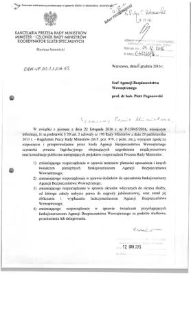 > Dokument elektroniczny przetwarzany w systemie ESOD: C-43342/2016, 191979143Śv"^ „ 5 f" iC** *łff" sra KANCELARIA PREZESA RADY MINISTRÓW MINISTER - CZŁONEK RADY MINISTRÓW KOORDYNATOR SŁUŻB SPECJALNYCH mmtix*. vwwaj. AM.% TAMA Mariusz Kamiński Warszawa, d n i a i grudnia 2016 Szef Agencji Bezpieczeństwa Wewnętrznego prof, dr hab. Piotr Pogonowski i c? W związku z pismem z dnia 22 listopada 2016 r. nr P-15845/2016, niniejszym informuję, iż na podstawie § 20 ust. 2 uchwały nr 190 Rady Ministrów z dnia 29 października 2013 r. - Regulamin Pracy Rady Ministrów (M.P. poz. 979, z późn. zm.), wyrażam zgodę na rozpoczęcie i przeprowadzenie przez Szefa Agencji Bezpieczeństwa Wewnętrznego czynności procesu legislacyjnego obejmujących uzgodnienia międzyresortowe oraz konsultacje publiczne następujących projektów rozporządzeń Prezesa Rady Ministrów: 1) zmieniającego rozporządzenie w sprawie terminów płatności uposażenia i innych świadczeń pieniężnych funkcjonariuszom Agencji Bezpieczeństwa Wewnętrznego; 2) zmieniającego rozporządzenie w sprawie dodatków do uposażenia funkcjonariuszy Agencji Bezpieczeństwa Wewnętrznego; 3) zmieniającego rozporządzenie w sprawie okresów wliczanych do okresu służby, od którego zależy nabycie prawa do nagrody jubileuszowej, oraz zasad jej obliczania i wypłacania funkcjonariuszom Agencji Bezpieczeństwa Wewnętrznego; 4) zmieniającego rozporządzenie w sprawie świadczeń przysługujących funkcjonariuszom Agencji Bezpieczeństwa Wewnętrznego za podróże służbowe, przeniesienia lub delegowania. warna cyfrowego