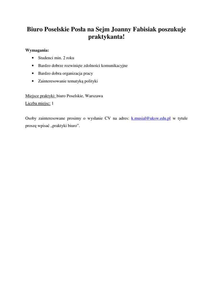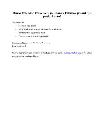 Biuro Poselskie Posła na Sejm Joanny Fabisiak poszukuje praktykanta! Wymagania: • Studenci min. 2 roku • Bardzo dobrze rozwinięte zdolności komunikacyjne • Bardzo dobra organizacja pracy • Zainteresowanie tematyką polityki Miejsce praktyki: biuro Poselskie, Warszawa Liczba miejsc: 1 Osoby zainteresowane prosimy o wysłanie CV na adres: [email protected] w tytule proszę wpisać „praktyki biuro”.