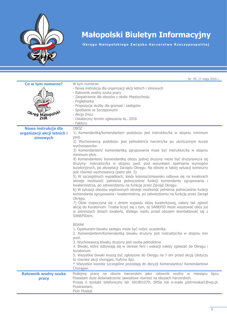 Małopolski Biuletyn Informacyjny Okręgu Małopolskiego Związku Harcerstwa Rzeczypospolitej Nr 45. 17 maja 2016 r. Co w tym numerze? Nowa instrukcja dla organizacji akcji letnich i zimowych Ratownik wodny szuka pracy W tym numerze: - Nowa instrukcja dla organizacji akcji letnich i zimowych - Ratownik wodny szuka pracy - Zaopatrzenie dla obozów z okolic Międzychodu - Pogłębiarka - Propozycja służby dla gromad i zastępów - Spotkanie ze Szczepowymi - Akcja Znicz - Ostateczny termin zgłaszania AL. 2016 - Faktury OBÓZ 1) Komendantką/komendantem podobozu jest instruktor/ka w stopniu minimum pwd. 2) Wychowawcą podobozu jest pełnoletni/a harcerz/ka po ukończonym kursie wychowawców. 3) Komendantem/ komendantką zgrupowania może być instruktor/ka w stopniu minimum phm. 4) Komendantem/ komendantką obozu jednej drużyny może być drużynowy/a tej drużyny- instruktor/ka w stopniu pwd. pod warunkiem spełniania wymogów kuratoryjnych, po akceptacji Zarządu Okręgu. Na obozie w takiej sytuacji konieczny jest również wychowawca (patrz pkt. 3). 5) W szczególnych wypadkach, kiedy kolonia/zimowisko odbywa się na kwaterach istnieje możliwość pełnienia jednocześnie funkcji komendanta zgrupowania i kwatermistrza, po zatwierdzeniu na funkcję przez Zarząd Okręgu. 6) W sytuacji obozów wędrownych istnieje możliwość pełnienia jednocześnie funkcji komendanta zgrupowania i kwatermistrza, po zatwierdzeniu na funkcję przez Zarząd Okręgu. 7) Obóz rozpoczyna się z dniem wyjazdu ekipy kwaterkowej, należy tak zgłosić akcję do Kuratorium. Trzeba liczyć się z tym, że SANEPID może wizytować obóz już w pierwszych dniach kwaterki, dlatego warto przed obozem skontaktować się z SANEPIDem. BIWAK 1. Opiekunem biwaku zastępu może być rodzic uczestnika. 2. Komendantem/Komendantką biwaku drużyny jest instruktor/ka w stopniu min pwd. 3. Wychowawcą biwaku drużyny jest osoba pełnoletnia 4. Biwaki, które odbywają się w okresie ferii i wakacji należy zgłaszać do Okręgu i kuratorium. 5. Wszystkie biwaki muszą być zgłoszone do Okręgu na 7 dni przed akcją (dotyczy to również akcji chorągwi, hufców itp). * Wszystkie kwestie szczególne pozostają do decyzji Komendantce/ Komendantowi Chorągwi. Podejmę pracę na obozie harcerskim jako ratownik wodny w miesiącu lipcu. Posiadam duże doświadczenie zawodowe również na obozach harcerskich. Proszę o kontakt telefoniczny tel: 691801079; SMSa lub e-maila [email protected]. Pozdrawiam, Piotr Moskal 1 Zaopatrzenie dla obozów z okolic Międzychodu Dzień Dobry, Reprezentuje firmę Exclusive Life tj. Hurtownię Spożywczą. Dowiedziałem się, że planują państwo mieć obóz w naszym rejonie i mam pytanie czy byli by państwo zainteresowani współpracą z nami. Posiadamy w sprzedaży: artykuły spożywcze, napoje, wodę i warzywa. Co roku współpracujemy z obozami harcerskimi, które są z nas zadowolone. Pozdrawiam i mam nadzieję, że jest szansa na miłą i owocną współpracę. Z poważaniem, Pospieszała Mariusz kierownik 600883662 Propozycja służby dla gromad i zastępów Czuwaj Harcerze!!! Jest pewna inicjatywa głównie dla zuchów/ zuchenek oraz zastępów harcerzy i harcerek. Bracia Misjonarze pomagają do noclegowni dla bezdomnych. Przebywają tam ludzie, którzy nie mają własnych domów, miejsc, do których mogą wrócić. Wspólnie z braćmi wpadliśmy na pomysł, aby tym bezdomnym podarować kartki z życzeniami, ze słowami pocieszenia, czy z obiecaniem modlitwy za nich (1 kartka ma być dla jednej osoby). Kartki nie mają dotyczyć aktualnych świąt. Stąd moja propozycja dla Was, abyście się w to włączyli- tym bardziej, że mamy służyć bliźnim- i zrobili kilka/ kilkanaście kartek dla bezdomnych tak, abym mógł je im jak najszybciej przekazać :). Wszystkie inne szczegóły u mnie ([email protected]). Pozdrawiam kl. Kamil Jankowski 2 Spotkanie ze Szczepowymi Akcja Znicz Ostateczne zgłoszenie Akcji Letniej Faktury Redakcja numeru Okręg Małopolski ZHR 30 maja o godzinie 19.00 zapraszamy szczepowe/szczepowych oraz drużynowe/drużynowych samodzielnych jednostek na spotkanie z Zarządem Okręgu. Obecność obowiązkowa. W sytuacji gdy szef jednostki nie może przyjść prosimy, żeby w spotkaniu uczestniczył inny przedstawiciel jednostki – bardzo zależy nam na obecności. Jednostki zainteresowane zorganizowaniem Akcji Znicz w tym roku proszone są o przesłanie zgłoszenia do dnia 12 czerwca 2016 r. na adres: [email protected] Zgłoszenie ma zawierać nazwę jednostki, osobę odpowiedzialną oraz Cmentarz, na którym jednostka chce zorganizować akcję. Cmentarze do wyboru: Rakowicki, Batowicki, Salwatorski, Pogórski, Mała Góra. 24.05.2016 mija termin zgłaszania Akcji Letnich. Do tego czasu należy dostarczyć do referatu: - Wydrukowany raport i preliminarz z podpisem komendanta w 2 kopiach (prosimy o druk dwustronny - z jednej strony raport, z drugiej preliminarz) Wykaz kadry pedagogicznej według wzoru Zobowiązanie komendanta w 2 kopiach ZZ i ZM kwatermistrza w 2 kopiach W biurze okręgu czekają na odbiór następujące faktury: Lp Od kogo Zakupione rzeczy 1 Pizzeria Mamma Mia Pizza Rynna, rura, żarówka, toaleta 2 Leroy Merlin drewniana, dostawa 3 Rafał Dobrzański Karmello standard mix 4 Retip Waligóra Siekiera 5 King Trans Przewóz do Murzasichle 6 Dom Harcerza pobyt w ośrodku Fort 39 Wartość brutto 65,00 zł 520,24 zł 47,98 zł 1780,00 zł 1000,00 zł 215,00 zł Ewa Siemianowska ul. Grzegórzecka 45-47, 31-532 Kraków, tel. 12 4217659, [email protected] www.malopolska.zhr.pl, www.facebook.com/malopolski.zhr 3