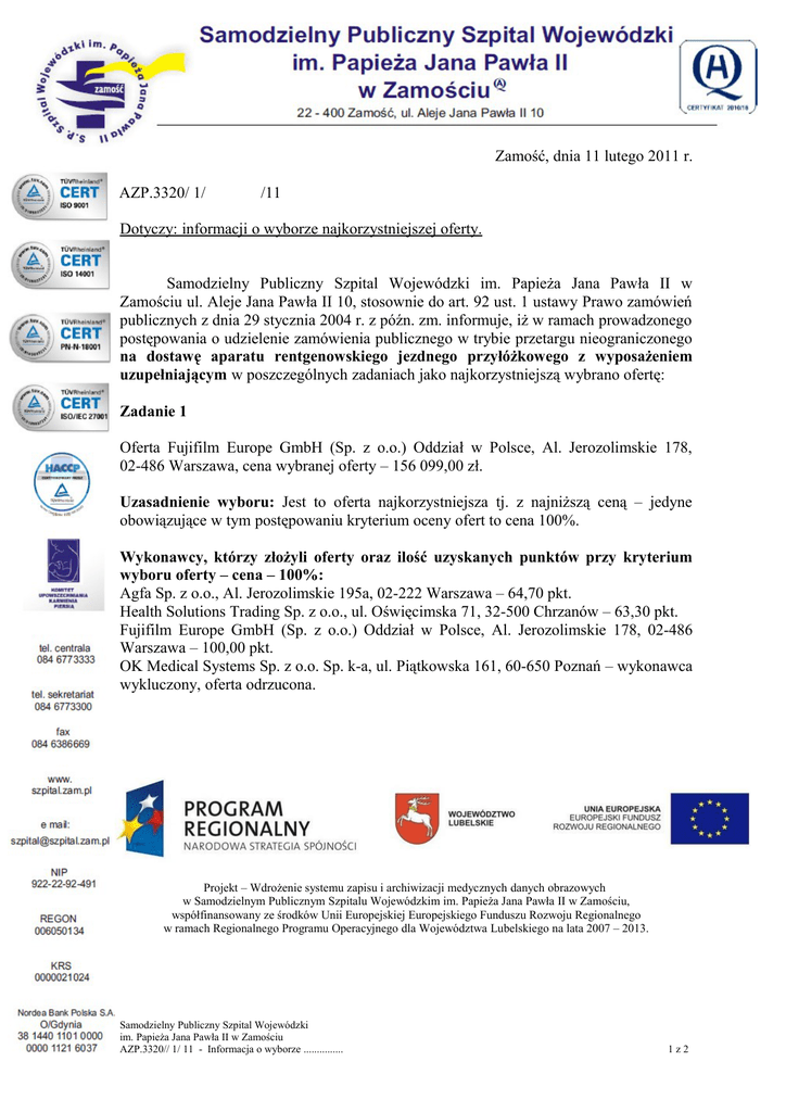 Zamość, dnia 11 lutego 2011 r. AZP.3320/ 1/ /11 Dotyczy: informacji o wyborze najkorzystniejszej oferty. Samodzielny Publiczny Szpital Wojewódzki im. Papieża Jana Pawła II w Zamościu ul. Aleje Jana Pawła II 10, stosownie do art. 92 ust. 1 ustawy Prawo zamówień publicznych z dnia 29 stycznia 2004 r. z późn. zm. informuje, iż w ramach prowadzonego postępowania o udzielenie zamówienia publicznego w trybie przetargu nieograniczonego na dostawę aparatu rentgenowskiego jezdnego przyłóżkowego z wyposażeniem uzupełniającym w poszczególnych zadaniach jako najkorzystniejszą wybrano ofertę: Zadanie 1 Oferta Fujifilm Europe GmbH (Sp. z o.o.) Oddział w Polsce, Al. Jerozolimskie 178, 02-486 Warszawa, cena wybranej oferty – 156 099,00 zł. Uzasadnienie wyboru: Jest to oferta najkorzystniejsza tj. z najniższą ceną – jedyne obowiązujące w tym postępowaniu kryterium oceny ofert to cena 100%. Wykonawcy, którzy złożyli oferty oraz ilość uzyskanych punktów przy kryterium wyboru oferty – cena – 100%: Agfa Sp. z o.o., Al. Jerozolimskie 195a, 02-222 Warszawa – 64,70 pkt. Health Solutions Trading Sp. z o.o., ul. Oświęcimska 71, 32-500 Chrzanów – 63,30 pkt. Fujifilm Europe GmbH (Sp. z o.o.) Oddział w Polsce, Al. Jerozolimskie 178, 02-486 Warszawa – 100,00 pkt. OK Medical Systems Sp. z o.o. Sp. k-a, ul. Piątkowska 161, 60-650 Poznań – wykonawca wykluczony, oferta odrzucona. Projekt – Wdrożenie systemu zapisu i archiwizacji medycznych danych obrazowych w Samodzielnym Publicznym Szpitalu Wojewódzkim im. Papieża Jana Pawła II w Zamościu, współfinansowany ze środków Unii Europejskiej Europejskiego Funduszu Rozwoju Regionalnego w ramach Regionalnego Programu Operacyjnego dla Województwa Lubelskiego na lata 2007 – 2013. Samodzielny Publiczny Szpital Wojewódzki im. Papieża Jana Pawła II w Zamościu AZP.3320// 1/ 11 - Informacja o wyborze ............... 1z2 Zadanie 2 Oferta Fujifilm Europe GmbH (Sp. z o.o.) Oddział w Polsce, Al. Jerozolimskie 178, 02486 Warszawa, cena wybranej oferty – 376 077,00 zł. Uzasadnienie wyboru: Jest to oferta najkorzystniejsza tj. z najniższą ceną – jedyne obowiązujące w tym postępowaniu kryterium oceny ofert to cena 100%. Wykonawcy, którzy złożyli oferty oraz ilość uzyskanych punktów przy kryterium wyboru oferty – cena – 100%: Fujifilm Europe GmbH (Sp. z o.o.) Oddział w Polsce, Al. Jerozolimskie 178, 02-486 Warszawa – 100,00 pkt. Umowa zostanie zawarta w terminie określonym w art. 94 ust. 1 pkt 2 ustawy Prawo zamówień publicznych. Dyrektor Samodzielnego Publicznego Szpitala Wojewódzkiego im. Papieża Jana Pawła II w Zamościu lek. med. Andrzej Mielcarek Samodzielny Publiczny Szpital Wojewódzki im. Papieża Jana Pawła II w Zamościu AZP.3320// 1/ 11 - Informacja o wyborze ............... 2z2