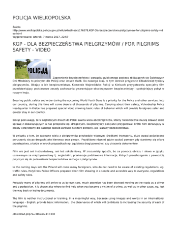 POLICJA WIELKOPOLSKA Źródło: http://www.wielkopolska.policja.gov.pl/wlk/aktualnosci/176378,KGP-Dla-bezpieczenstwa-pielgrzymow-For-pilgrims-safety-vid eo.html Wygenerowano: Wtorek, 7 marca 2017, 22:57 KGP - DLA BEZPIECZEŃSTWA PIELGRZYMÓW / FOR PILGRIMS SAFETY - VIDEO Zapewnienie bezpieczeństwa i porządku publicznego podczas zbliżających się Światowych Dni Młodzieży to priorytet dla Policji oraz innych służb. Do naszego kraju w tym okresie przyjedzie kilkadziesiąt tysięcy pielgrzymów. Dbając o ich bezpieczeństwo, Komenda Wojewódzka Policji w Kielcach przygotowała specjalny film przedstawiający podstawowe zasady zachowania gwarantujące obcokrajowcom bezpieczniejszy i spokojniejszy pobyt w naszym kraju. Ensuring public safety and order during the upcoming World Youth Days is a priority for the Police and other services. Into our country, during this time will come dozens of thousands of pilgrims. Carrying about their safety, Voivodeship Police Headquarter in Kielce has prepared special video showing basic rules of behavior which will provide foreigners safer and quieter stay in our country. Biorąc pod uwagę, że w najbliższych dniach do Polski zawita wielu obcokrajowców, którzy niekoniecznie muszą zdawać sobie sprawę z obowiązujących u nas przepisów np. drogowych, świętokrzyscy policjanci przygotowali krótki film obrazujący w prosty i przystępny dla każdego sposób zarówno niektóre przepisy, jak i zasady bezpieczeństwa. W związku z tym, że zapewne wielu z pielgrzymów przybędzie własnymi środkami transportu, dużo uwagi poświęcono poruszaniu się po drogach jako kierowca oraz pieszy. Przybliżono również gdzie szukać pomocy gdy staniemy się ofiarą przestępstwa, a także w innych przypadkach np. zgubienia drogi powrotnej, czy utracenia dokumentów. Film nie jest ani instruktażowy, ani też szkoleniowy. W zrozumiały sposób, bo za pomocą obrazu i słowa w języku uznawanym za międzynarodowy tj. angielskim, przekazuje podstawowe informacje, których przestrzeganie z pewnością przyczyni się do podniesienia bezpieczeństwa każdego z pielgrzymów. In the coming days into the Poland will come many foreigners, who do not need to be aware of existing regulations, eg. traffic rules, HolyCross Police Officers prepared short film showing in a simple and accesible way to everyone, regulations and safety rules. Probably many of pilgrims will arrive to us by own cars, much attention has been devoted moving on the roads as a driver and a pedestrian. It is shown also where to find help when you become a victim of a crime, as well as in other cases, eg. lost the way back or losing documents. The film is neither instructional or training. In a meaningful way, because using images and words in an international language – English, provide basic information, the observance of which will contribute to increasing the security of each of the pilgrims. /download.php?s=308&id=115338 Zainstaluj wtyczkę Flash, aby zobaczyć odtwarzacz. pobierz film - 27.84 MB Ocena: 0/5 (0) Tweetnij