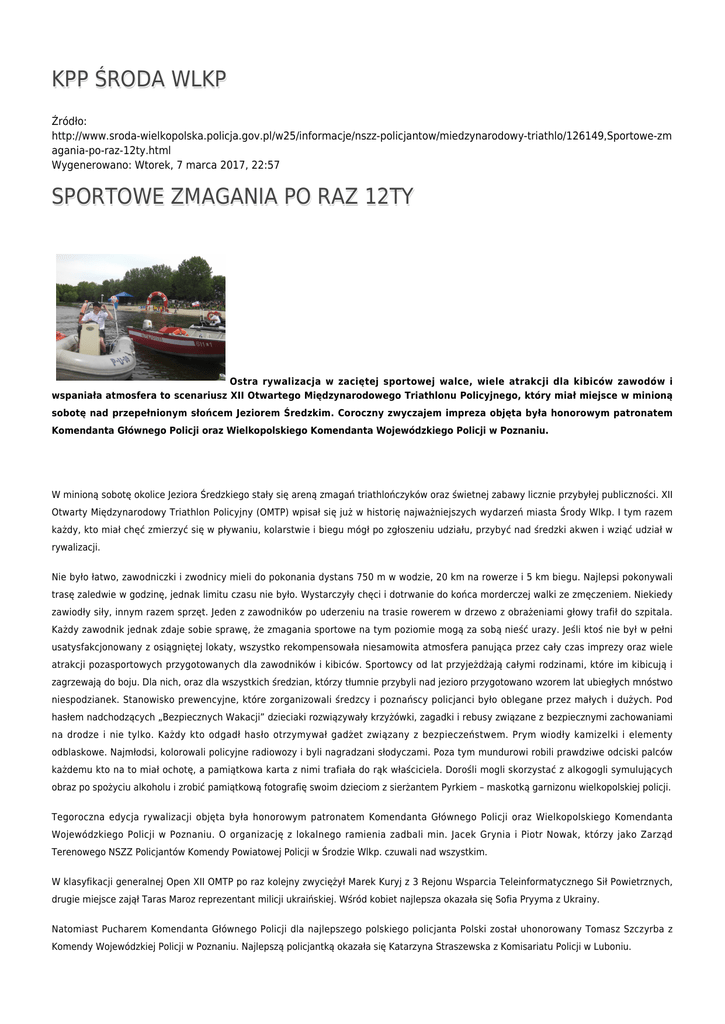 KPP ŚRODA WLKP Źródło: http://www.sroda-wielkopolska.policja.gov.pl/w25/informacje/nszz-policjantow/miedzynarodowy-triathlo/126149,Sportowe-zm agania-po-raz-12ty.html Wygenerowano: Wtorek, 7 marca 2017, 22:57 SPORTOWE ZMAGANIA PO RAZ 12TY Ostra rywalizacja w zaciętej sportowej walce, wiele atrakcji dla kibiców zawodów i wspaniała atmosfera to scenariusz XII Otwartego Międzynarodowego Triathlonu Policyjnego, który miał miejsce w minioną sobotę nad przepełnionym słońcem Jeziorem Średzkim. Coroczny zwyczajem impreza objęta była honorowym patronatem Komendanta Głównego Policji oraz Wielkopolskiego Komendanta Wojewódzkiego Policji w Poznaniu. W minioną sobotę okolice Jeziora Średzkiego stały się areną zmagań triathlończyków oraz świetnej zabawy licznie przybyłej publiczności. XII Otwarty Międzynarodowy Triathlon Policyjny (OMTP) wpisał się już w historię najważniejszych wydarzeń miasta Środy Wlkp. I tym razem każdy, kto miał chęć zmierzyć się w pływaniu, kolarstwie i biegu mógł po zgłoszeniu udziału, przybyć nad średzki akwen i wziąć udział w rywalizacji. Nie było łatwo, zawodniczki i zwodnicy mieli do pokonania dystans 750 m w wodzie, 20 km na rowerze i 5 km biegu. Najlepsi pokonywali trasę zaledwie w godzinę, jednak limitu czasu nie było. Wystarczyły chęci i dotrwanie do końca morderczej walki ze zmęczeniem. Niekiedy zawiodły siły, innym razem sprzęt. Jeden z zawodników po uderzeniu na trasie rowerem w drzewo z obrażeniami głowy trafił do szpitala. Każdy zawodnik jednak zdaje sobie sprawę, że zmagania sportowe na tym poziomie mogą za sobą nieść urazy. Jeśli ktoś nie był w pełni usatysfakcjonowany z osiągniętej lokaty, wszystko rekompensowała niesamowita atmosfera panująca przez cały czas imprezy oraz wiele atrakcji pozasportowych przygotowanych dla zawodników i kibiców. Sportowcy od lat przyjeżdżają całymi rodzinami, które im kibicują i zagrzewają do boju. Dla nich, oraz dla wszystkich średzian, którzy tłumnie przybyli nad jezioro przygotowano wzorem lat ubiegłych mnóstwo niespodzianek. Stanowisko prewencyjne, które zorganizowali średzcy i poznańscy policjanci było oblegane przez małych i dużych. Pod hasłem nadchodzących „Bezpiecznych Wakacji” dzieciaki rozwiązywały krzyżówki, zagadki i rebusy związane z bezpiecznymi zachowaniami na drodze i nie tylko. Każdy kto odgadł hasło otrzymywał gadżet związany z bezpieczeństwem. Prym wiodły kamizelki i elementy odblaskowe. Najmłodsi, kolorowali policyjne radiowozy i byli nagradzani słodyczami. Poza tym mundurowi robili prawdziwe odciski palców każdemu kto na to miał ochotę, a pamiątkowa karta z nimi trafiała do rąk właściciela. Dorośli mogli skorzystać z alkogogli symulujących obraz po spożyciu alkoholu i zrobić pamiątkową fotografię swoim dzieciom z sierżantem Pyrkiem – maskotką garnizonu wielkopolskiej policji. Tegoroczna edycja rywalizacji objęta była honorowym patronatem Komendanta Głównego Policji oraz Wielkopolskiego Komendanta Wojewódzkiego Policji w Poznaniu. O organizację z lokalnego ramienia zadbali min. Jacek Grynia i Piotr Nowak, którzy jako Zarząd Terenowego NSZZ Policjantów Komendy Powiatowej Policji w Środzie Wlkp. czuwali nad wszystkim. W klasyfikacji generalnej Open XII OMTP po raz kolejny zwyciężył Marek Kuryj z 3 Rejonu Wsparcia Teleinformatycznego Sił Powietrznych, drugie miejsce zajął Taras Maroz reprezentant milicji ukraińskiej. Wśród kobiet najlepsza okazała się Sofia Pryyma z Ukrainy. Natomiast Pucharem Komendanta Głównego Policji dla najlepszego polskiego policjanta Polski został uhonorowany Tomasz Szczyrba z Komendy Wojewódzkiej Policji w Poznaniu. Najlepszą policjantką okazała się Katarzyna Straszewska z Komisariatu Policji w Luboniu. W ceremonii honorowania zwycięzców udział wzięli zaproszeni goście Przewodniczący Zarządu Wojewódzkiego NSZZ Policjantów woj. Wielkopolskiego podinsp. Andrzej Szary, Wiceprzewodniczący Zarządu asp. Lucjan Dudkiewicz oraz Komendant Powiatowy Policji w Środzie Wlkp. mł.insp. Paweł Wawrzyniak, Burmistrz Miasta Środa Wlkp. Wojciech Ziętkowski i szef średzkich związków zawodowych Jacek Grynia. Klasyfikacja generalna - pobierz 69.39 Kb Klasyfikacja Policjantki - pobierz 22.02 Kb Klasyfikacja Policjanci - pobierz 56.28 Kb Klasyfikacja pozostałe służby mundurowe - pobierz 45.91 Kb TRIATHLON/2012/foto Ocena: 0/5 (0) Tweetnij