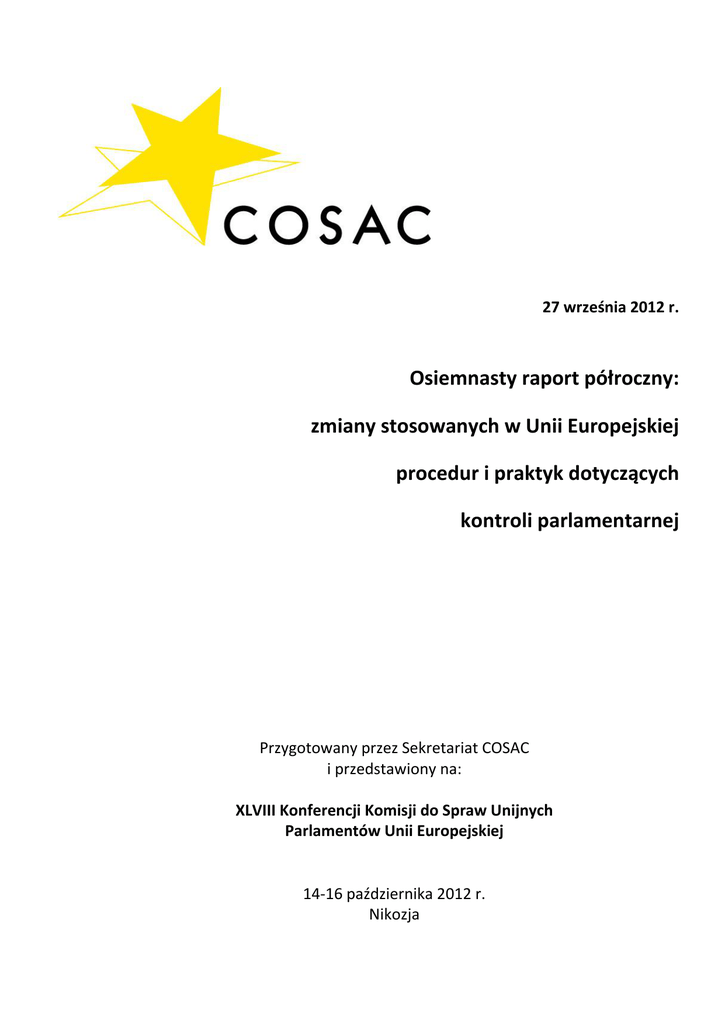 27 września 2012 r. Osiemnasty raport półroczny: zmiany stosowanych w Unii Europejskiej procedur i praktyk dotyczących kontroli parlamentarnej Przygotowany przez Sekretariat COSAC i przedstawiony na: XLVIII Konferencji Komisji do Spraw Unijnych Parlamentów Unii Europejskiej 14-16 października 2012 r. Nikozja Konferencja Komisji do Spraw Unijnych Parlamentów Unii Europejskiej SEKRETARIAT COSAC WIE 05 U 041, 30-50 rue Wiertz, B-1047 Bruksela, Belgia e-mail: [email protected] | tel.: +32 2 284 3776 ii Spis treści WSTĘP ............................................................................................................................................ iv STRESZCZENIE ................................................................................................................................. 1 ROZDZIAŁ 1: RELACJE MIĘDZY INSTYTUCJAMI EUROPEJSKIMI A PARLAMENTAMI NARODOWYMI ................................................................................................................................ 3 1.1 Pomocniczość i proporcjonalność ......................................................................................... 3 1.1.1 Zasady pomocniczości i proporcjonalności .................................................................... 3 1.1.2 Proporcjonalność i kontrola sprawowana przez parlamenty narodowe ...................... 5 1.1.3 Uzasadnione opinie........................................................................................................ 7 1.1.4 Wytyczne........................................................................................................................ 8 1.2 Dialog polityczny ................................................................................................................. 10 1.2.1 Działania w ramach dialogu politycznego .................................................................... 10 1.2.2. Przedstawienie programu prac Komisji (PPK)............................................................. 11 1.2.3. Częstotliwość przedstawiania konkretnych projektów w parlamentach przez Komisję ............................................................................................................................................... 11 1.2.4. Wzmacnianie dialogu politycznego z instytucjami europejskimi ............................... 12 ROZDZIAŁ 2: TRAKTAT O STABILNOŚCI, KOORDYNACJI I ZARZĄDZANIU W UNII GOSPODARCZEJ I WALUTOWEJ A ROLA PARLAMENTÓW ............................................................ 17 2.1 Ratyfikacja TSKZ .............................................................................................................. 17 2.2. Wzmocnienie współpracy międzyparlamentarnej na podstawie roli przypisanej parlamentom narodowym przez art. 13 TSKZ ...................................................................... 18 2.3 Odpowiednie forum do dyskusji nad polityką budżetową i innymi kwestiami, o którym mowa w art. 13 TSKZ............................................................................................................. 18 2.4 Skład uczestników forum ................................................................................................ 20 3.1 Kontrola parlamentarna dotycząca projektu .................................................................. 21 3.2 Konkretne kwestie badane w ramach kontroli ............................................................... 23 3.3 Treść uwag i dokumentów parlamentarnych ................................................................. 24 ROZDZIAŁ 4: ZARZĄDZANIE JEDNOLITYM RYNKIEM ..................................................................... 26 4.1 Kontrola parlamentarna w zakresie zarządzania jednolitym rynkiem ........................... 26 iii WSTĘP Niniejszy dokument jest osiemnastym raportem półrocznym Sekretariatu COSAC. Raporty półroczne Sekretariatu Konferencji COSAC Na XXX spotkaniu COSAC ustalono, że Sekretariat COSAC będzie przygotowywał półroczne raporty rzeczowe, publikowane przed każdą konferencją plenarną. Celem tych raportów jest dokonanie przeglądu zmian w procedurach i praktykach Unii Europejskiej, istotnych z punktu widzenia kontroli parlamentarnej. Wszystkie raporty półroczne są zamieszczone pod adresem internetowym COSAC: http://www.cosac.eu/en/documents/biannual/ Cztery rozdziały tego raportu półrocznego opierają się na informacjach dostarczonych przez parlamenty narodowe państw członkowskich Unii Europejskiej oraz przez Parlament Europejski. Termin dostarczenia odpowiedzi na pytania zawarte w kwestionariuszu do 18. raportu półrocznego wyznaczono na 27 sierpnia 2012 r. Tezy niniejszego raportu zostały przyjęte na spotkaniu przewodniczących COSAC, które odbyło się 9 lipca 2012 r. w Limassol. Przyjęto ogólną zasadę, że raport nie wymienia wszystkich parlamentów lub izb, których dotyczy dana kwestia. Zamiast tego posłużono się przykładami. Streszczenie odpowiedzi zamieszczono w aneksie do raportu, zaś pełne odpowiedzi otrzymane od wszystkich 40 parlamentów narodowych (izb) 27 państw członkowskich można znaleźć w witrynie internetowej COSAC. Dane liczbowe Spośród 27 państw członkowskich Unii Europejskiej w 14 istnieje parlament jednoizbowy, zaś w 13 dwuizbowy. Ze względu na istnienie zarówno systemów jednoizbowych, jak i dwuizbowych w 27 państwach członkowskich UE jest łącznie 40 izb parlamentów narodowych. Parlamenty narodowe Austrii, Irlandii i Hiszpanii, choć dwuizbowe, przesłały pojedyncze odpowiedzi na pytania zawarte w kwestionariuszu. iv STRESZCZENIE CHAPTER 1: STOSUNKI MIĘDZY INSTYTUCJAMI EUROPEJSKIMI A PARLAMENTAMI NARODOWYMI W kwestii pomocniczości i proporcjonalności, ich wzajemnego statusu oraz wykorzystywania ich w procesie kontroli sprawowanej przez parlamenty narodowe, parlamenty (izby) wyraziły różne poglądy i przekazały wiele cennych informacji. Parlamenty (izby) można ogólnie podzielić na dwi