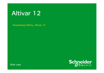 Altivar 12 Prezentacja Oferty Altivar 12 Piotr Lato Altivar 12 Wstę Wstę p Zakres gamy Silne strony oferty Środowisko pracy Instalacja, połą połączenie łączenie Ustawienia, Menu Wymiary, standardy 2 Wstęp, Unikalne wartości oferty Potrzeby Klienta • Programowanie • Tool KIT – redukcja czasu projektowania • PowerSuite3 do zarządzania ustawieniami, parametrami i komunikacją • Wiele wbudowanych funkcji do obsługi aplikacji – blisko 150 funkcji. • Wartoś Wartości techniczne, techniczne, montaż montaż i okablowanie • Proste zarzą zarz ądzanie i uruchomienie – transfer 10 konfiguracji. konfiguracji. • Elastyczne pakowanie – kilkanaście ATV12 w jednym opakowaniu. • Łatwe podłączanie zacisków z dedykowanym opisem konektorów jak również komunikacji Modbus (RJ45 – 2 / 3 przewodowy) • Zabezpieczenie • Pewne sterowanie silnikiem, bez wstępnych ustawień parametrów silnika, krótszy czas reakcji. • Innowacyjna elektronika – nowe obwody kondensatorów odpornych na wysokie temperatury pracy • Rozmiary i funkcje kompatybilne z poprzednią gamą ATV11 3 Wstęp, Unikalne wartości oferty Altivar 12 : Silne Silne Strony ● Jeden z najmniejszych napę nap ęd ów z filtrem EMC ● Solidne Sterowanie Silnikiem ● Modbus dla maszyn i producentó producent ów OEM ● Dokł Dok ładność adność i precyzja wejść wejść LI dla odpowiedzi prę prędkoś dkości ● Oszczę Oszcz ędność dność miejsca dzię dzięki zbiorczym opakowaniom ATV12… ATV12….TQ Wymiarowy Kompaktowy Kompaktowy ATV12 Niezawodny Intuicyjny Intuicyjny ● Zaprojektowany do trudnych warunkó warunków pracy ● Szybkie i proste uruchomienie - Autotuning ● Wysoka jakość jakość komponentó komponent ów moduł modułu mocy i sterowania ● Zero ustawień ustawień konfiguracji - start ● Żywotność ywotność elektroniki ATV12 ponad 10 lat ● Konfiguracja w opakowaniu bez fizycznego zasilania 4 Wstęp, główne rewolucje ATV12 ATV11 ATV12 Utrzymanie ●Tabliczka znamionowa silnika ● 0 ustawień wstępnych Gama ● 0.18 do 2.2 kW, trzy różne gamy (E, U and A) ● 0.18 do 4 kW, jednolita gama ATV12 Wyś Wyś wietlacz ● Wyświetlacz 3 cyfrowy ● 4 cyfrowy wyświetlacz, 7 segmentowy ● Zdalny terminal graficzny HMI ● Potencjometr (jako opcja) ● Wbudowane pokrętło (standard) HMI ● Menu, w postaci drzewa ● Strukturalne Menu Połą Połączenie łączenie ● 2-3 przewodowe ● Połączenia elektryczne, ukryta komunikacja pod panelem przednim z diodą sygnalizacji pracy Komunikacja ●Nie ●Modbus RTU Programowanie ●Nie Tak przez “Multi loader” 5 Wstęp, główne rewolucje ATV12 ATV11 ATV12 Odpowiedź Odpowiedź LI (Wejś (Wejś cie Cyfrowe) ● 10 do 20 ms (+/-15 ms) ● Mniej niż 20ms, +/- 1 ms RCD Poziom zabezpieczenia ● współpraca z obwodem różnicowym 1:1 ● współpraca z obwodem różnicowym 1:3 (trzy ATV12) do jednego obwodu Wyjś Wyjś cia Analogowe ● Nie ● Tak 1 Czę Częstotliwość stotliwość pracy ● 200 Hz ● 400 Hz Zabezpieczenie prą prądowe ● Programowe LIC ● Sprzętowe LIC Oprogramowanie ● PowerSuite 2 ● PowerSuite 3 (Personalizowane menu, parametryzacja…) ●Multi loader Włącz/Wyłącz (konfigurowalne) Zabezpieczenie ● Nie ● Tak, główne płyty sterowania (sterowanie, mocy, karty rozszerzeń & silnika) 6 Gama ATV12 Standardy ● Główne standardy i normy elektryczne środowiska ● Normy Środowiskowe – RoHs, – WEEE, – Czas życia produktu na etykiecie, ● Normy Elektryczne ●EN 61800-5-1(Norma bezpieczeństwa), ●EN 61800-3 (Wymagania odnośnie norm kompatybilności EMC), ●EN 61000-4 (Ogólne zalecenia i normy) . Nowość ● Redukcja prądu upływu przemiennika ATV12 ● Moż Możliwa redukcja prą prądu upł upływu ATV12 poprzez rozłą rozłącznik łącznik. cznik 7 Gama (zakres mocy), moc w kW 100V (1φ): (1 ): ● 0.18 - 0.37 - 0.75 kW ● 0.37 kW Radiator Płyta 200V (1φ) (1 ): ● 0.18 - 0.37 - 0.55 - 0.75 - 1.5 - 2.2 kW ● 0.37 - 0.55 - 0.75 kW Radiator Płyta 200V (3φ) (3 ) : ● 0.18 - 0.37 - 0.75 - 1.5 - 2.2 - 3 - 4 kW ● 0.37 - 0.75 - 1.5 - 2.2 - 3 - 4 kW Radiator Płyta 8 Główna gama, referencje ATV12 . … .. 18 : 0.18 kW 37 : 0.37 kW P: Na płycie 0: mniej niż 1 H: Z radiatorem U: jednostka 55 : 0.55 kW F1: 1 ~ 100V 75 : 0.75 kW M2: 1 ~ 200V 11 : 1.1 kW M3: 3 ~ 200V 15 : 1.5 kW 22 : 2.2 kW 30 : 3 kW 40 : 4kW 9 Gama ATV12 Varianty konfiguracji ● ATV12 z radiatorem (wentylator) ● ATV12 na płycie bazowej 10 Gama ATV12 Akcesoria komunikacyjne ● Transfer konfiguracji Zasilanie Włączone (Simple Loader) ● Transfer konfiguracji Zasilanie On/Off (Multi Loader) ● Ułatwiony transfer : 10 konfiguracji w mniej niż 5ms ● Konfiguracja wewnątrz opakowania ● Oprogramowanie SoMove ● Oprogramowania narzędziowe PC ● Połączenie szeregowe Modbus lub Bluetooth ● SoMove Mobile ● Bluetooth Nowość 11 Silne strony oferty ATV12 ● Ustawienia, Ustawienia, ● Wbudowane narzędzie programowania, obrotowe pokrętło. ● Konfiguracja może zostać wysłana (personalizacja) i załadowana do napędu ATV12: ●Power off z użyciem multi loader (10 napędów ATV12 skonfigurowane w ciągu mniej niż 5ms) ●Power on z użyciem simple loader lub multi loader ● Łatwość w ustawianiu parametrów rozruchu “settings menu”, proste aplikacje bez ustawień w napędzie – „podłącz i pracuj”. ● Dostęp dzięki wbudowanej komunikacji Modbus do szerokiego zakresu aplikacji ● Automatyka budynków BMS – monitoring przez sieć komunikacyjną Modbus 12 Silne strony oferty ATV12 ● Prezentacja Prezentacja, zentacja , ● Jedna światowa gama zamiast trzech (redukcja numerów referencyjnych) ● Znacznie ułatwiające znakowanie : ● Klasyczne oznakowanie napędów ATV12 tak jak to ma miejsce dla ATV21, ATV31….. (końcówka M2 dla 1~) ● Prosty montaż do obwodów mocy napędu ATV12 (brak możliwości błędu podczas łączenia dzięki ukrytym