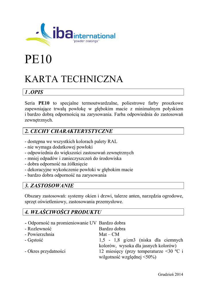 PE10 KARTA TECHNICZNA 1 .OPIS Seria PE10 to specjalne termoutwardzalne, poliestrowe farby proszkowe zapewniające trwałą powłokę w głębokim macie z minimalnym połyskiem i bardzo dobrą odpornością na zarysowania. Farba odpowiednia do zastosowań zewnętrznych. 2. CECHY CHARAKTERYSTYCZNE - dostępna we wszystkich kolorach palety RAL - nie wymaga dodatkowej powłoki - odpowiednia do większości zastosowań zewnętrznych - mniej odpadów i zanieczyszczeń do środowiska - dobra odporność na żółknięcie - dekoracyjne wykończenie powłoki w głębokim macie - bardzo dobra odporność na zarysowania 3. ZASTOSOWANIE Obszary zastosowań: systemy okien i drzwi, talerze anten, narzędzia ogrodowe, sprzęt oświetleniowy, zastosowania przemysłowe. 4. WŁAŚCIWOŚCI PRODUKTU - Odporność na promieniowanie UV Bardzo dobra - Rozlewność - Powierzchnia - Gęstość - Okres przydatności Bardzo dobra Mat – CM 1,5 - 1,8 g/cm3 (niska dla ciemnych kolorów, wysoka dla jasnych kolorów) 12 miesięcy (przy temperaturze <30 ºC i wilgotność względnej <50%) Grudzień 2014 5. METODA APLIKACJI Aplikacja Elektrostatyka (Korona) ( aplikacja metodą Tribo jest możliwa jeśli w kodzie produktu znajduje się litera „T”) Wygrzewanie 200 ºC 10 minut (zalecane) Temperatura metalu (º C) 190 200 210 Czas (min.) 15-25 8-18 5-14 Grubość powłoki 60 – 80 μm (zalecana) Wydajność teoretyczna 8 -10 m2/kg. Praktyczna wydajność będzie się różnić w zależności od: metody i warunków aplikacji, gęstości, profilu powierzchni i struktury. 6. WŁAŚCIWOŚCI POWŁOKI Wyniki testów podane poniżej oparte są na badaniach panelu o grubości 0,5 mm pomalowanego farbą proszkową o grubości 60 µ. Test udarowy (bezpośredni) Test udarowy (odwrotny) Test Buchholza Test Stożkowy Test Adhezyjny >10 kgcm >10 kgcm >90 <20 mm Gt:0 (ISO 6272-1) (ISO 6272-1) (ISO 2815) (ISO 6860) (ISO 2409) 7. INSTRUKCJA APLIKACJI Przygotowanie powierzchni W celu uzyskania optymalnej wydajności podłoże przed lakierowaniem powinno być suche i wolne od tłuszczów, smarów lub innych zabrudzeń. Prawidłowe przygotowanie powierzchni obejmuje: Aluminium Metale żelazne Metale ocynkowane chromianowanie żółte lub zielone/fosforanowanie fosforanowanie cynkowe lub żelazowe fosforanowanie cynkowe lub chromianowanie Procedura aplikacji i sprzęt 1. Właściwości elektrostatyczne proszków z serii PE10 są optymalne, gdy proszek jest w stanie sypkim i pozbawionym wilgoci. Zleżały lub zagęszczony proszek może wymagać wstępnego przygotowania przez kilka minut, aby zapewnić jednorodną rozlewność. Grudzień 2014 2. Jeśli w pomieszczeniu przechowywania jest niższa temperatura niż w pomieszczeniu nakładania (aplikacji), higroskopijne (pochłaniające wilgoć) farby proszkowe powinny być aklimatyzowane w zamkniętych pojemnikach przed dodaniem do zbiornika natryskowego (dozownika). Aby uzyskać optymalną wydajność, farba powinna być przechowywana i nakładana w klimatyzowanych pomieszczeniach. Temperatura przechowywania powinna być utrzymywana poniżej 30°C. 3. Proszek nie powinien być długo przechowywany w zbiornikach. Jeśli wystąpi kondensacja, należy poddać proszek fluidyzacji w celu wyschnięcia lub zastąpić wilgotny proszek nowym. 4. Proszek do powłok jest bardzo drobnym pyłem. Maski ochronne lub przeciwpyłowe powinny być wykorzystywane przez pracowników narażonych na kontakt z pyłem, aby zapobiec jego wdychaniu. 5. Sprężone powietrze doprowadzone do pistoletów musi być suche i bez oleju. 6. W miejscu stosowania farby nie wolno używać silikonu. 7. Stosując dozownik proszku, należy wsunąć sondę całkowicie w proszek i postępować według instrukcji producenta dozownika. 8. Punkty styczności powinny być podtrzymywane aby zapewnić uziemienie. 9. Natryskiwanie elektrostatyczne. Względna wilgotność powinna wynosić 50-60% dla systemu korona (ang. corona system) oraz poniżej 40% dla systemu tribo (and. tribo system). 10. Utwardzać zgodnie z zaleceniami podanymi powyżej. 11. Należy dbać o odpowiednie proporcje proszku nowego i odzyskanego, aby utrzymywać odpowiednią konsystencję strumienia natrysku. 12. Przesiewanie proszku przed dodaniem do zbiornika eliminuje potencjalne zbrylenie i występowanie ciał obcych. 13. Sprawdzenie wygrzania powłoki następuje za pomocą testu udarności. 8. UTRZYMANIE I KONSERWACJA W celu utrzymania estetycznego wyglądu powłoki lakierniczej, należy myć ją regularnie ciepłą wodą z łagodnym detergentem. Nie należy używać papieru ściernego, agresywnych środków czyszczących oraz aktywnych rozpuszczalników organicznych. 9. ZDROWIE I BEZPIECZEŃSTWO Karta bezpieczeństwa materiału (karta charakterystyki) jest nieodzowna przy stosowaniu produktu, ponieważ zawiera informacje o potencjalnych zagrożeniach dla zdrowia i wyszczególnia wymagane środki ochrony osobistej. Zaleca się kontakt z Dystrybutorem w celu uzyskania szczegółowych informacji. Grudzień 2014 10. ŚRODKI OSTROŻNOŚCI I OGRANICZENIA Z uwagi na zróżnicowane metody aplikacji i warunki przechowywania, w serii PE50 może występować rozbieżność pomiędzy próbkami proszków IBA Kimya, a materiałem użytym do produkcji. Dlatego do obowiązków użytkownika i / lub klienta należy upewnienie się, czy produkt jest zgodny z ich wymogami. Optymalna ochrona antykorozyjna jest zapewniona, gdy sucha powłoka ma zalecaną grubość. Nie zalecane do zastosowań w wysoko korozyjnym środowisku. Wskaźnik nagrzewania komponentów w piecu może mieć wpływ na różnicę w połysku i rozlewności farby. 11. TRANSPORT I SKŁADOWANIE Opakowanie: Transport: 15-20-25 kg. Worek polietylenowy w kartonie. Artykuł bezpieczny. Brak specjalnych wymagań dot. przewozu Warunki składowania: Temperatura poniżej 30 ºC , wilgotność względna poniżej 50 %. Składować w zamkniętych pojemnikach. 12. ADRES I LOGO PRODUCENTA Logo firmy: Adres internetowy: www.iba.com.tr I
