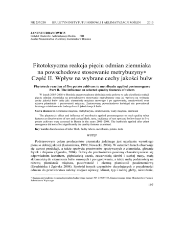 NR 257/258 BIULETYN INSTYTUTU HODOWLI I AKLIMATYZACJI ROŚLIN 2010 JANUSZ URBANOWICZ Instytut Hodowli i Aklimatyzacji Roślin — PIB Zakład Nasiennictwa i Ochrony Ziemniaka w Boninie Fitotoksyczna reakcja pięciu odmian ziemniaka na powschodowe stosowanie metrybuzyny∗ Część II. Wpływ na wybrane cechy jakości bulw Phytotoxic reaction of five potato cultivars to metribuzin applied postemergence Part II. The influence on selected quality featares of tubers W latach 2005–2008 w Boninie przeprowadzono doświadczenia polowe w celu określenia reakcji pięciu odmian ziemniaka na powschodowe stosowanie metrybuzyny oraz jej wpływu na wybrane cechy jakości bulw takie jak: ciemnienie miąższu surowego i po ugotowaniu, smakowitość oraz rdzawa plamistość i pustowatość miąższu. Zastosowany powschodowo herbicyd nie powodował istotnego zróżnicowania badanych cech jakościowych bulw. Słowa kluczowe: ciemnienie miąższu, metrybuzyna, smakowitość, wady miąższu, ziemniak The phytotoxic effect and influence of metribuzin applied postemergence on such quality tuber features as discoloration of raw and cooked flesh, taste, incidence of rust spot and hollow heart in five potato cultivars were assessed in Bonin in the years 2005–2008. The herbicide applied after plant emergence did not affect significantly the quality features examined. Key words: discoloration of tuber flesh, faulty tubers, metribuzin, potato, taste WSTĘP Podstawowym celem producentów ziemniaka jadalnego jest uzyskanie wysokiego plonu o dobrej jakości (Lutomirska, 1999; Nowacki, 2006). W ostatnich latach obserwuje się wzrost produkcji, a także spożycia przetworów spożywczych z ziemniaka, głównie frytek i chipsów (Zgórska, 2004). Bulwy do przetwórstwa powinny charakteryzować się odpowiednim kształtem, głębokością oczek, zawartością skrobi i suchej masy, małą skłonnością do ciemnienia bulw surowych i po ugotowaniu, a także małą podatnością na rdzawą plamistość miąższu, pustowatość i ciemną plamistość pouderzeniową (Grudzińska i Zgórska 2008). Spośród innych czynników decydujących o przydatności odmian do przetwórstwa należą: miejsce uprawy, klimat, typ i rodzaj gleby, nawożenie, ∗ Badania prowadzono w ramach projektu badawczego numer: NN 310144735, finansowanego przez Ministerstwo Nauki i Szkolnictwa Wyższego 197 Janusz Urbanowicz ochrona i warunki przechowywania. Dodatkowo bulwy powinny zawierać jak najmniej substancji antyżywieniowych: azotanów, metali ciężkich, glikoalkaloidów oraz pozostałości środków ochrony roślin (Leszczyński, 2000; Zgórska i Frydecka-Mazurczyk, 2002). Czynnikami, które decydują o jakości ziemniaka jadalnego, są jego walory odżywcze i smakowe. Jedną z ważniejszych cech określających przydatność odmian ziemniaka do bezpośredniego spożycia, jak i do przetwórstwa jest ciemnienie miąższu bulw, pomimo że cecha ta nie wpływa na smak i wartość żywieniową (Sawicka 2000; Sawicka i in., 2005; Grudzińska i Zgórska, 2006 a). Intensywność ciemnienia enzymatycznego uzależniona jest od zawartości związków fenolowych oraz aktywności enzymów katalizujących ich utlenianie (Grudzińska i Zgórska, 2006 b). Jest to cecha odmianowa, a jej intensywność uzależniona jest dodatkowo od czasu trwania reakcji (Sawicka i Dialo, 1997; Leszczyński, 2000; Zgórska i Frydecka-Mazurczyk, 2000 a, b; Mozolewski i Wieczorek, 2002). Ciemnienie bulw ugotowanych jest procesem nieenzymatycznym, uzależnionym od genotypu odmiany i warunków siedliska, które wpływają na koncentrację kwasu chlorogenowego, cytrynowego, askorbinowego i żelaza. Związki te decydują o stopniu ciemnego zabarwienia miąższu, który może przybierać barwę od szarej do prawie czarnej. Podczas gotowania powstaje żelazawy, chlorogenowy, kwaśny kompleks, który następnie utlenia się do niebieskawoszarego, złożonego kwasu żelazowo-dichlorogenowego (Friedman, 1997). Podobnie jak ciemnienie enzymatyczne (miąższu surowego) ciemnienie nieenzymatyczne także przebiega nierównomiernie w całej bulwie. Zdaniem Kołpaka i Paprockiego (1988), cechy jakościowe bulw, głównie zawartość skrobi, białka, skłonność do ciemnienia, smak, zapach – ulegają zmianom na skutek zróżnicowanych dawek nawożenia, obsady roślin oraz stosowanych środków ochrony roślin, a w szczególności przeznaczonych do zwalczania chwastów i desykacji. Dla uzyskania wysokiej jakości bulw nie bez znaczenia jest stosowanie herbicydów, na co zwraca uwagę wielu autorów, podkreślając zarazem niejednoznaczny ich wpływ na cechy jakościowe plonu (Zarzecka, 1998; Zarzecka i Gąsiorowska, 2000; Boligłowa i in., 2004). Z kolei Homouz i wsp. (2005), porównując konwencjonalną i ekologiczną technologię uprawy ziemniaka, nie stwierdzili negatywnego wpływu herbicydów na cechy kulinarne bulw. Pomimo to literatura dotycząca tej problematyki jest skąpa (Zwolińska-Śniatałowa i in., 1989; Woda-Leśniewska, 1993). Nawet prawidłowo zastosowane herbicydy mogą wywierać uboczny wpływ na jakość bulw poprzez wywoływanie zaburzeń w metabolizmie roślin, które z kolei prowadzą do zmian składu chemicznego bulw. Z badań Mazurczyka (1985) wynika, że herbicyd Sencor 70 WG wpływał na obniżenie zawartości kwasu askorbinowego, skrobi i suchej masy, a zwiększał intensywność ciemnienia miąższu ugotowanego w większym stopniu niż surowego. Również odnotował on pogorszenie smaku, które jednak było nieznaczne i nie dyskwalifikowało badanych odmian do konsumpcji. Do podobnych wniosków doszli Sawicka i Dialo (1997), którzy obserwowali wzrost ciemnienia nieenzymatycznego po zastosowaniu herbicydu Sencor 70 WG, przy czym jego stosowanie po wschodach roślin powodowało mniejsze ciemnienie w porównaniu z przedwschodowym terminem aplikacji. Z kolei Zarzecka i Gugała (2004 a, b) stwierdzili, że stosowanie herbicydów, w tym preparatu 198 Janusz Urbanowicz