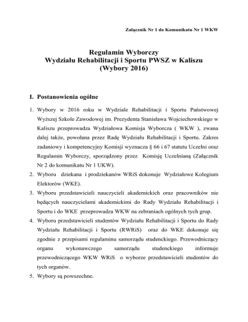 Załącznik Nr 1 do Komunikatu Nr 1 WKW Regulamin Wyborczy Wydziału Rehabilitacji i Sportu PWSZ w Kaliszu (Wybory 2016) I. Postanowienia ogólne 1. Wybory w 2016 roku w Wydziale Rehabilitacji i Sportu Państwowej Wyższej Szkole Zawodowej im. Prezydenta Stanisława Wojciechowskiego w Kaliszu przeprowadza Wydziałowa Komisja Wyborcza ( WKW ), zwana dalej także, powołana przez Radę Wydziału Rehabilitacji i Sportu. Zakres zadaniowy i kompetencyjny Komisji wyznacza § 66 i 67 statutu Uczelni oraz Regulamin Wyborczy, sporządzony przez Komisję Uczelnianą (Załącznik Nr 2 do komunikatu Nr 1 UKW). 2. Wyboru dziekana i prodziekanów WRiS dokonuje Wydziałowe Kolegium Elektorów (WKE). 3. Wyboru przedstawicieli nauczycieli akademickich oraz pracowników nie będących nauczycielami akademickimi do Rady Wydziału Rehabilitacji i Sportu i do WKE przeprowadza WKW na zebraniach ogólnych tych grup. 4. Wyboru przedstawicieli studentów Wydziału Rehabilitacji i Sportu do Rady Wydziału Rehabilitacji i Sportu (RWRiS) oraz do WKE dokonuje się zgodnie z przepisami regulaminu samorządu studenckiego. Przewodniczący organu wykonawczego samorządu studenckiego informuje przewodniczącego WKW WRiS o wyborze przedstawicieli studentów do tych organów. 5. Wybory są powszechne. 6. Czynne prawo wyborcze przysługuje nauczycielom akademickim, zatrudnionym w Wydziale Rehabilitacji i Sportu jako podstawowym i dodatkowym miejscu pracy, pracownikom niebędącym nauczycielami akademickimi, zatrudnionym w Wydziale Rehabilitacji i Sportu oraz studentom tego Wydziału. 7. Bierne prawo wyborcze przysługuje nauczycielom akademickim, zatrudnionym w Wydziale Rehabilitacji i Sportu jako podstawowym miejscu pracy (w pełnym wymiarze czasu pracy), którzy nie ukończyli sześćdziesiątego piątego roku życia, a w przypadku osób posiadających tytuł profesora- siedemdziesiątego nauczycielami akademickimi, roku życia, pracownikom niebędącym zatrudnionym w pełnym wymiarze czasu pracy oraz studentom. 8. Głosowanie w wyborach jest tajne i odbywa się poprzez osobiste oddanie głosu do urny, przy czym karty do głosowania winny zawierać nazwiska wszystkich kandydatów w porządku alfabetycznym, a wybór odbywa się poprzez postawienie znaku X przy nazwisku kandydata, na którego oddawany jest głos. W przypadku zgłoszenia tylko jednej kandydatury na miejsce jednomandatowe, karty wyborcze powinny zawierać do wyboru opcje: TAK i NIE. 9. Prawo zgłaszania kandydatów do RWRiS i WKE mają te osoby, które posiadają czynne prawo wyborcze w poszczególnych grupach pracowników i studentów Wydziału Rehabilitacji i Sportu. 10.Prawo zgłaszania kandydatów na dziekana mają elektorzy WKE. 11.Członkom WKW przysługuje tylko czynne prawo wyborcze. W przypadku zmiany statusu na bierne prawo wyborcze tracą mandat w WKW. 14.Wyborcom przysługuje prawo odwołania się od decyzji WKW w terminie 3 dni od dnia ogłoszenia decyzji. Organem odwoławczym jest Uczelniana Komisja Wyborcza. 15.WKW powołana jest na okres kadencji i funkcjonuje do dnia poprzedzającego powołanie nowej komisji. II. Zgłoszenie kandydatów do Wydziałowej Komisji Elektorów (WKE) oraz Rady Wydziału Rehabilitacji i Sportu (RWRiS) 1. Kandydować mogą osoby, którym przysługuje bierne prawo wyborcze. 2. Liczba kandydatów jest nieograniczona. 3. Zgłaszający kandydata winien podać jego nazwisko i imię, stopień naukowy i stanowisko zatrudnienia oraz pisemną zgodę kandydata. Zgłoszenie winno być czytelnie podpisane przez osobę zgłaszającą z podaniem swojego miejsca i stanowiska pracy. 4. Termin zgłaszania kandydatów do WKE RWRiS pracowników, będących nauczycielami akademickimi oraz pracownikami nie będącymi nauczycielami akademickimi odbywa się zgodnie z harmonogramem wyborczym. 5. Po upływie terminu zgłoszenia kandydatów WKW sporządza alfabetycznie listę kandydatów i po sprawdzeniu, czy kandydaci posiadają bierne prawo wyborcze, podaje przedmiotową listę do wiadomości zatrudnionym w Wydziale Rehabilitacji i Sportu oraz UKW. III. Wybór dziekana i prodziekana 1. Zgłoszenie wymaga pisemnej zgody kandydata na kandydowanie na funkcję dziekana i prodziekana. 2. Kandydatów na dziekana zgłaszają elektorzy wydziałowi spośród nauczycieli akademickich wydziału posiadających co najmniej stopień doktora. Warunkiem pełnienia funkcji dziekana jest zatrudnienie w uczelni, jako podstawowym miejscu pracy w wymiarze pełnego etatu. 3. Kandydatów na prodziekana spośród nauczycieli akademickich wydziału, posiadających co najmniej stopień naukowy doktora, zgłasza dziekan- elekt. Warunkiem pełnienia funkcji prodziekana jest zatrudnienie w uczelni, jako podstawowym miejscu pracy w wymiarze pełnego etatu. 4. WKW stwierdza dokonanie wyborów dziekana i prodziekana. IV. Wybory w Wydziale Rehabilitacji i Sportu 1. Wybory odbywają się w czasie i miejscu wyznaczonym przez WKW. 2. Czas i miejsce wyborów podaje się do wiadomości w takim terminie i w taki sposób, aby wyborca miał możliwość wzięcia udziału w wyborach. 3. W czasie wyborów konieczna jest obecność na sali przynajmniej połowy ilości członków komisji wyborczej, którzy czuwają nad porządkiem i zachowaniem tajności głosowania. V. Karty do głosowania 1. Drukowanie kart zarządza WKW. 2. Karty zadrukowane są jednostronnie. 3. W nagłówku pisze się „Wybór członka Wydziałowego Kolegium Elektorów Państwowej Wyższej Szkoły Zawodowej im. Prezydenta Stanisława Wojciechowskiego w Kaliszu”, „ Wybór Rady Wydziału Rehabilitacji i Sportu Państwowej Wyższej Szkoły Zawodowej im. Prezydenta Stanisława Wojciechowskiego w Kaliszu”, „Wybór dziekana ( prodziekana ) Wydziału Rehabilitacji i Sportu Państwowej Wyższej Szkoły Zawodowej im. Prezydenta Stanisława Wojciechowskiego w Kaliszu. 4. Karta stemplowana jest pieczątką Wydziału Rehabilitacji i Sportu i jest podpisana przez Przewodniczącego lub Wiceprzewodniczącego WKW. 5. Naz