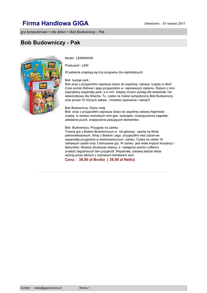 Firma Handlowa GIGA Utworzono : 07 marzec 2017 gry komputerowe > dla dzieci > Bob Budowniczy - Pak Bob Budowniczy - Pak Model : LEM000048 Producent : LEM W pakiecie znajdują się trzy programy dla najmłodszych: Bob buduje park : Bob wraz z przyjaciółmi zaprasza dzieci do wspólnej zabawy. Łopaty w dłoń! Czas pomóc Bobowi i jego przyjaciołom w najnowszym zadaniu. Razem z nimi zaprojektuj wspaniały park, a w nim między innymi wybieg dla wiewiórek i tor deskorolkowy dla Stracha. Tu czeka na Ciebie sympatyczny Bob Budowniczy oraz ponad 10 różnych zabaw, mnóstwo śpiewania i radości! Bob Budowniczy: Damy radę Bob wraz z przyjaciółmi zaprasza dzieci do wspólnej zabawy.Najmłodsi znajdą tu zestaw rozmaitych mini gier, wyścigów, rozwiązywania zagadek, układania puzzli, znajdywania pasujących elementów. Bob Budowniczy: Przygody na zamku Trzecia gra z Bobem Budowniczym w roli głównej - oparta na filmie pełnometrażowym. Wraz z Bobem i jego przyjaciółmi weź udział we wspaniałej przygodzie w średniowiecznym zamku. Czeka na ciebie 10 ciekawych zadań oraz 3 bonusowe gry. W zamku jest wiele krętych korytarzy i labiryntów. Możesz zbudować własny, a następnie pomóc Loftiemu znaleźć zagubionych tam przyjaciół. Wspaniałą zabawą będzie także wyścig przez labirynt z wybranym bohaterem serii. Cena : 39,90 zł Brutto ( 39,90 zł Netto) kontakt : - [email protected] Strona 1