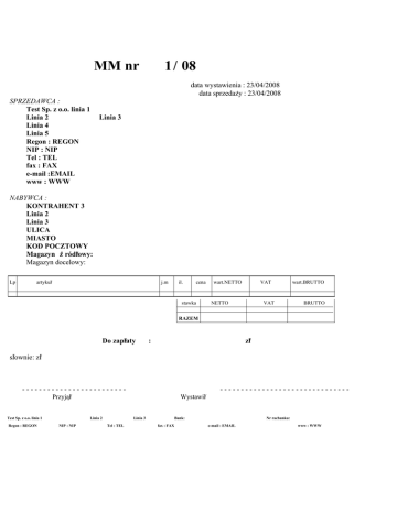 MM nr 1/ 08 data wystawienia : 23/04/2008 · : 23/04/2008 data sprzedazy SPRZEDAWCA : Test Sp. z o.o. linia 1 Linia 2 Linia 4 Linia 5 Regon : REGON NIP : NIP Tel : TEL fax : FAX e-mail :EMAIL www : WWW Linia 3 NABYWCA : KONTRAHENT 3 Linia 2 Linia 3 ULICA MIASTO KOD POCZTOWY / Magazyn z' ródlowy: Magazyn docelowy: Lp artykul/ j.m il. cena stawka wart.NETTO VAT NETTO VAT wart.BRUTTO BRUTTO RAZEM / Do zaplaty zl/ : / slownie: zl/ ------------------------- ------------------------------- Przyjal ¸/ Test Sp. z o.o. linia 1 Regon : REGON Wystawil/ Linia 2 NIP : NIP Linia 3 Tel : TEL Bank: fax : FAX Nr rachunku: e-mail : EMAIL www : WWW