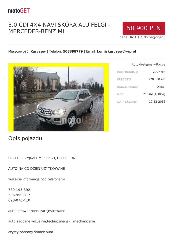 3.0 CDI 4X4 NAVI SKÓRA ALU FELGI MERCEDES-BENZ ML 50 900 PLN cena BRUTTO, do negocjacji Miejscowość: Karczew | Telefon: 508398779 | Email: [email protected] Auto dostępne w Polsce 2007 rok 270 000 km Diesel 218KM (160KW) 19-12-2016 Opis pojazdu PRZED PRZYJAZDEM PROSZĘ O TELEFON AUTO NA CO DZIEŃ UŻYTKOWANE wszelkie informacje pod telefonami: 789-195-392 506-959-317 698-076-410 auto sprowadzone, zarejestrowane auto zadbane wizualnie,technicznie jak i mechanicznie czysty zadbany środek auta Auto w stanie Bardzo zadbanym DODATKOWE WYPOSAŻENIE: -WSPOMAGANIE -KLIMATYZACJA -ABS -CENT.ZAMEK -ELEK.SZYBY -ELEK.LUSTERKA -6 X POD.POW. -ESP -TEMPOMAT -ALU-FELGI 2 X LATO + ZIMA -PODG. LUSTERKA -KOMPUTER -SKÓRA -AUTOMAT -KIER. MULTIMEDIALNA -RADIO CD/MP3/DVD -CZUJNIK ZMIERZCHU -4x4 -NAVIGACJA DUŻA KOLOROWA -PRZYCIEMNIANE SZYBY -ZESTAW GŁOŚNOMÓWIĄCY zapraszamy do oglądania oraz jazdę próbną jeżeli masz jakieś pytania nie wahaj się ani chwili dzwoń kupujący zwolniony z opłaty skarbowej Niniejsze ogłoszenie jest wyłącznie informacją handlową i nie stanowi oferty w myśl art. 66, § 1. Kodeksu Cywilnego. Sprzedający nie odpowiada za ewentualne błędy lub nieaktualność ogłoszenia. ZAPIS TEN ZOSTAŁ ZAWARTY ZE WZGLĘDU NA MOŻLIWOŚĆ DROBNYCH, LUDZKICH POMYŁEK.