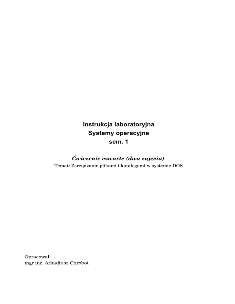 Instrukcja laboratoryjna Systemy operacyjne sem. 1 Ćwiczenie czwarte (dwa zajęcia) Temat: Zarządzanie plikami i katalogami w systemie DOS Opracował: mgr inż. Arkadiusz Chrobot 1. Wstęp Informacje zgromadzone w pamięci głównej systemu komputerowego są ulotne, tzn. po wyłączeniu zasilania ulegają zniszczeniu. Istotne dane, które chcemy zachować powinny być umieszczane w innej pamięci, pozwalającej przechowywać je w sposób trwały. Taką pamięcią jest pamięć masowa. Jest ona zrealizowana w postaci urządzeń fizycznych, które różnią się zarówno budową, jak i sposobem obsługi (np. dyski optyczne, dyski magnetyczne, pamięci EEPROM, taśmy magnetyczne). Ważnym jest, aby informacje przechowywane na tych urządzeniach były osiągalne w ten sam sposób dla procesów użytkownika, dlatego w systemach operacyjnych zdefiniowany jest abstrakcyjny typ danych nazywany plikiem lub zbiorem (ang. file). Pliki mogą być przechowywane zarówno w pamięci głównej, jaki i w pamięci masowej. W zależności od woli ich twórcy mogą przechowywać dane w ściśle określony sposób, lub mogą mieć swobodną strukturę. Pod względem sposobu dostępu dzielimy pliki na sekwencyjne i o dostępie swobodnym. Zbiory mogą być powiązane z urządzeniami wejścia – wyjścia i służyć do komunikacji z nimi. Ponieważ w systemie może istnieć duża ilość plików, konieczny jest jakiś sposób ich porządkowania. Rozwiązania tego problemu dostarczają katalogi. Katalog jest specjalnym zbiorem, którego zadaniem jest przechowywanie informacji o innych plikach. System DOS dostarcza dwóch rodzajów obsługi plików. Pierwszy z nich jest zaszłością z systemu CP/M i bazuje na blokach opisu pliku, drugi – częściej wykorzystywany, jest oparty o tzw. uchwyty. Funkcje systemowe dotyczące obsługi plików, to między innymi: otwieranie, pisanie, czytanie, zmiana położenia wskaźnika i zamykanie pliku. Podobnie jak większość współczesnych systemów operacyjnych DOS pozwala posługiwać się katalogami, które są zorganizowane w postaci drzewa. Pierwsza pozycja katalogu jest dowiązaniem do samego siebie (.). Druga jest dowiązaniem do katalogu znajdującego się wyżej w hierarchii (..). Kolejne opisują pliki należące do danego katalogu. Podobnie jak w przypadku plików istnieją w systemie funkcje związane z obsługą katalogów: zakładanie katalogu, usuwanie katalogu, zmiana katalogu roboczego, odnajdywanie pierwszej pozycji w katalogu (ang. find first), odnajdywanie kolejnej pozycji w katalogu (ang. find next), itp. Więcej informacji w książce „DOS 5 od środka” , rozdział 10. 2. Zadania Na pierwszych zajęciach należy wykonać w całości zadanie 1 i rozpocząć realizację zadania 2. Rozwiązując zadanie 2 można wstępnie napisać program w Pascalu używając procedur FindFirst i FindNext, a potem napisać własne 2 wersje tych procedur, które będą wywoływać funkcje systemowe. W obu programach należy pamiętać o obsłudze wyjątków, które mogą zwrócić wywołania systemowe. 1. [2 punktów] Napisz program, który wyświetli na ekranie i zapisze do stworzonego przez siebie pliku zawartość innego pliku tekstowego. 2. [8 punktów] Napisz program, który wyświetli rekurencyjnie pliki i katalogi poczynając od bieżącego katalogu.1 1 Proszę przypomnieć sobie informacje na temat podprogramów rekurencyjnych, drzew i metod przeszukiwania drzew oraz grafów. 3
