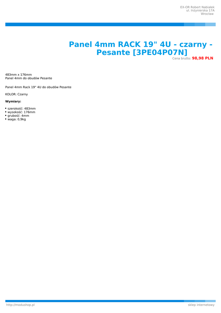 EX-OR Robert Nabiałek ul. Inżynierska 17A Wrocław Panel 4mm RACK 19" 4U - czarny Pesante [3PE04P07N] Cena brutto: 98,98 PLN 483mm x 176mm Panel 4mm do obudów Pesante Panel 4mm Rack 19" 4U do obudów Pesante KOLOR: Czarny Wymiary: szerokość: 483mm wysokość: 176mm grubość: 4mm waga: 0,9kg http://modushop.pl sklep internetowy