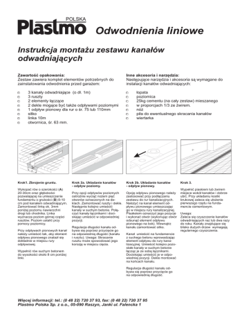 Odwodnienia liniowe Instrukcja monta¿u zestawu kana³ów odwadniaj¹cych Zawartoœæ opakowania: Zestaw zawiera komplet elementów potrzebnych do zainstalowania odwodnienia przed gara¿em: Inne akcesoria i narzêdzia: Nastêpuj¹ce narzêdzia i akcesoria s¹ wymagane do instalacji kana³ów odwadniaj¹cych: 0 0 0 0 0 0 0 0 0 0 0 0 0 0 0 3 kana³y odwadniaj¹ce (o d³. 1m) 3 ruszty 2 elementy ³¹cz¹ce 2 dekle mog¹ce byæ tak¿e odp³ywami poziomymi 1 odp³yw pionowy dla rur o œr. 75 lub 110mm sitko linka 10m otwornica, œr. 63 mm. ³opata poziomica 25kg cementu (na ca³y zestaw) mieszanego w proporcjach 1/3 ze ¿wirem. nó¿ pi³a do ewentualnego skracania kana³ów wiertarka B A Krok1. Zbrojenie gruntu. Wykopaæ rów o szerokoœci (A) 20-30cm oraz g³êbokoœci pozwalaj¹cej na umieszczenie fundamentu o gruboœci (B) 8-10 cm pod kana³em odwadniaj¹cym. Zamontowaæ linkê ok. 3mm poni¿ej poziomu nawierzchni drogi lub chodnika. Linka wyznacza poziom górnej czêœci rusztów. Poziom ustaliæ przy pomocy poziomicy. Przy odp³ywach pionowych kana³ nale¿y umieœciæ tak, aby element odp³ywu pionowego znalaz³ siê dok³adnie w miejscu rury odp³ywowej. Wype³niæ rów suchym betonem do wysokoœci oko³o 8 cm poni¿ej linki. Krok 2a. Uk³adanie kana³ów - odp³yw poziomy. Krok 2b. Uk³adanie kana³ów - odp³yw pionowy. Przy opcji odp³ywów poziomych ostro¿nie wyci¹æ no¿em piêæ otworów oznaczonych na deklach. Zamontowaæ ruszty i dekle. Nastêpnie kolejno umieœciæ kana³y w suchym betonie. Po³¹czyæ kana³y ³¹cznikami i dociskaj¹c umieœciæ w odpowiedniej pozycji. Opcjê odp³ywu pionowego nale¿y zastosowaæ przy pod³¹czaniu zestawu do rur kanalizacyjnych. Na³o¿yæ na kana³ element odp³ywu pionowego umieszczaj¹c go w miejscu rury kanalizacyjnej. Pisakeiem oznaczyæ jego pozycje i wykonaæ otwór (wykonuj¹c otwór odsun¹æ element odp³ywu pionowego na bok). Wewn¹trz kana³u zamontowaæ sitko. Regulacja d³ugoœci kana³u odbywa siê poprzez przyciêcie go na odpowiedni¹ d³ugoœæ (kana³u i rusztu). Uwaga: Skracanie rusztu mo¿e spowodowaæ jego korozjê w miejscu ciêcia. Kana³ umieœciæ na fundamencie z suchego betonu wprowadzaj¹c element odp³ywu do rury kanalizacyjnej. Umieœciæ kolejno pozosta³e kana³y w suchym betonie ³¹cz¹c je ze sob¹ ³¹cznikami. Dociskaj¹c umieœciæ je w odpowiedniej pozycji. Dekle montowaæ na koñcach kana³u. Regulacja d³ugoœci kana³u odbywa siê poprzez przyciêcie go na odpowiedni¹ d³ugoœæ. Wiêcej informacji: tel.: (0 48 22) 720 37 93, fax: (0 48 22) 720 37 95 Plastmo Polska Sp. z o.o., 05-090 Raszyn, Janki ul. Falencka 1 Krok 3. Wype³niæ piaskiem lub ¿wirem miejsce wokó³ kana³ów i dobrze ubiæ. Przy uk³adaniu kostki brukowej zaleca siê u³o¿enie pierwszego rzêdu na fundamencie cementowym. Uwaga: Zaleca siê czyszczenie kana³ów odwadniaj¹cych raz lub dwa razy do roku. Kana³y znajduj¹ce siê blisko du¿ych drzew wymagaj¹ regularnego czyszczenia.