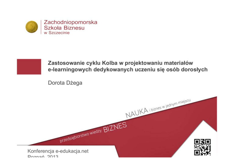 Zastosowanie cyklu Kolba w projektowaniu materiałów e-learningowych dedykowanych uczeniu się osób dorosłych Dorota Dżega Konferencja e-edukacja.net Poznań 2013 Otwierając dorosłe umysły, nie przeciążaj ich. Włóż tam tylko iskrę. Anatole France Ucz i projektuj 9 9 9 9 9 od łatwego do trudnego od prostego do złożonego od ogółu do szczegółu od znanego do nieznanego od przykładów do abstrakcji Zasady zaczerpnięte z bloga Piotra Peszko, 2edu.pl Obudź w sobie eduNinję 1 Cykl Kolba w projektowaniu materiałów e-learningowych – czy to możliwe? Jeden problem przedstawiony w różnych sytuacjach, różne sytuacje rozwiązania tego samego problemu DOŚWIADCZENIE Case study 1 Case study 2 Case study n REFLEKSJA Wizualizacja sytuacji 1 Wizualizacja sytuacji 2 Wizualizacja sytuacji n Aspekty teoretyczne NOWA WIEDZA ZASTOSOWANIE NOWEJ WIEDZY W PRAKTYCE Zestaw pytań samosprawdzających (pytania, zadania, fakty, dane itp.) P1 P2 P3 Pn 2 Jak to wygląda po implementacji? Krok 1 Krok 3 Krok 2 3 Jak to wygląda po implementacji? Krok 4 Pigułki kompetencji Krok 5 4 Czy to działa? Weź pigułkę i przekonaj się Dziękuję za uwagę Dorota Dżega [email protected] 5