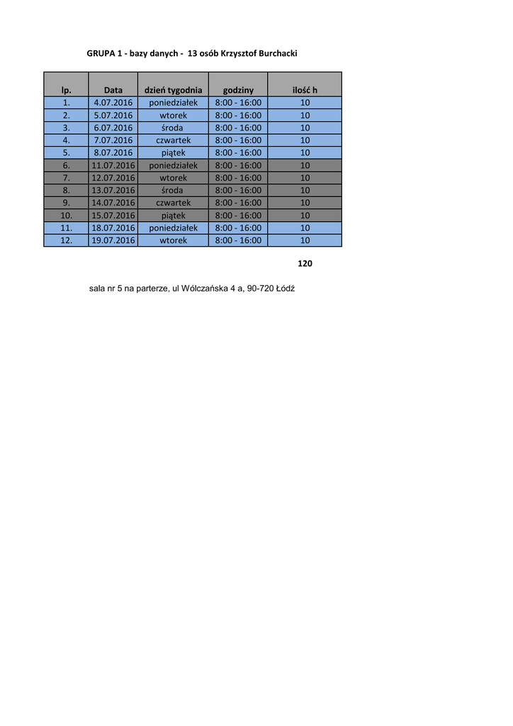 GRUPA 1 - azy dany h - 13 osó Krzysztof Bur ha ki lp. 1. 2. 3. 4. 5. 6. 7. 8. 9. 10. 11. 12. Data dzień tygodnia 4.07.2016 poniedziałek 5.07.2016 wtorek 6.07.2016 środa 7.07.2016 czwartek 8.07.2016 piątek 11.07.2016 poniedziałek 12.07.2016 wtorek 13.07.2016 środa 14.07.2016 czwartek 15.07.2016 piątek 18.07.2016 poniedziałek 19.07.2016 wtorek godziny 8:00 - 16:00 8:00 - 16:00 8:00 - 16:00 8:00 - 16:00 8:00 - 16:00 8:00 - 16:00 8:00 - 16:00 8:00 - 16:00 8:00 - 16:00 8:00 - 16:00 8:00 - 16:00 8:00 - 16:00 ilość h 10 10 10 10 10 10 10 10 10 10 10 10 120 sala nr 5 na parterze, ul Wólczańska 4 a, 90-720 Łódź